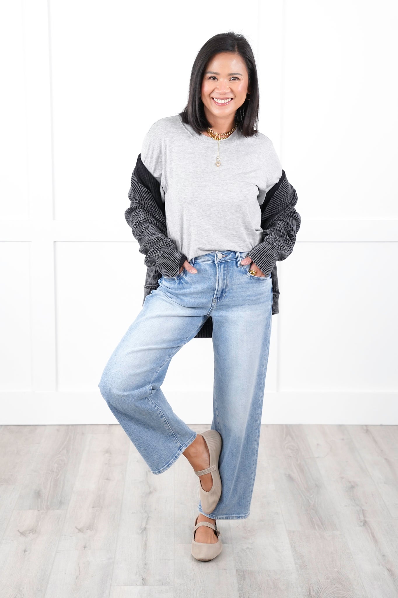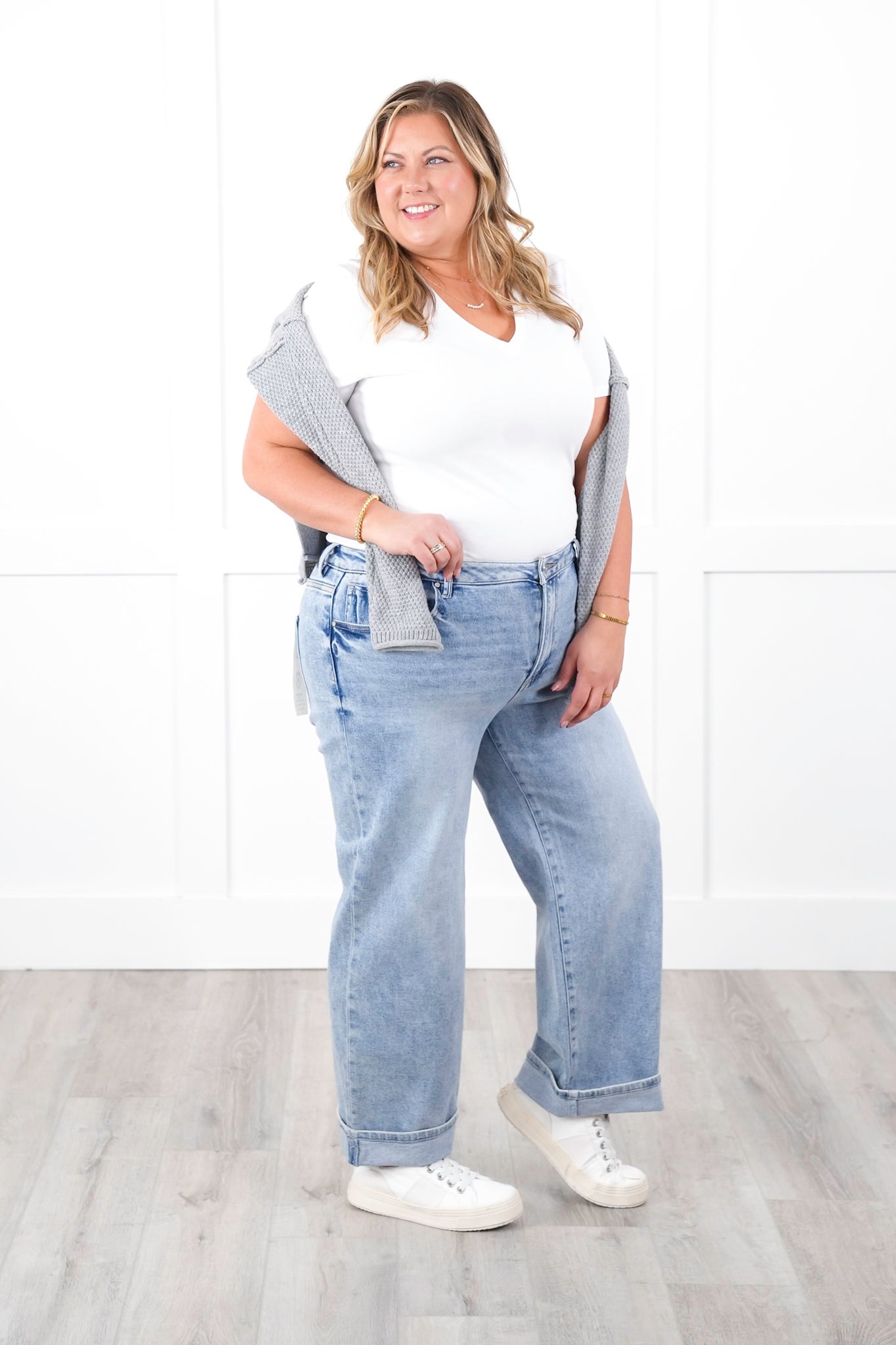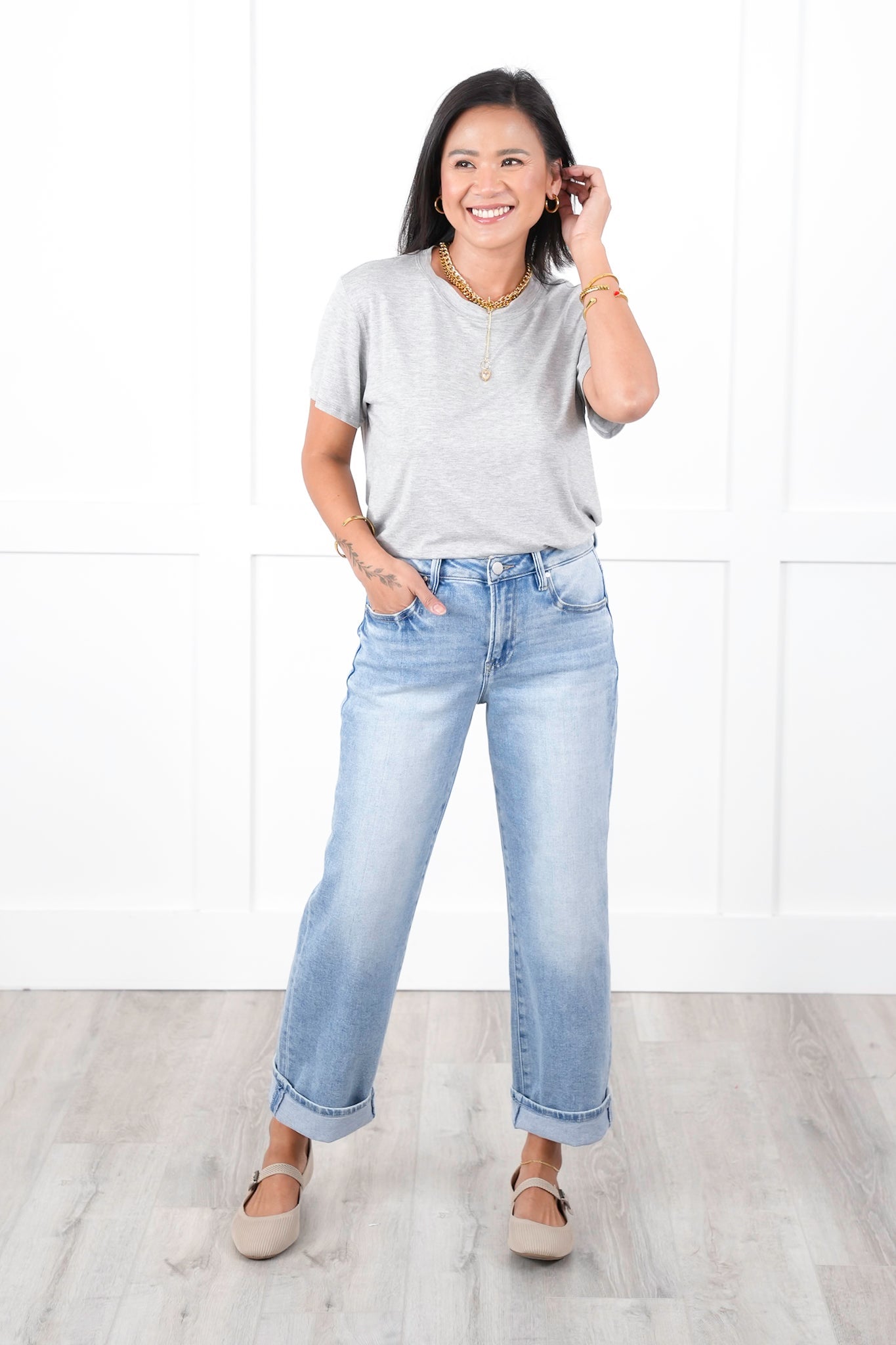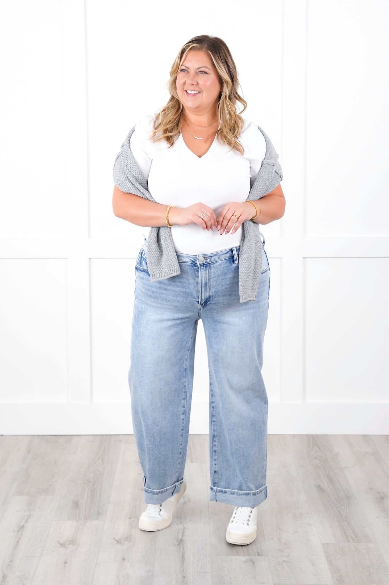 These jeans are what happens when laid-back meets polished. The Risen barrel jeans feature a fresh light wash, a flattering high rise, and a cuffed ankle that’s just waiting to be shown off with sneakers, clogs, or sandals. They're the kind of denim that looks effortlessly cool with a slouchy tee or can be elevated with a structured blazer and loafers.