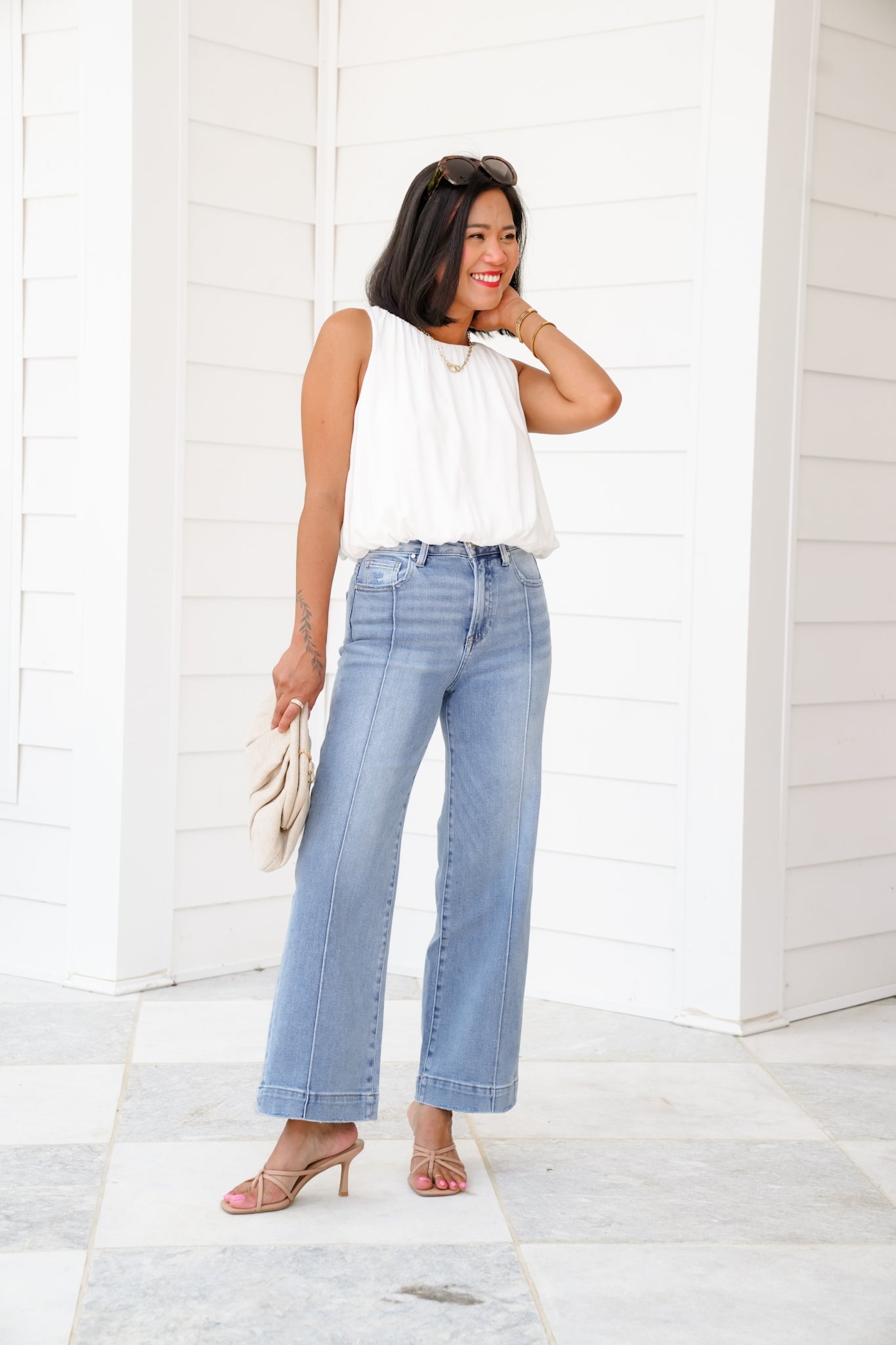 Get ready to fall in love with these dreamy light wash jeans! The Risen High Rise Cropped Wide Leg Jeans bring that laid-back vintage vibe with a modern twist. Featuring a flattering pintuck front seam that lengthens your legs and a breezy wide leg cut, these are the jeans you’ll reach for again and again. Try them with a fitted tank and wedges for brunch or toss on a graphic tee and sneakers for errands around town.