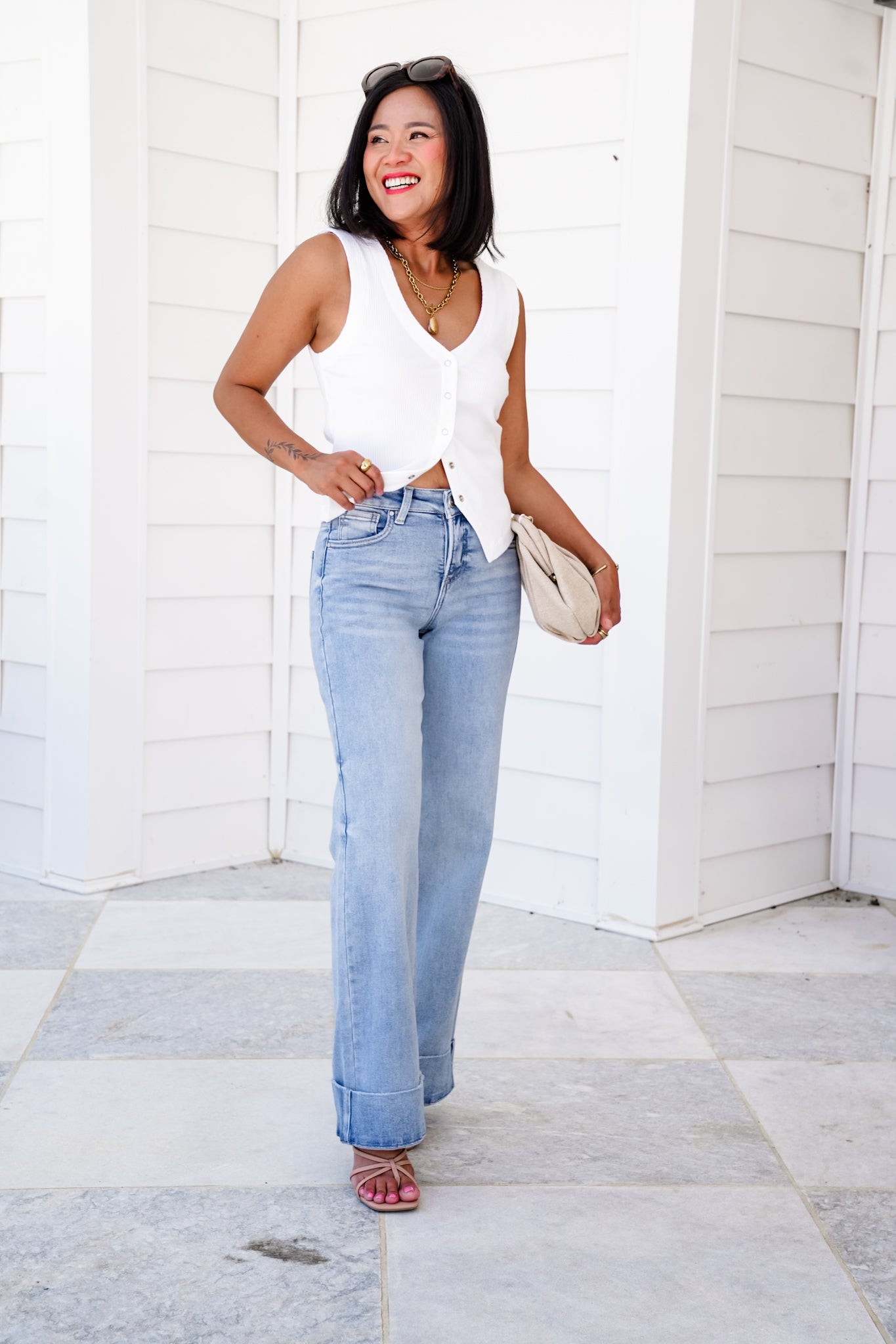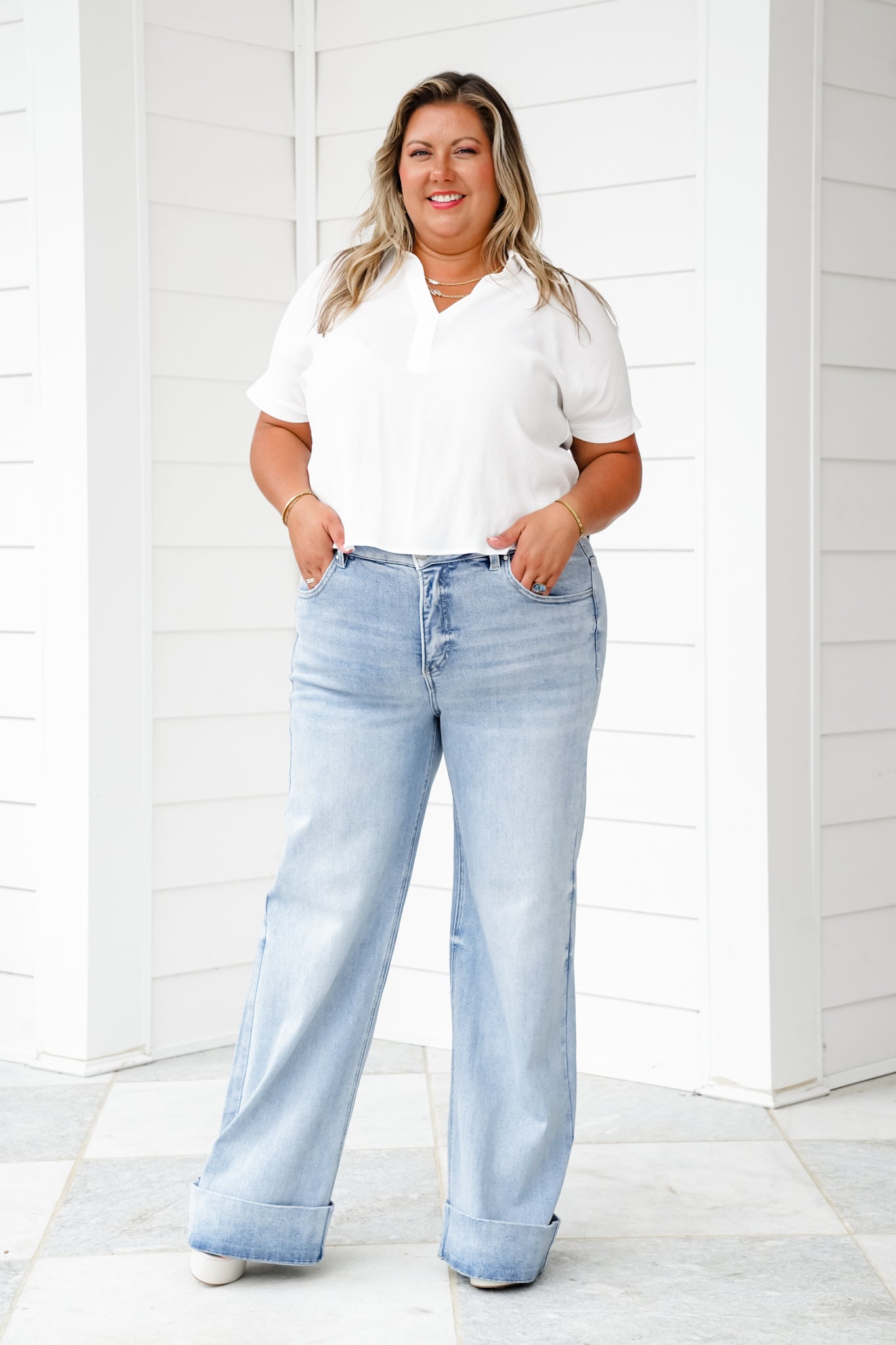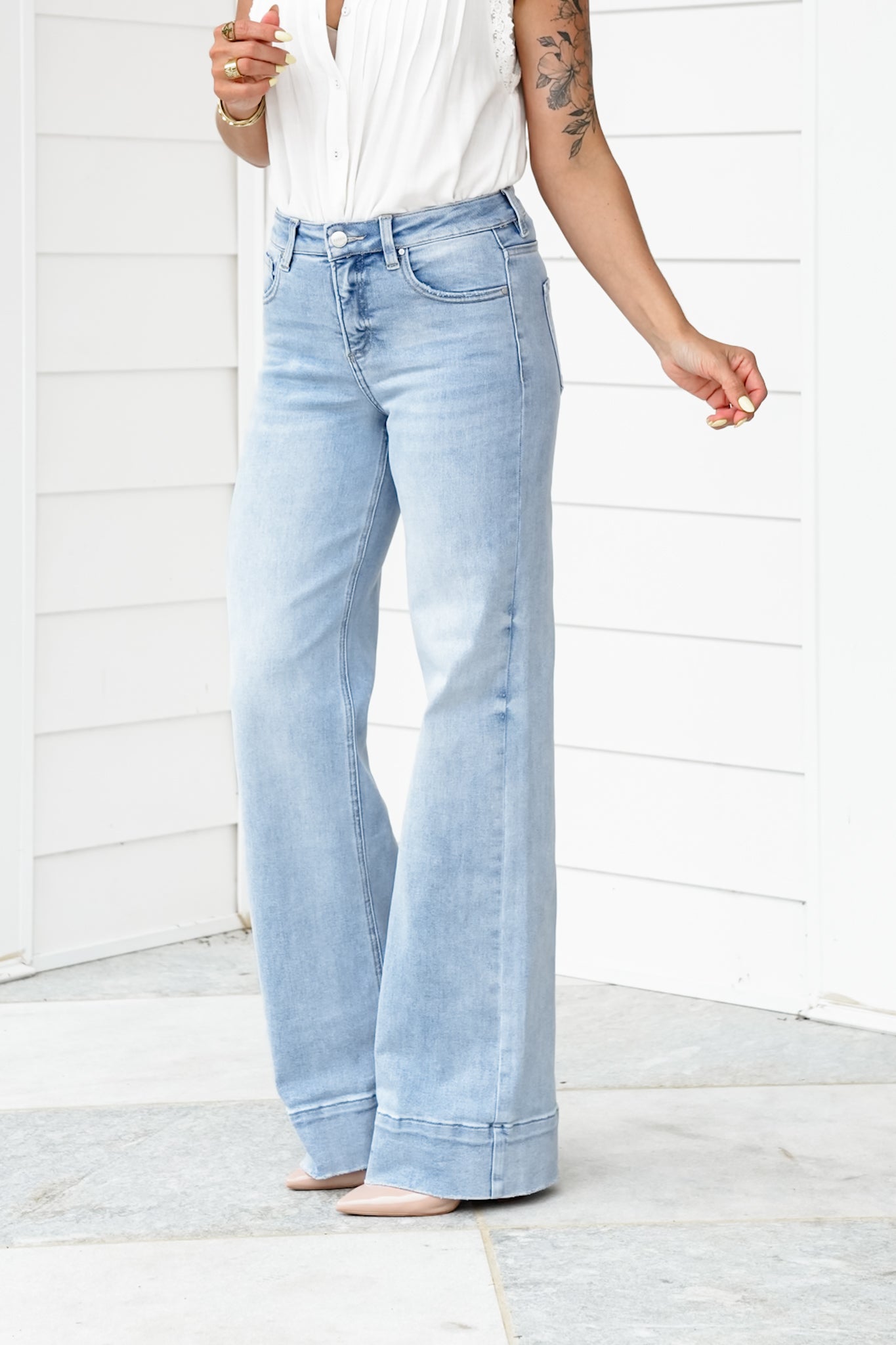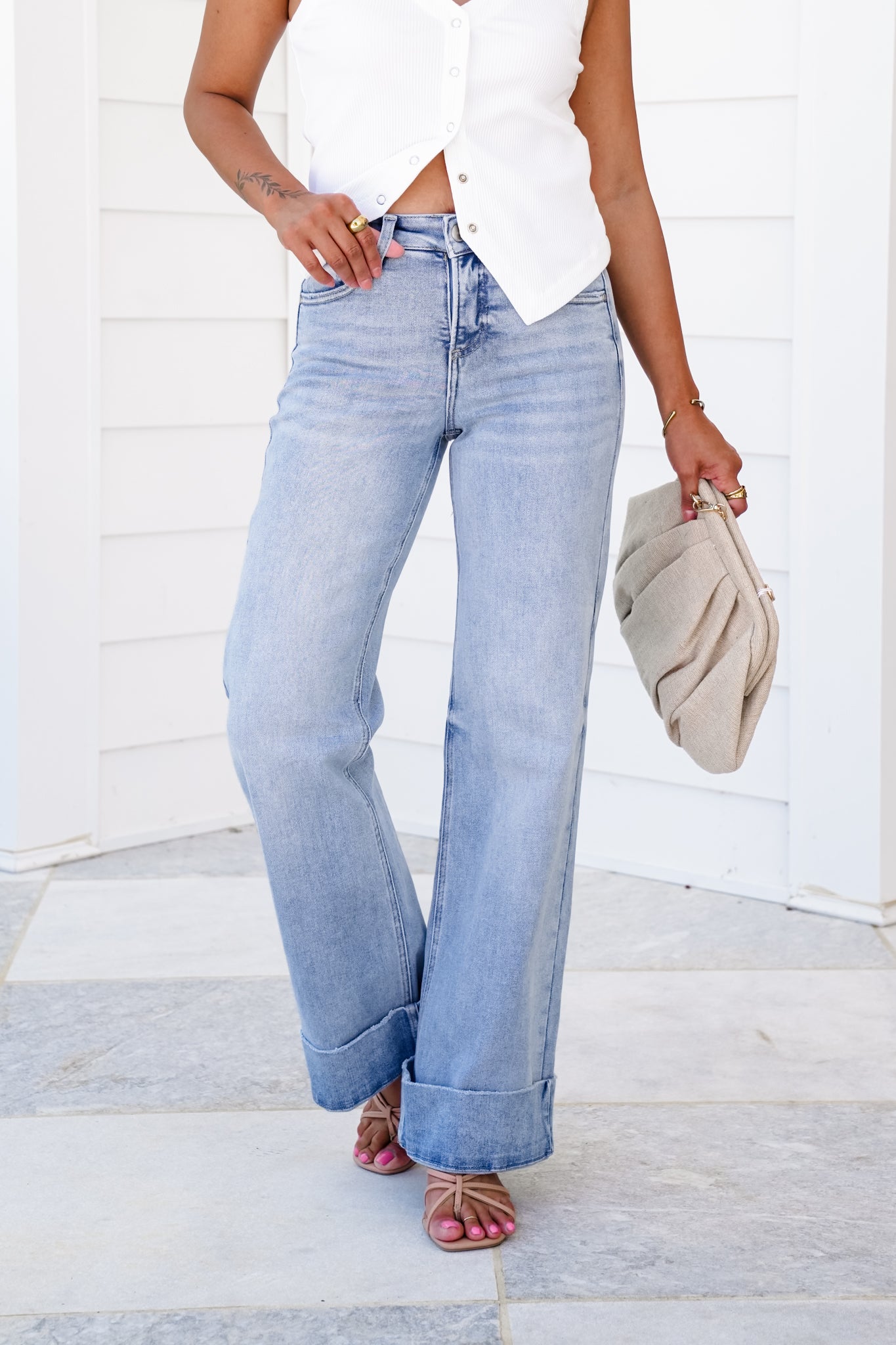 Risen High Rise Light Wash Tummy Control Cuffed Wide Leg Jeans