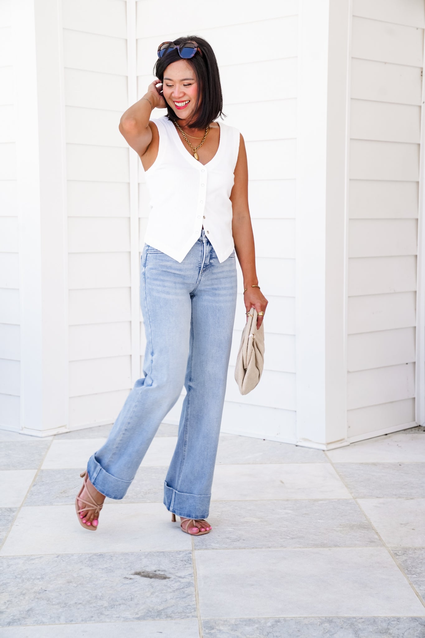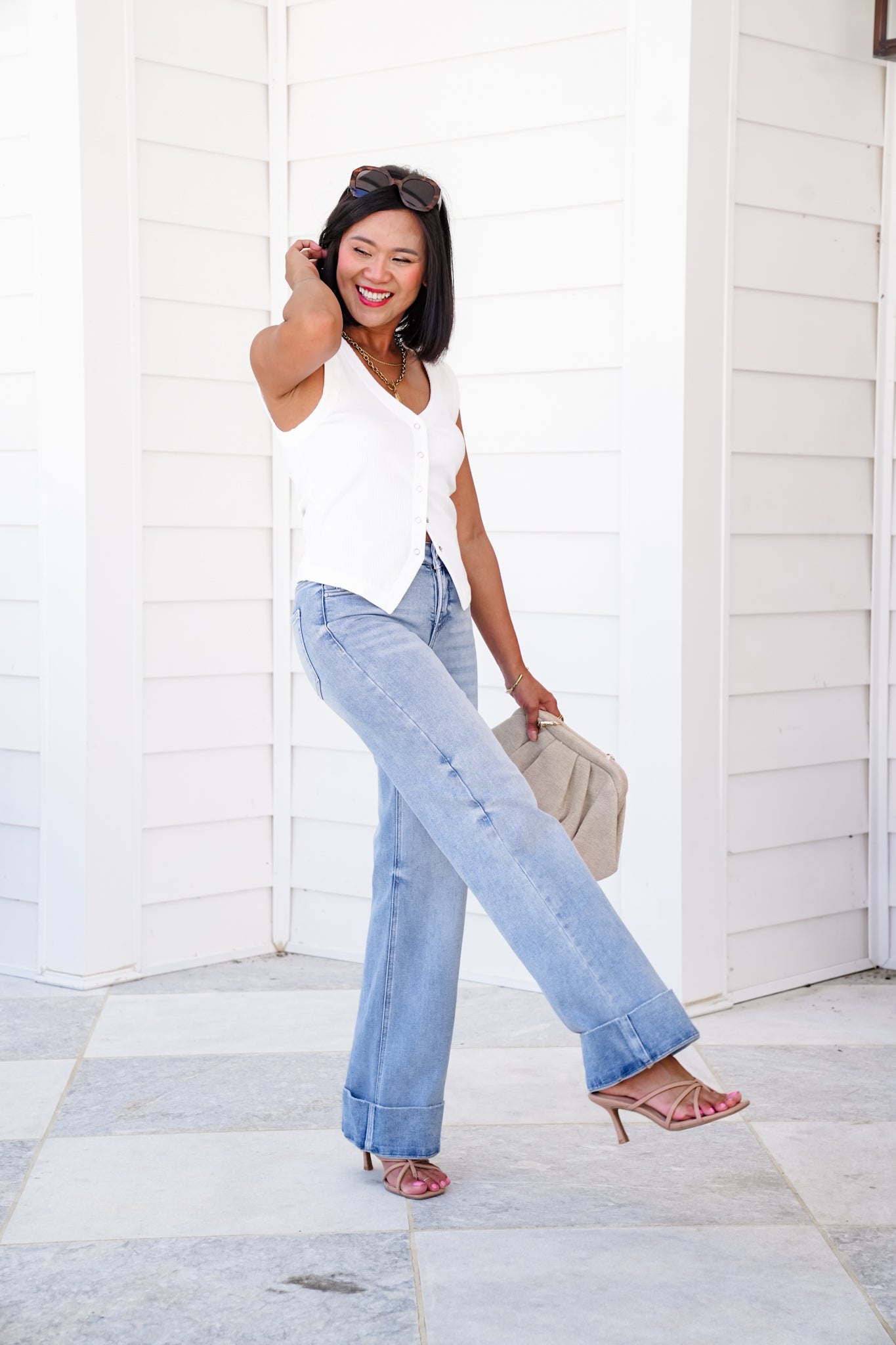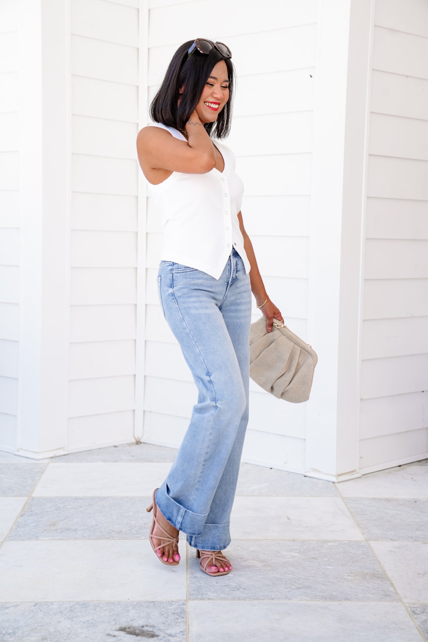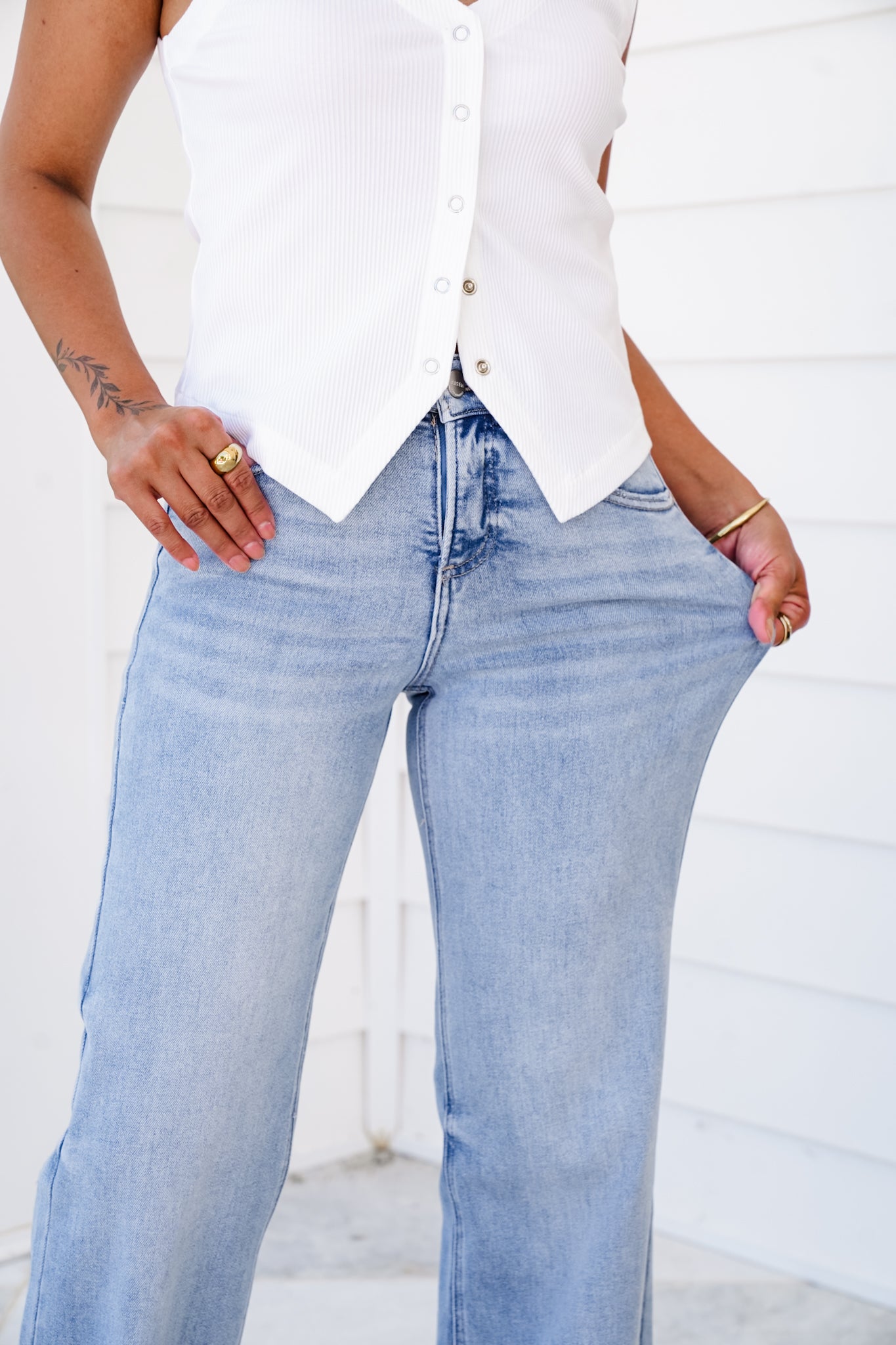 Risen High Rise Light Wash Tummy Control Cuffed Wide Leg Jeans