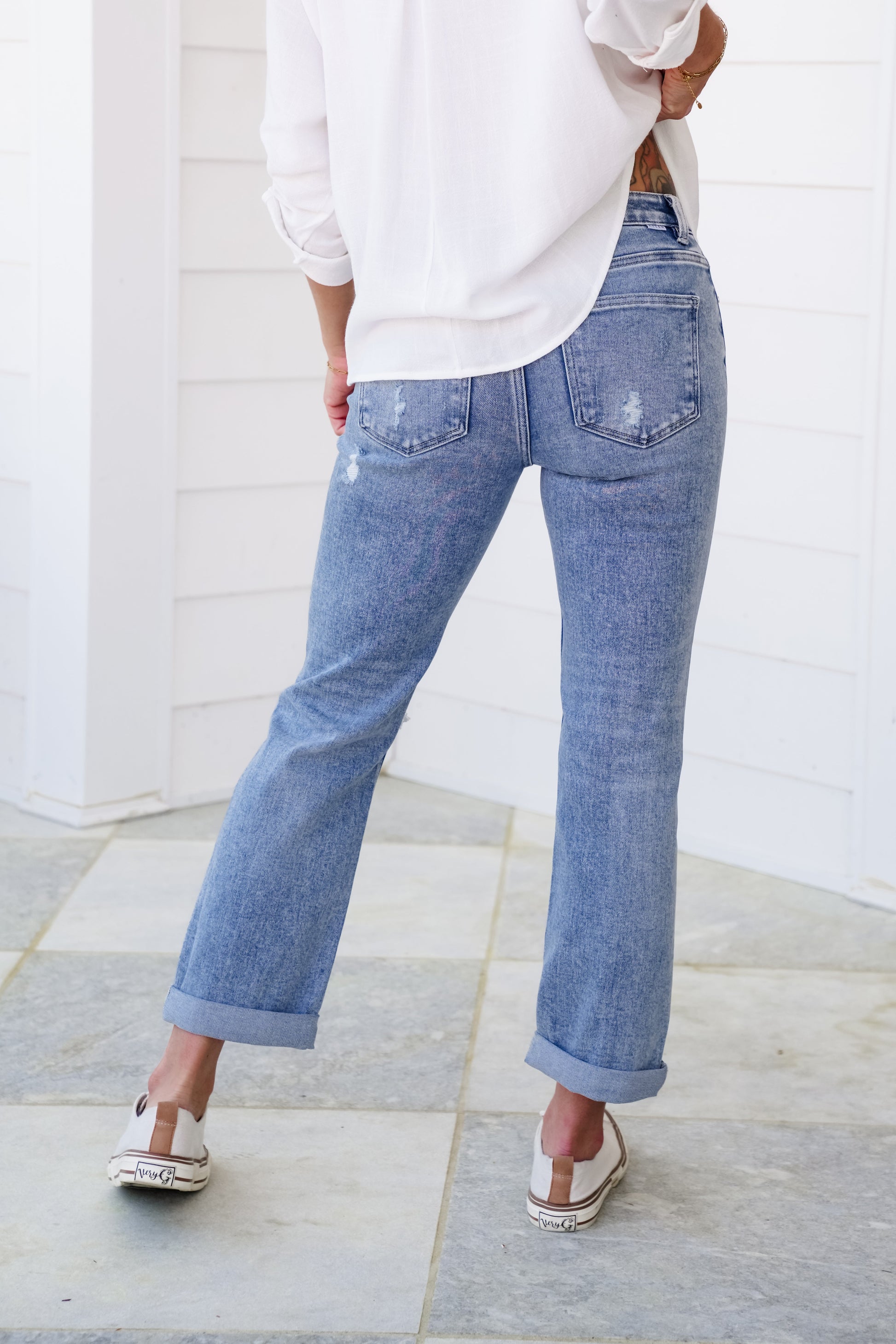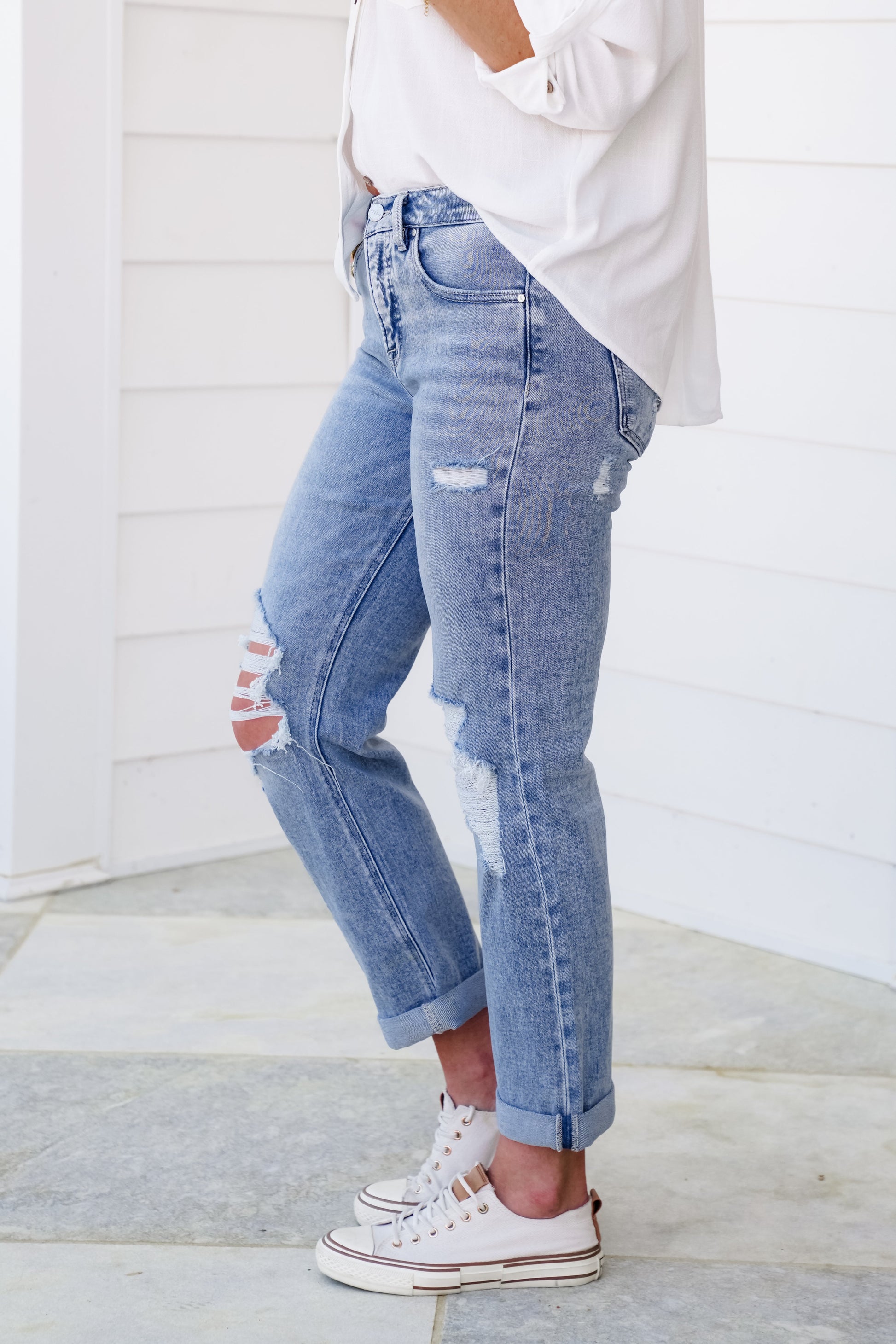 These Risen high-rise distressed jeans are the perfect combination of comfort, style, and a little bit of edge. They have tummy control, a gorgeous light wash, and classic distressing. The double-rolled hem is a cute touch. You can unroll them if you prefer more length. These will keep you feeling confident and looking fantastic all day long!