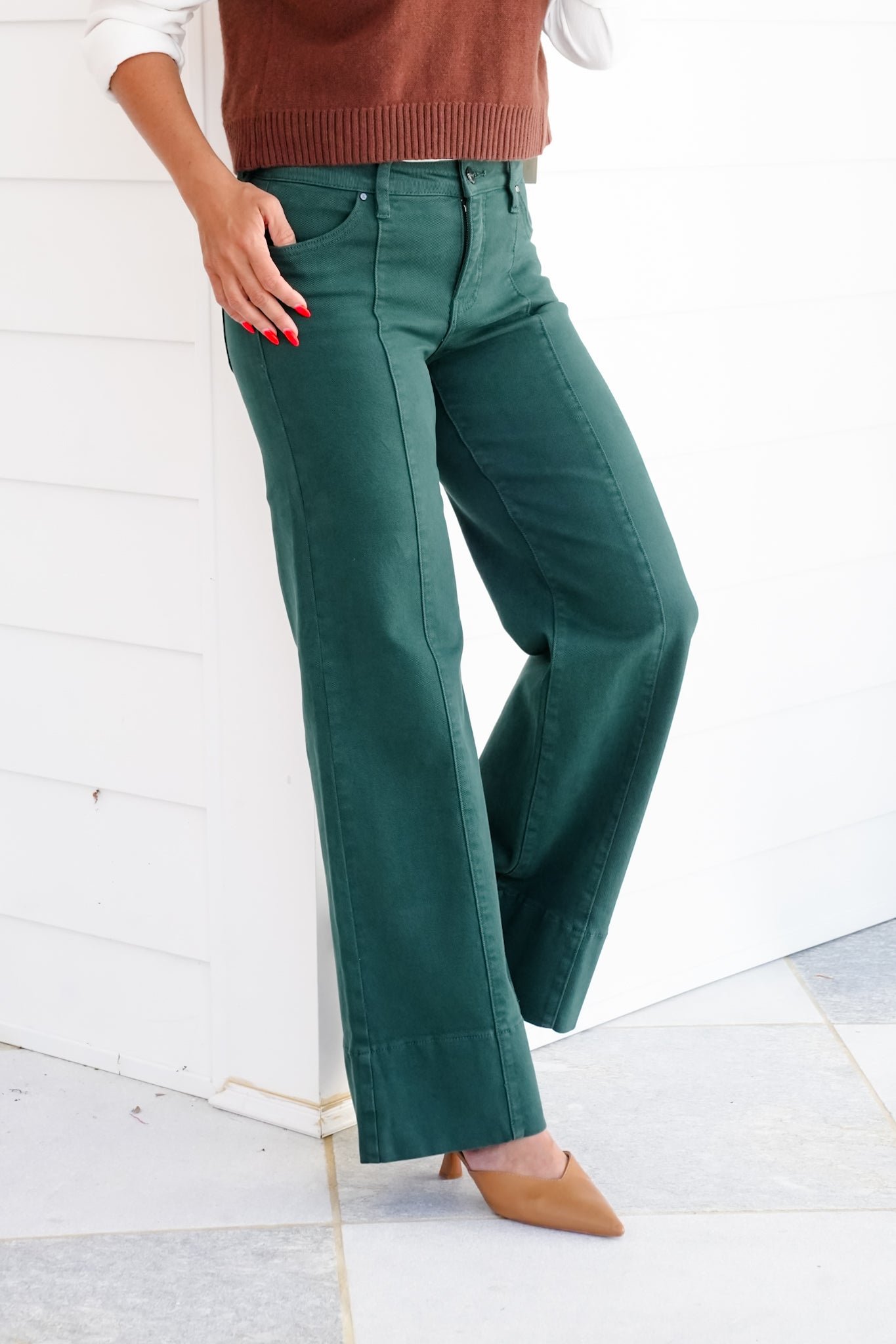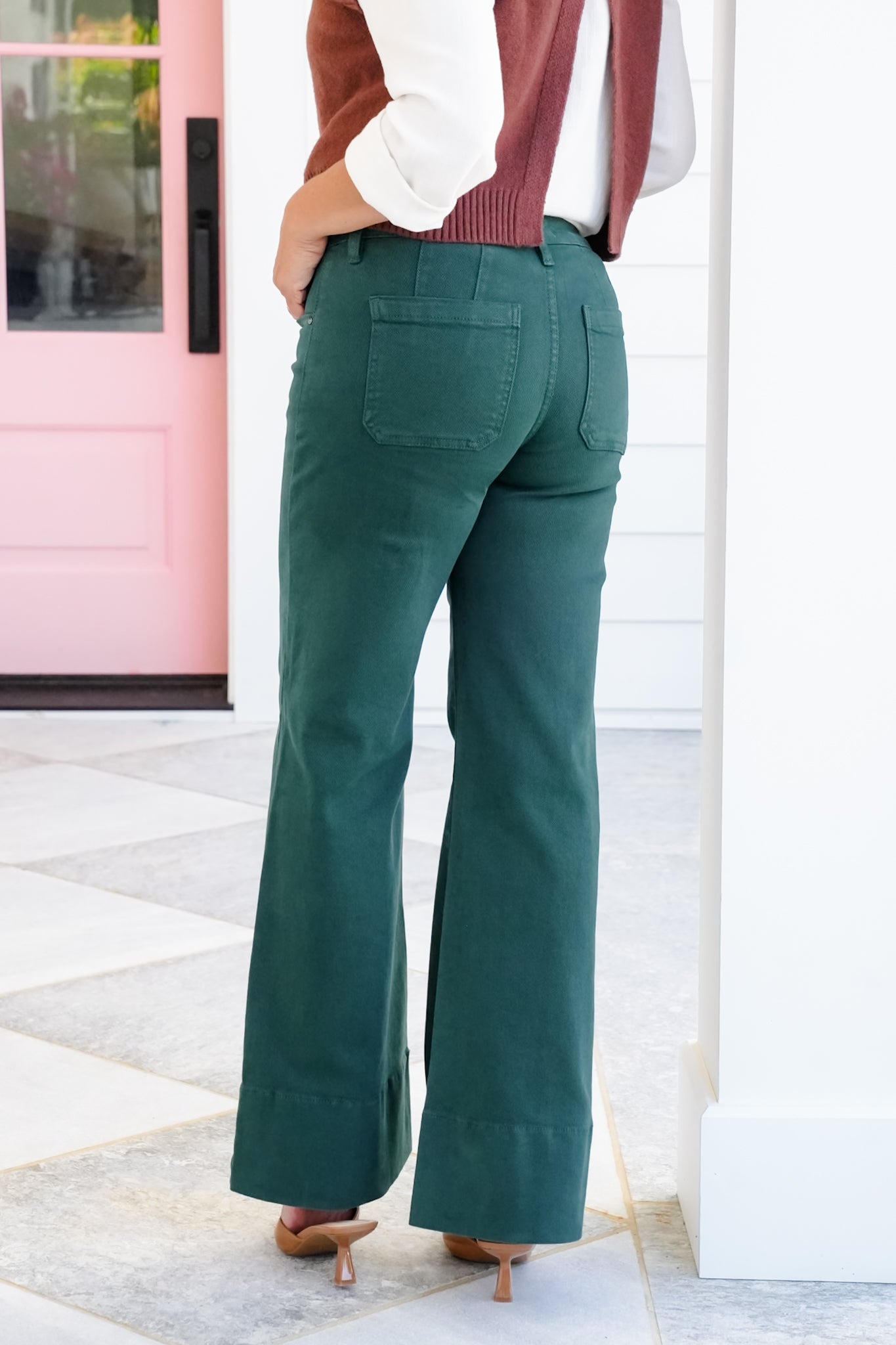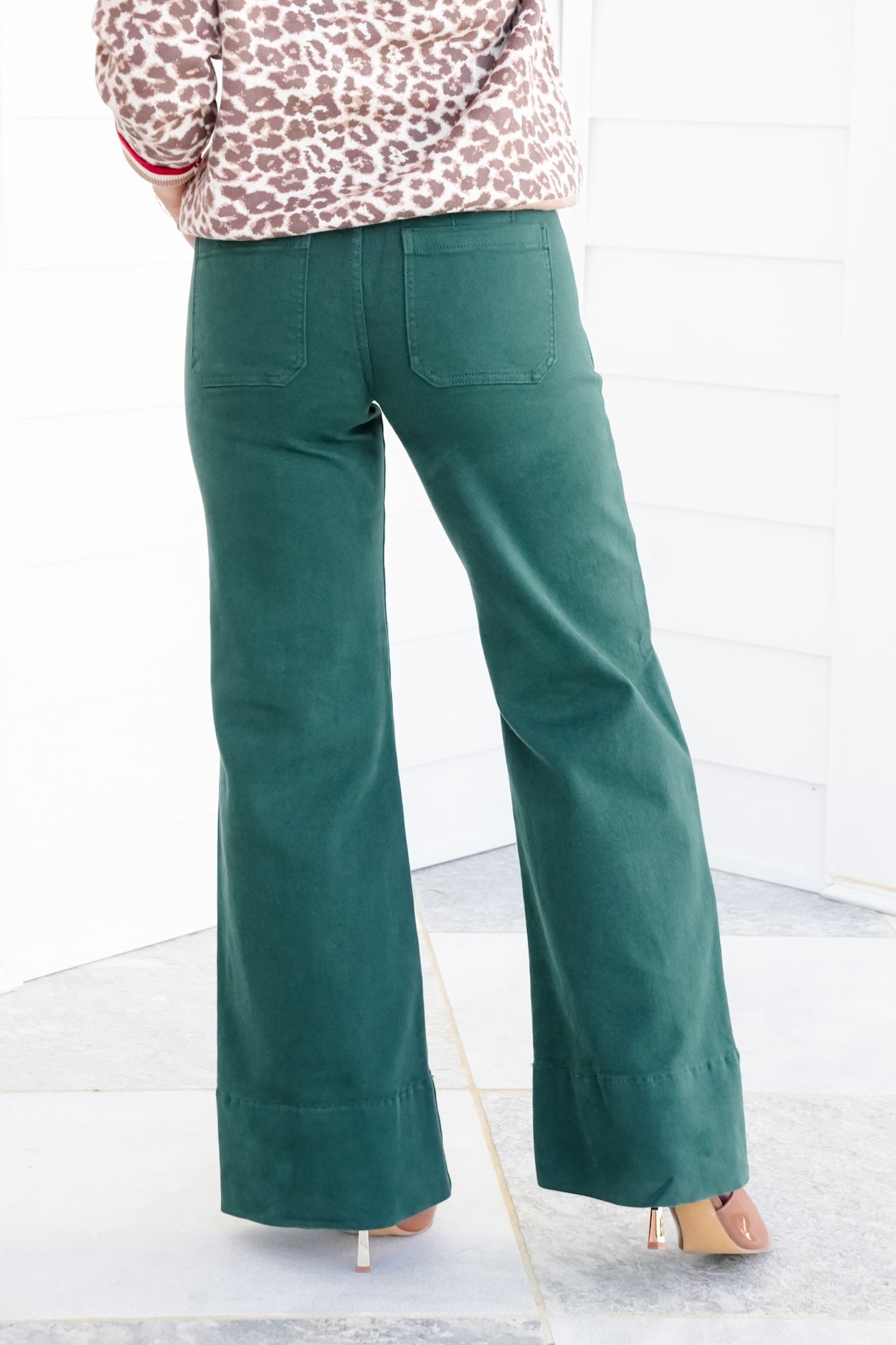 Risen Mid Rise Green Tummy Control Wide Leg Jeans with Large Wide Hem