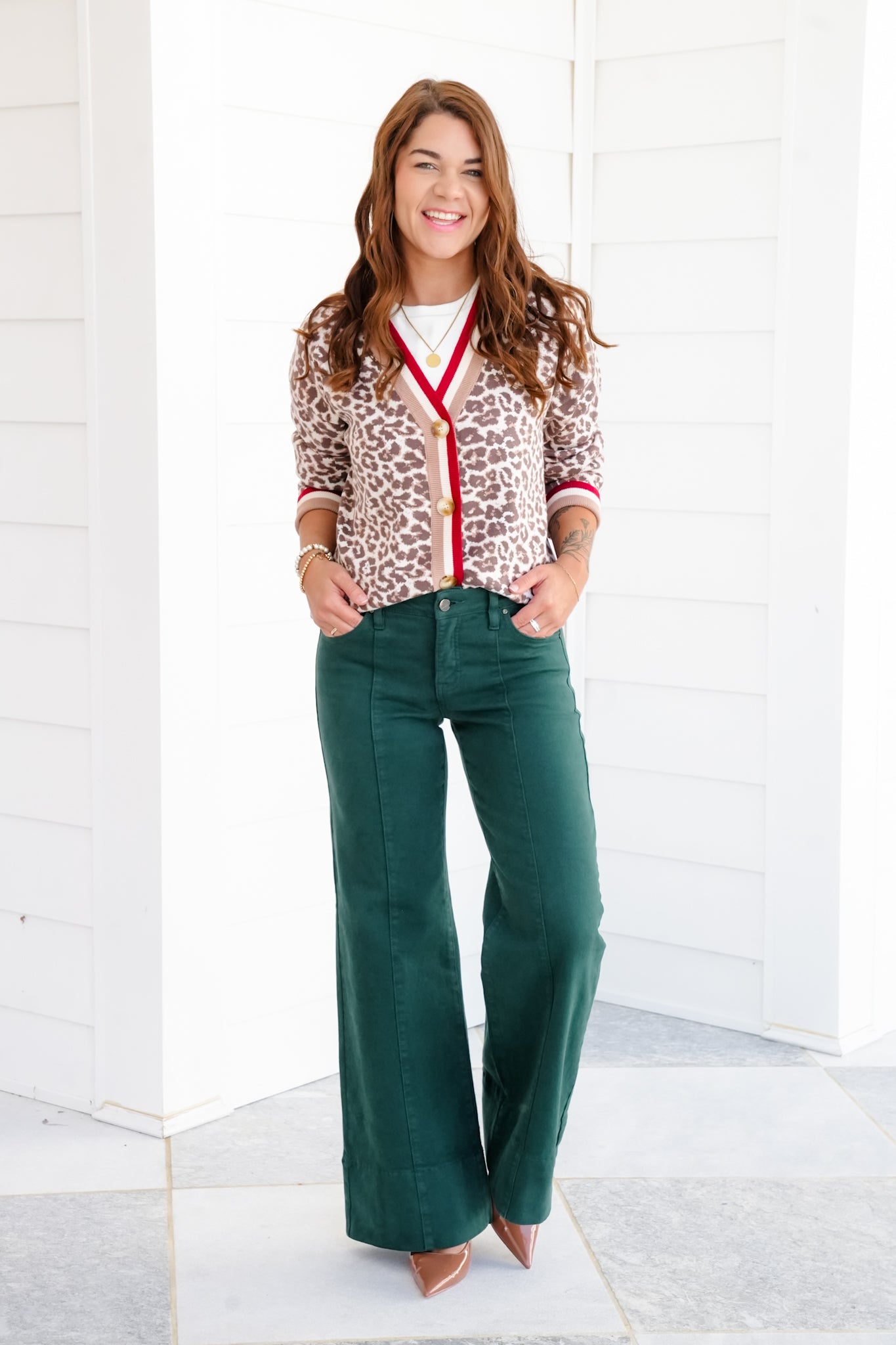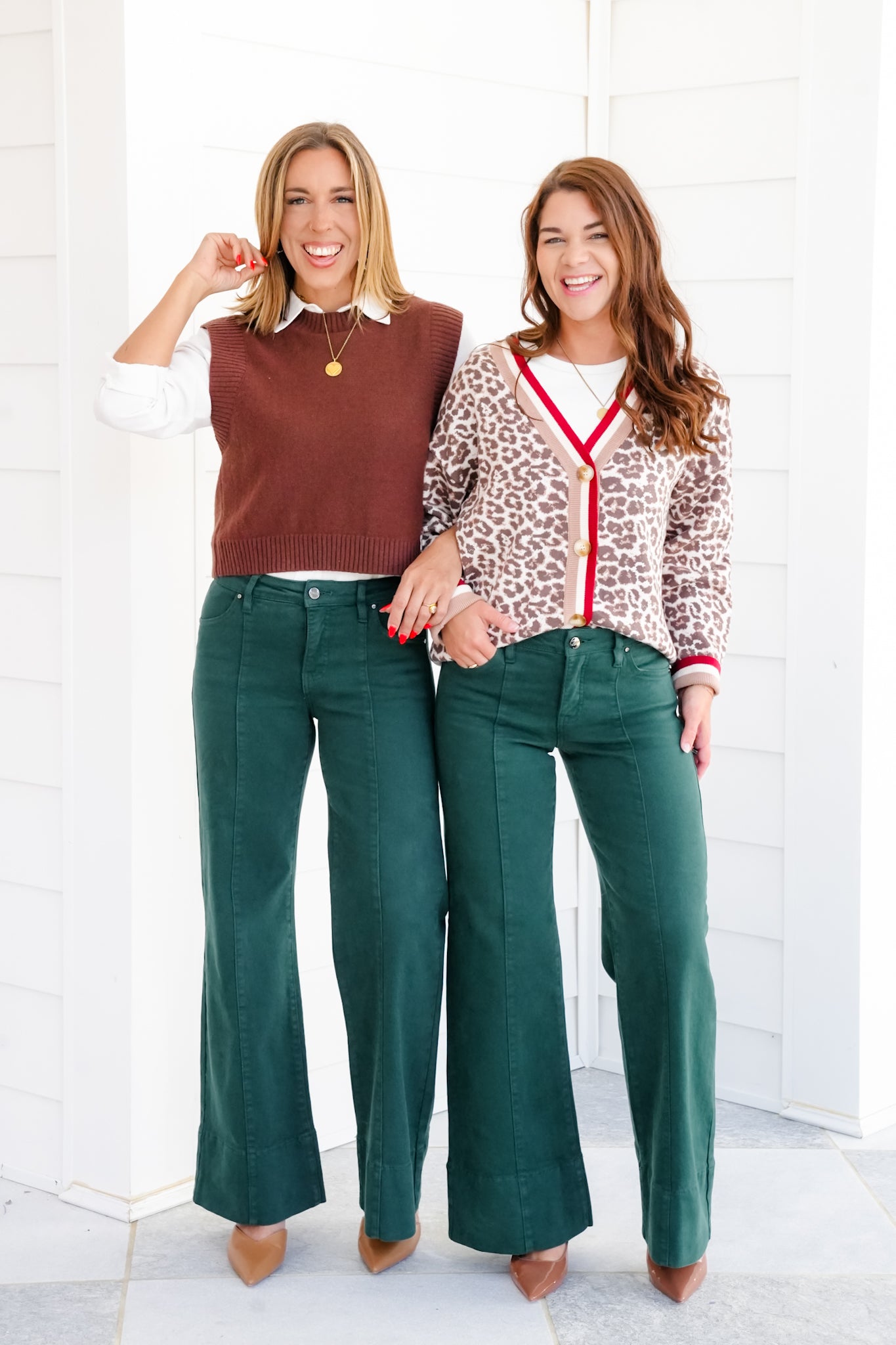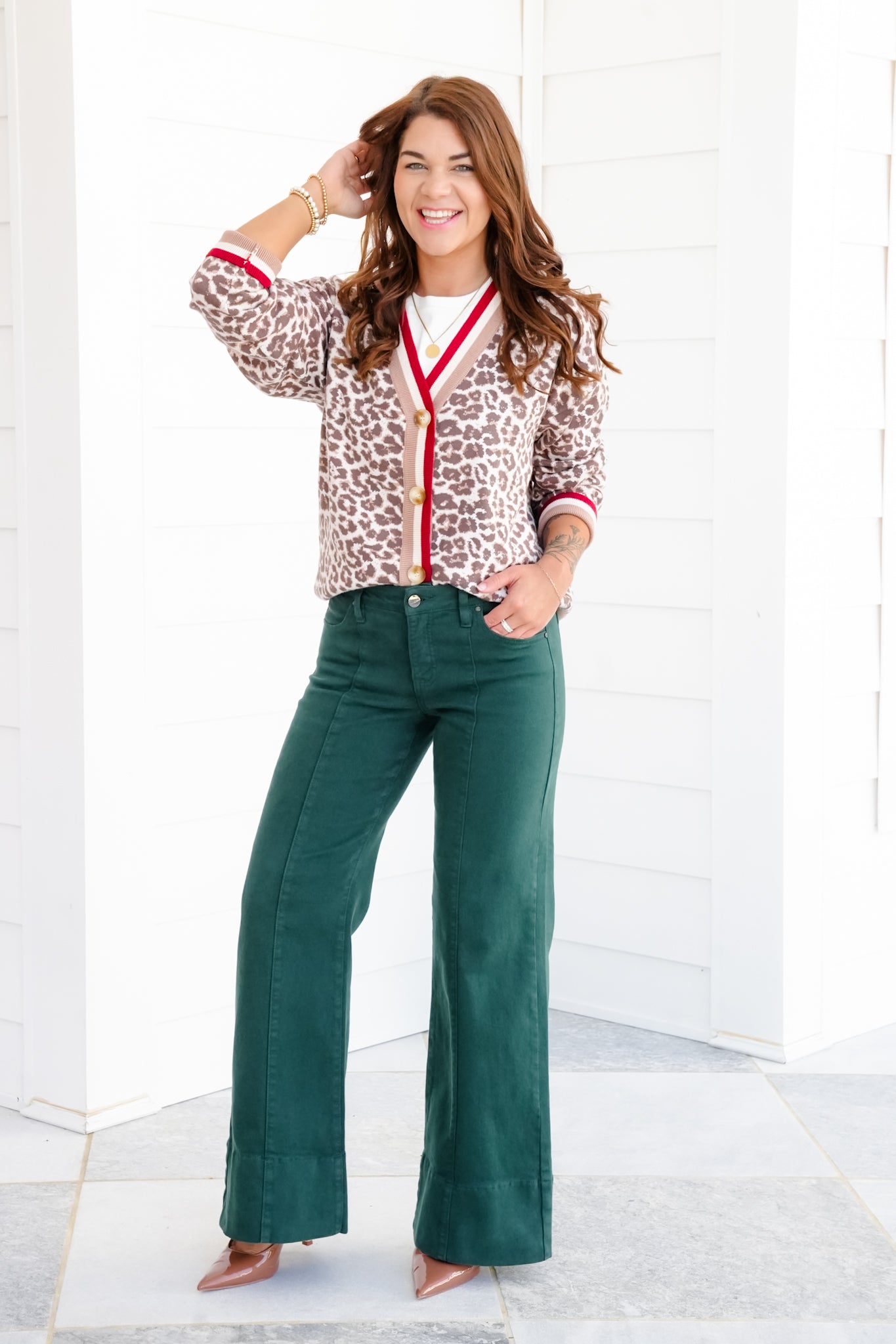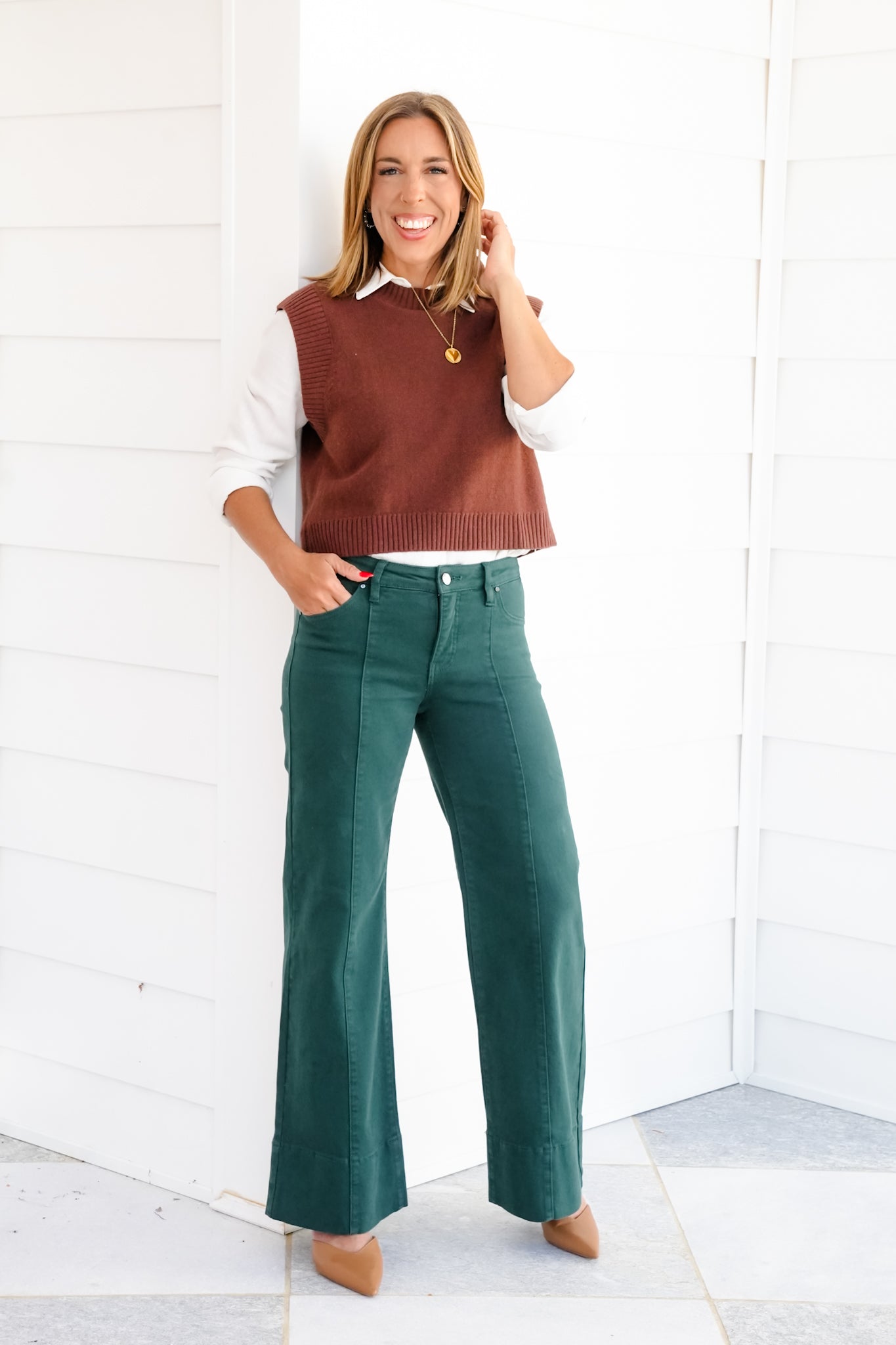Risen Mid Rise Green Tummy Control Wide Leg Jeans with Large Wide Hem