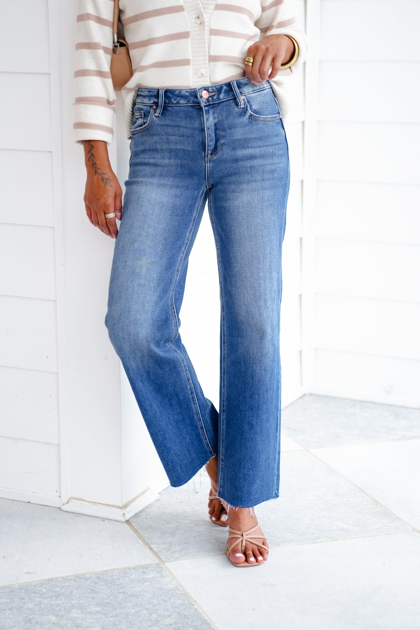 Risen Mid Rise Medium Wash Crop Straight Leg Jeans with Raw Hem