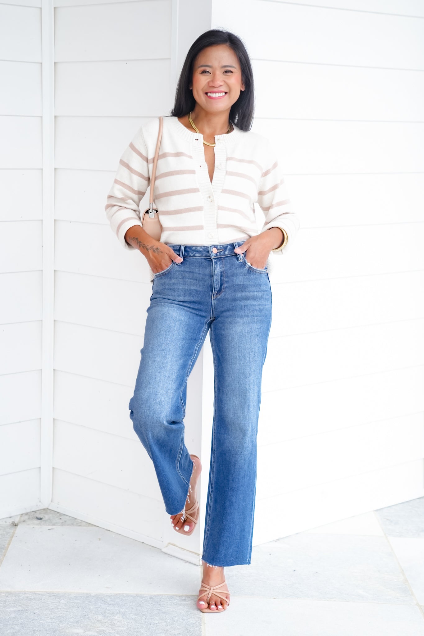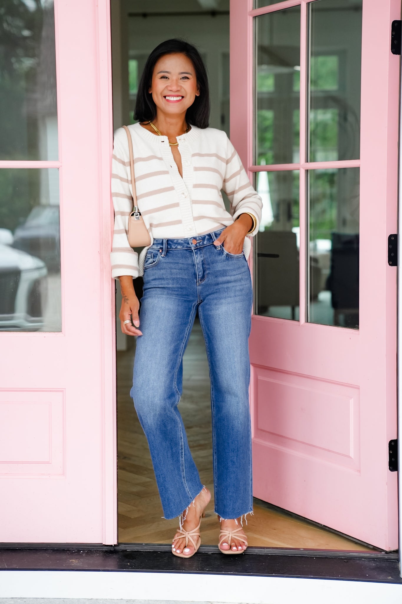 These Risen jeans are made to turn heads with their laid-back polish. The cropped straight leg cut gives a nod to European street style, while the raw-cut hem feels like that perfect pair you’ve had forever, but better. It adds character and just the right amount of edge, giving you a cool, undone vibe that still looks intentional and chic. Pair them with a crisp blouse and loafers for everyday sophistication, or style them with a graphic tee and sneakers for off-duty cool.