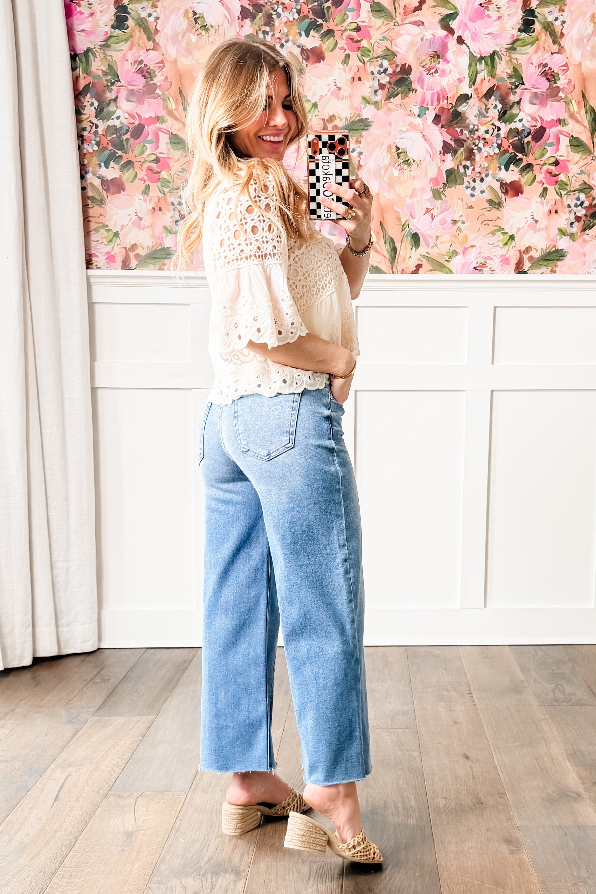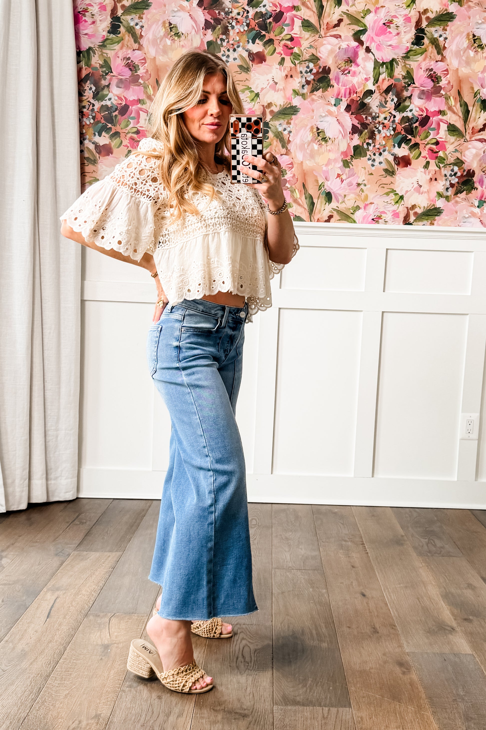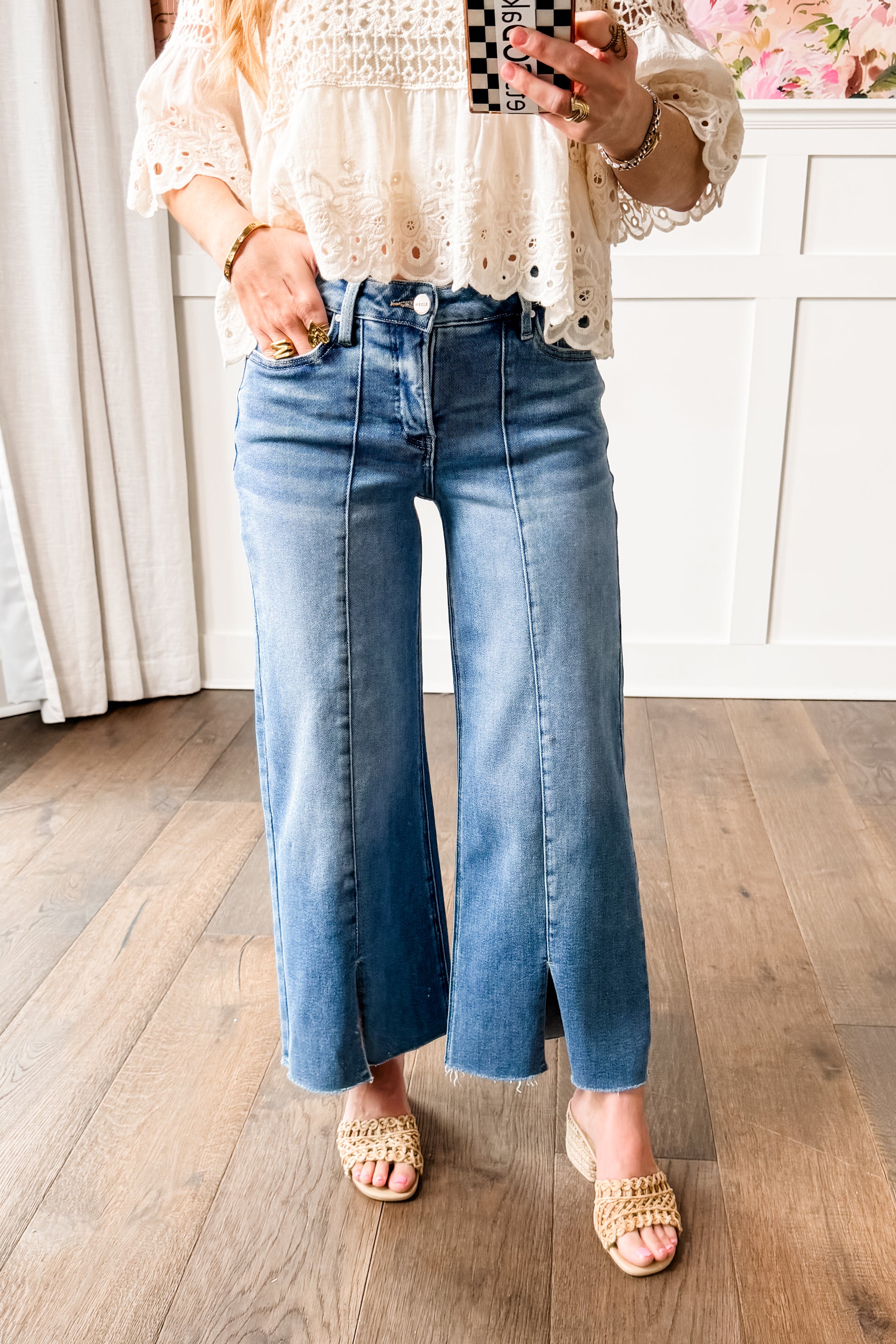 These jeans make a statement the second you put them on. The mid rise with built-in tummy control smooths and supports your waist for that confident, snatched feel. The The cropped wide leg delivers a bold, modern silhouette while the front seam creates a long, streamlined look. A front slit finished with a frayed raw hem adds that bold detail that makes these stand out.