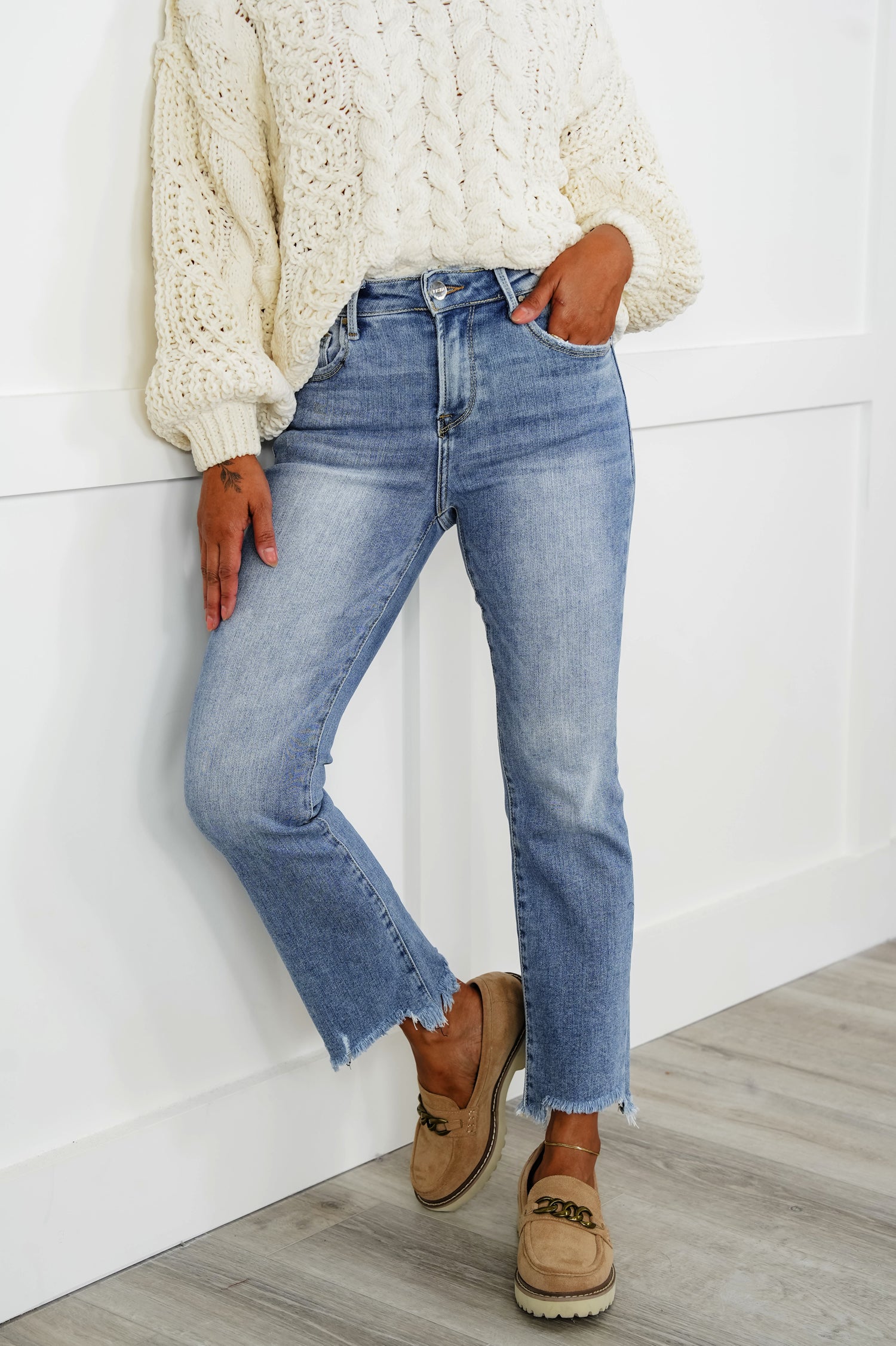 The jeans that everyone is trying to get their hands on ARE BACK! These straight-leg crop jeans are the hottest trend in denim and a wardrobe must-have! I know my shorties are excited about these, but average and taller girls - these are meant to be cropped, so you will love them, too! From the perfect medium wash, the amazing stretch, and the perfect fit these are a MUST HAVE!