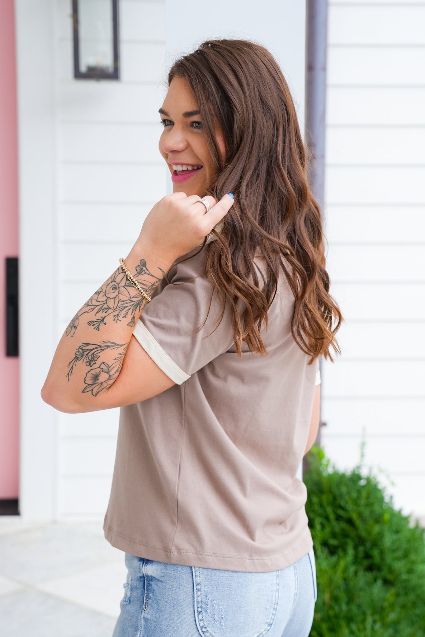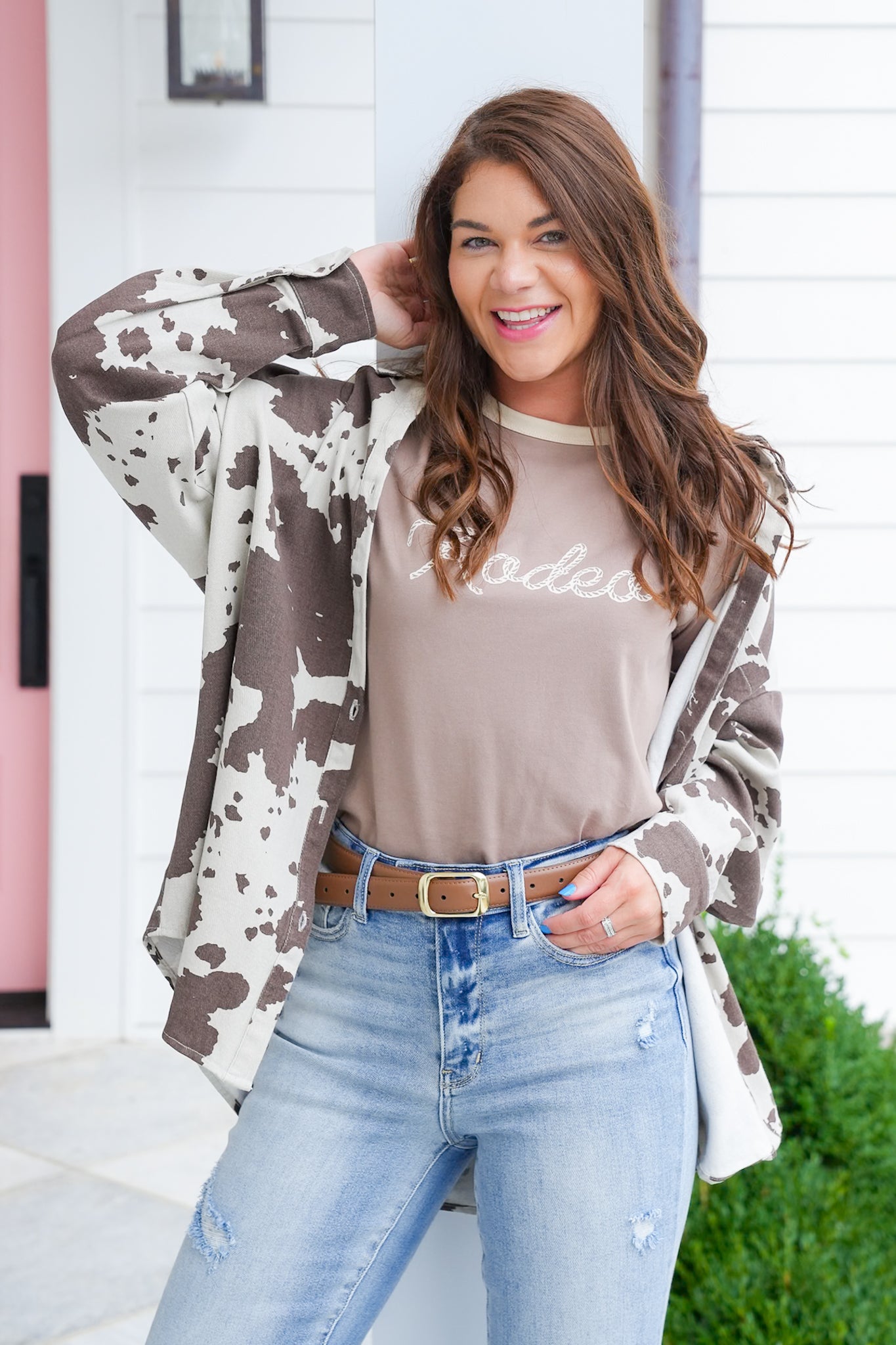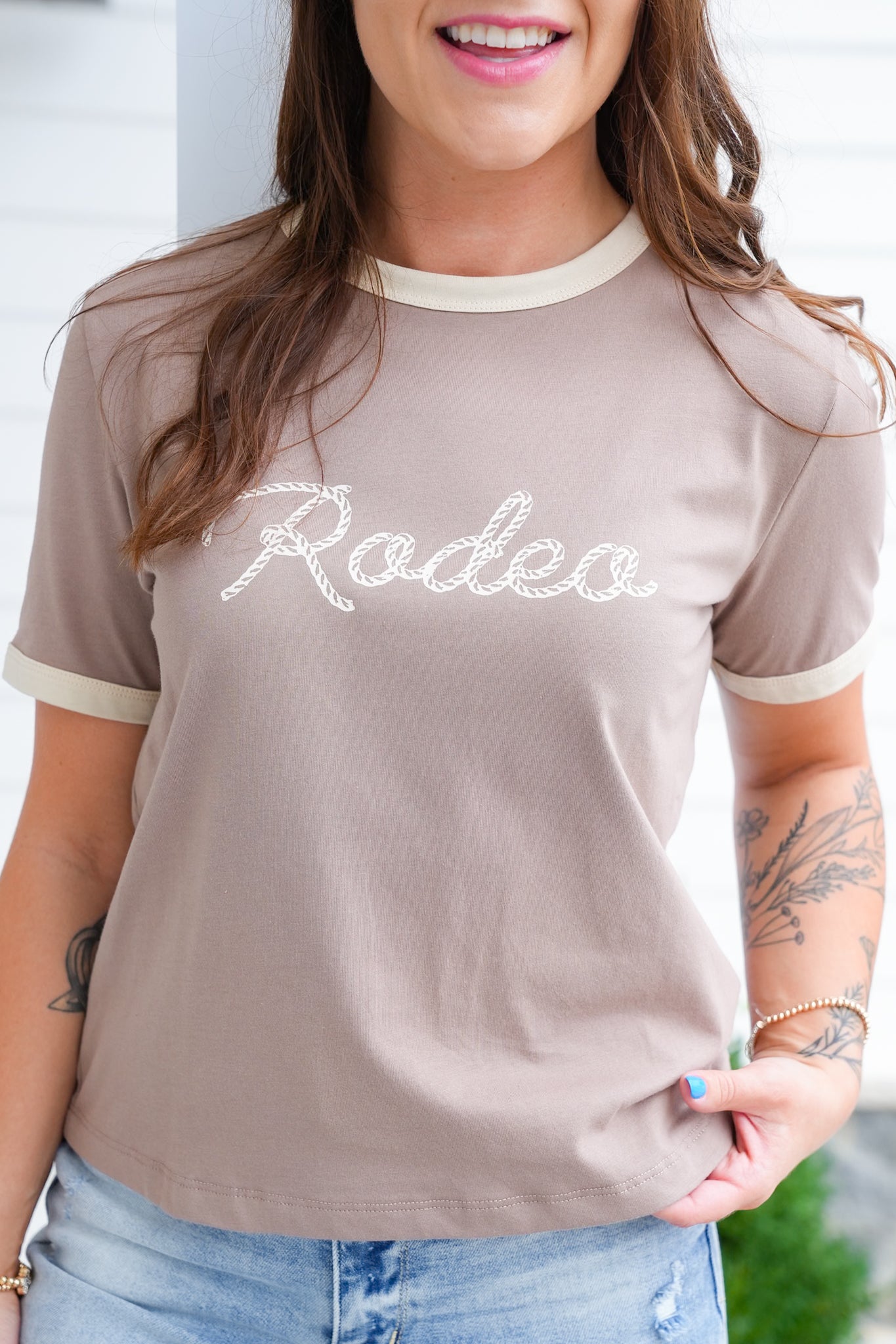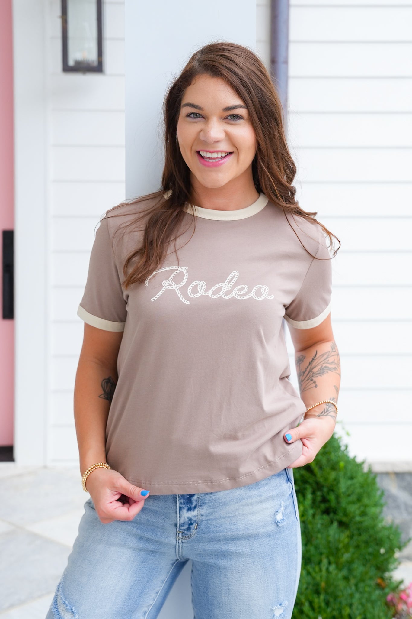 Western charm meets everyday comfort with this playful knit top! The rope-style Rodeo graphic steals the show, while the contrast trim makes it stand out in the best way. Perfect for concerts, game days, or casual weekends, it’s the kind of tee that pairs easily with denim shorts, cowboy boots, or layered under a cozy shacket.