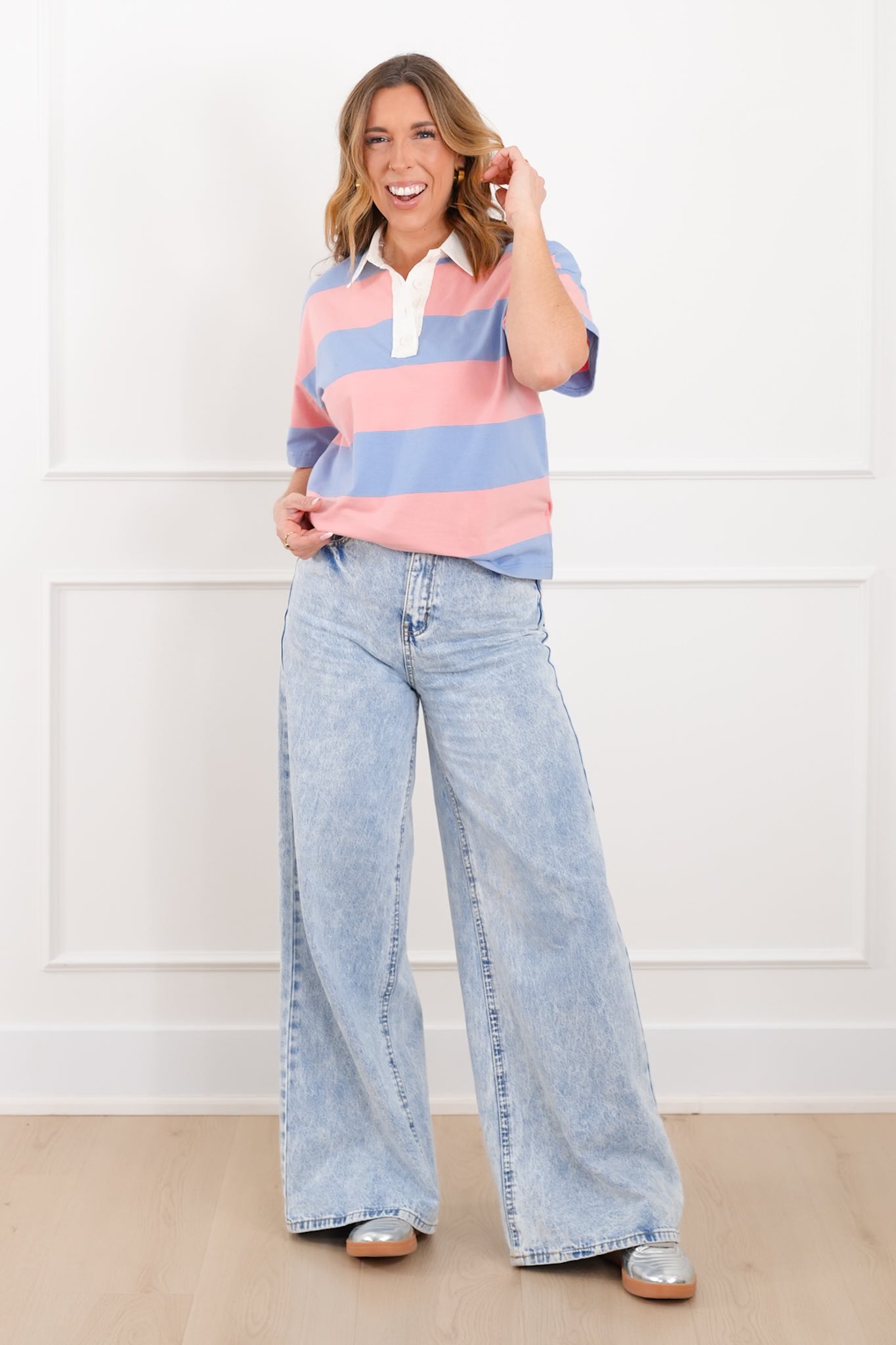 This rugby stripe top is the perfect mix of casual and cute. The bold stripes give it a timeless, laid-back vibe while the button neck detail adds just enough interest to make it feel special. It’s incredibly soft, easy to style with denim or shorts, and works for everything from busy days to slow weekends.