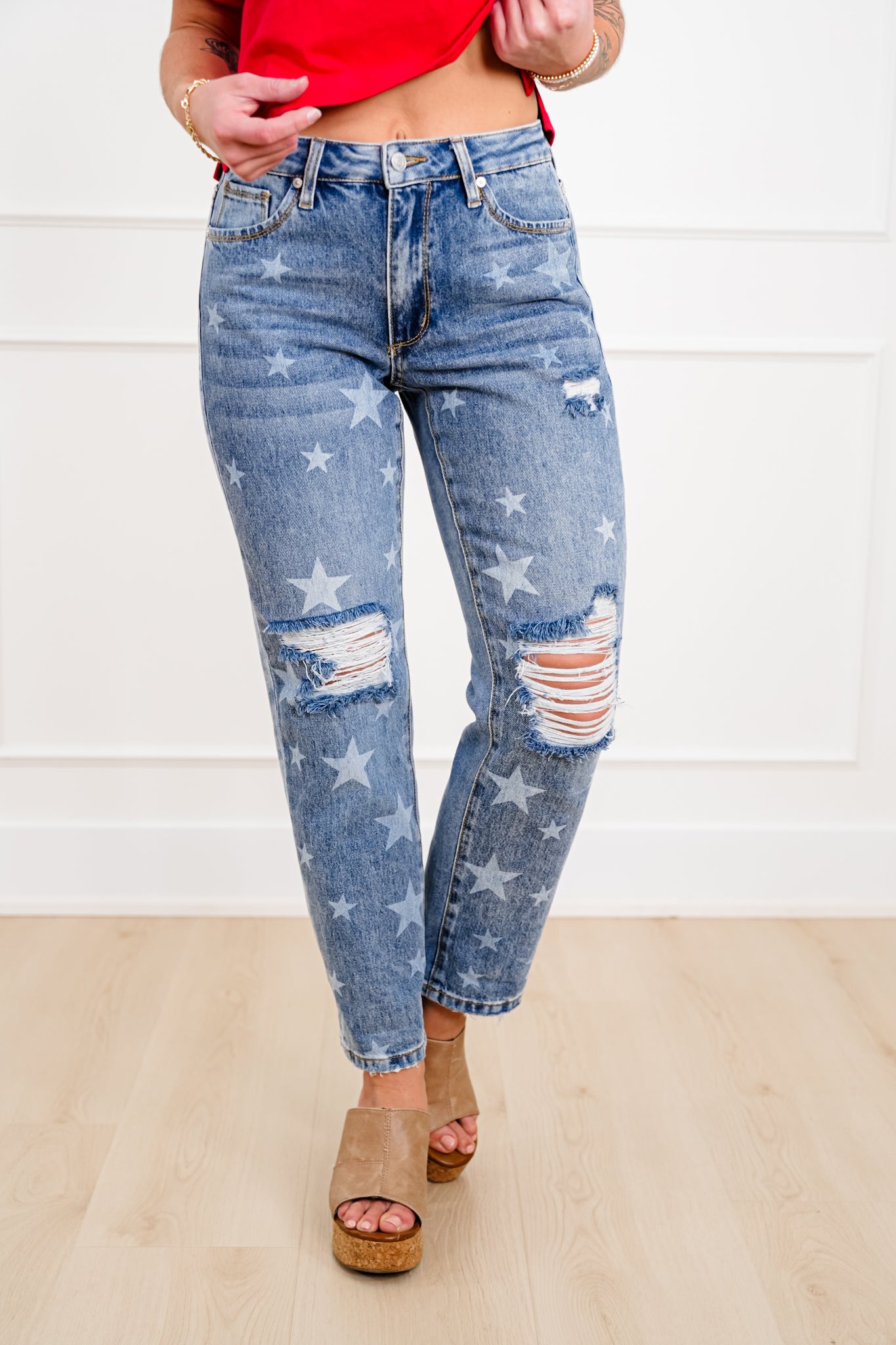 Saige Mid Rise Medium Wash Slim Boyfriend Jeans with Star Print