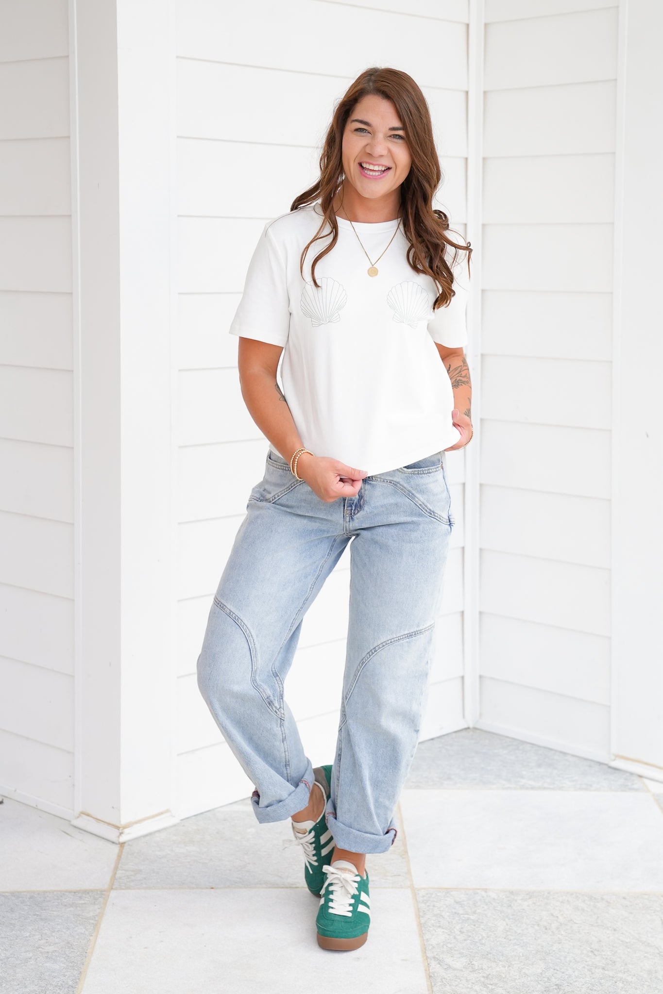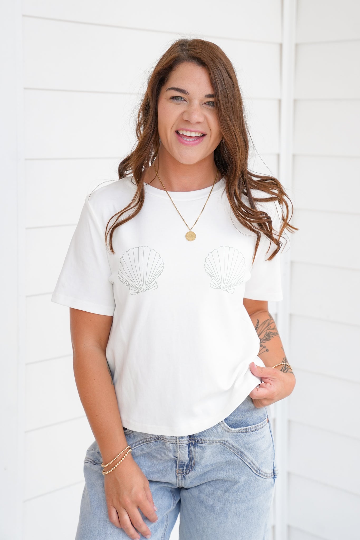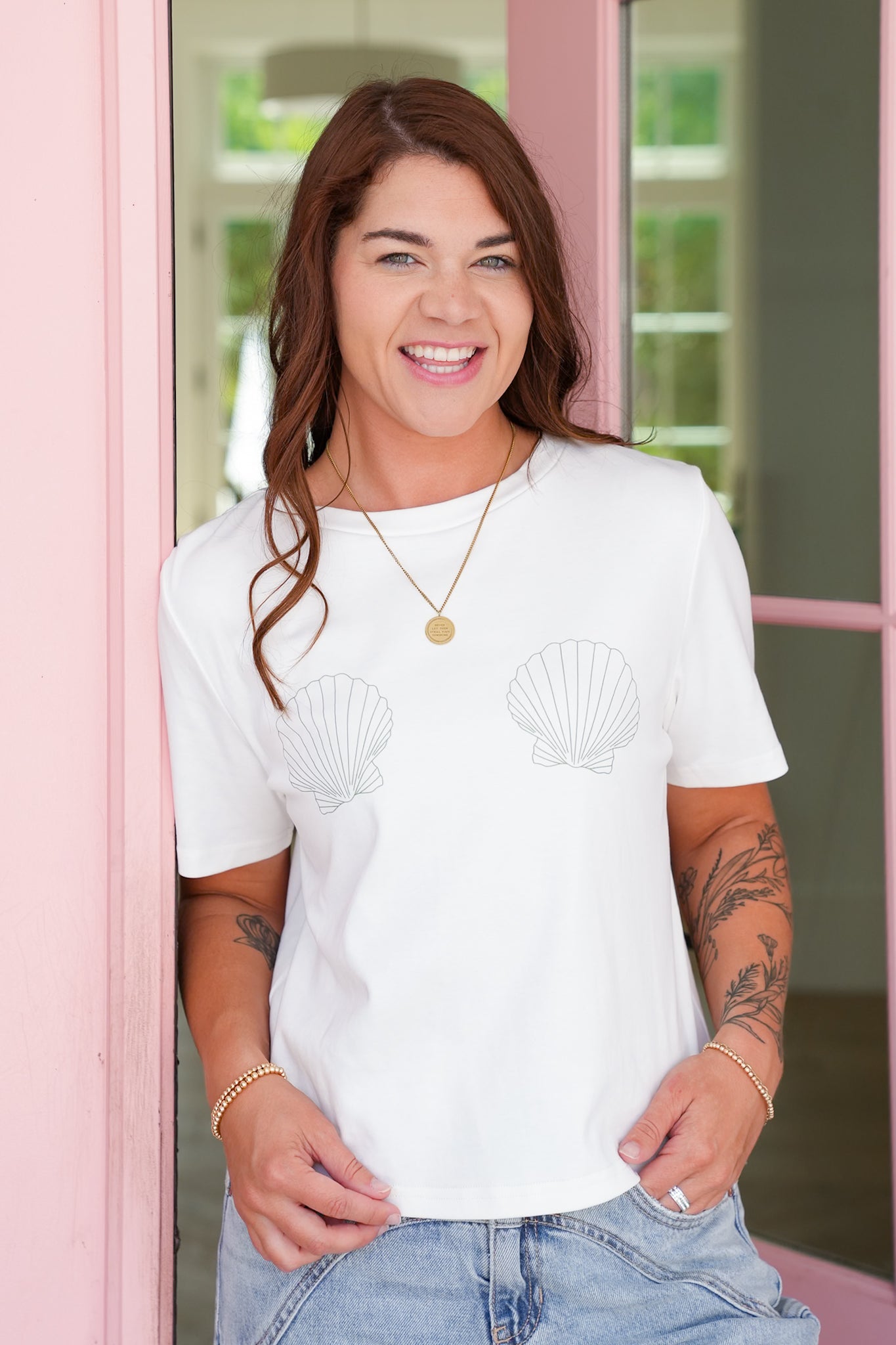 Fresh and fun, this seashell tee adds a touch of whimsy to your casual wardrobe. The simple shell graphic makes it stand out while staying versatile enough to style with everything from cutoffs to wide-leg denim. A modern classic with a beachy nod.