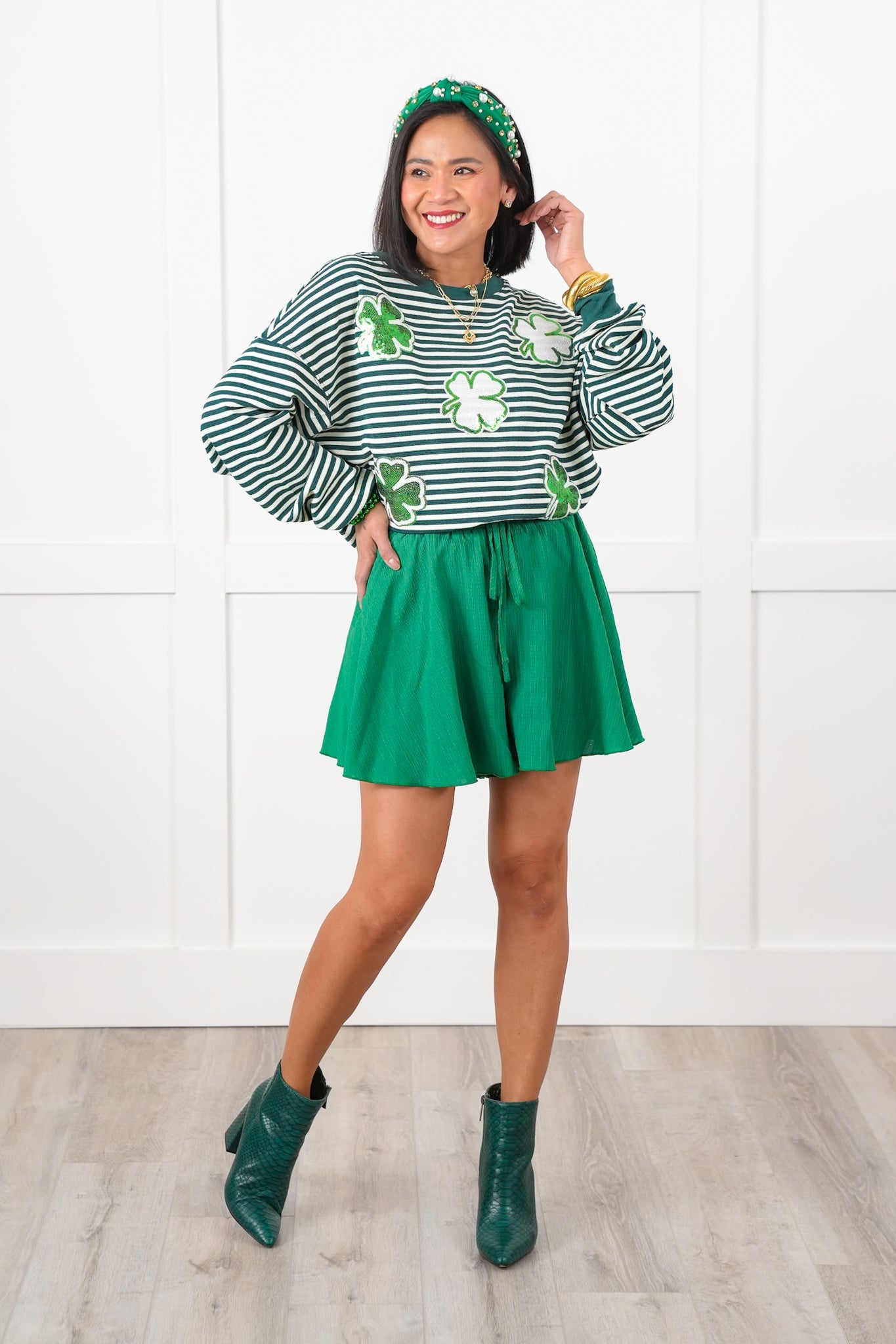 This cute and cozy long-sleeve top is decked out with sequin 4-leaf clovers for a playful, St. Patrick's Day-inspired look that can carry you through the season. Its bold stripes and festive touch make it an easy choice for a holiday celebration or just adding some lucky charm to your day. Pair it with white jeans or black leggings for a chic combo.