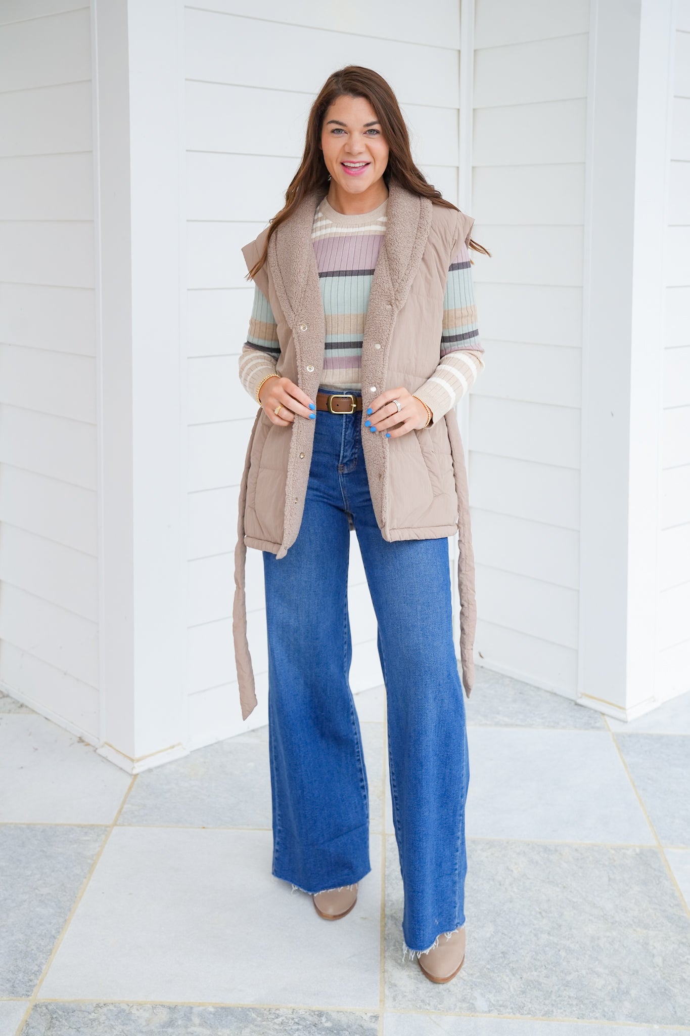 This vest gives you two chic looks in one—soft sherpa for cozy days and sleek quilted puffer for a more classic vibe. The belted waist adds shape while still keeping things relaxed and easy to wear.