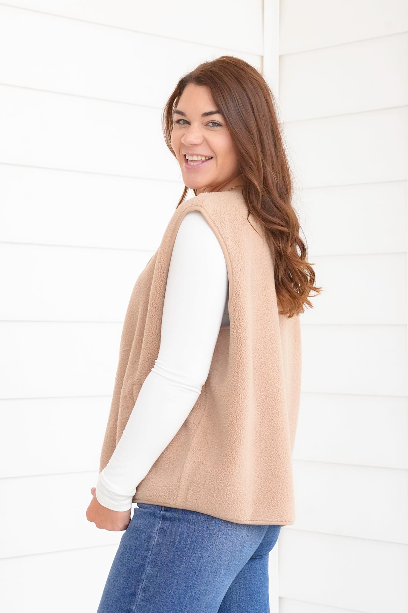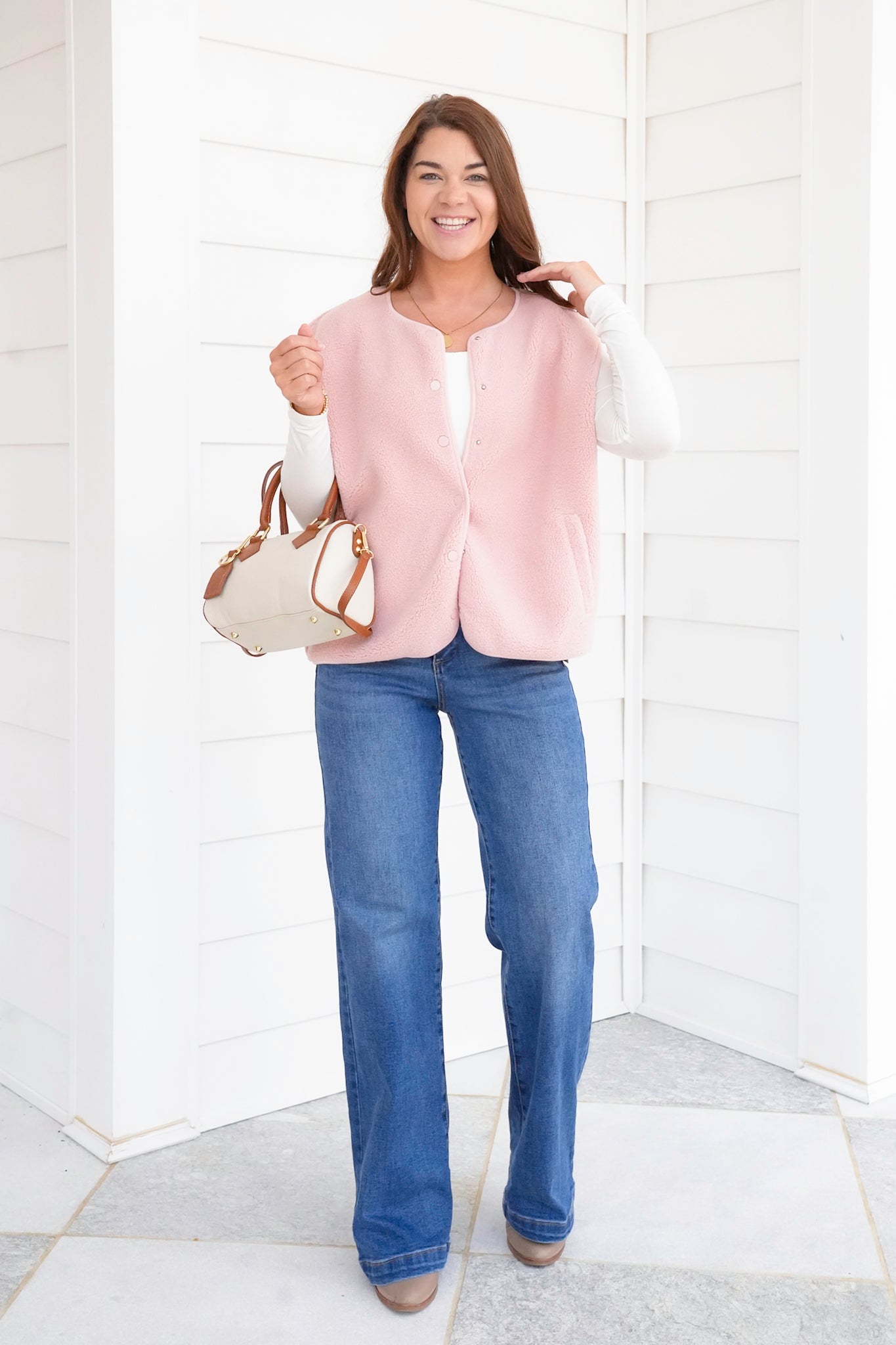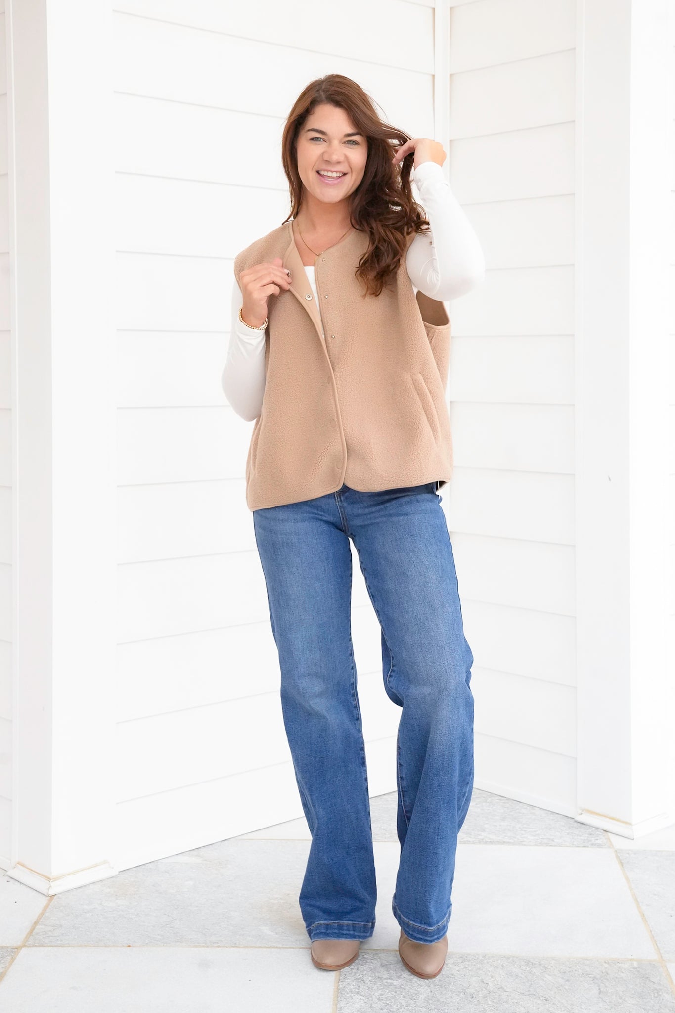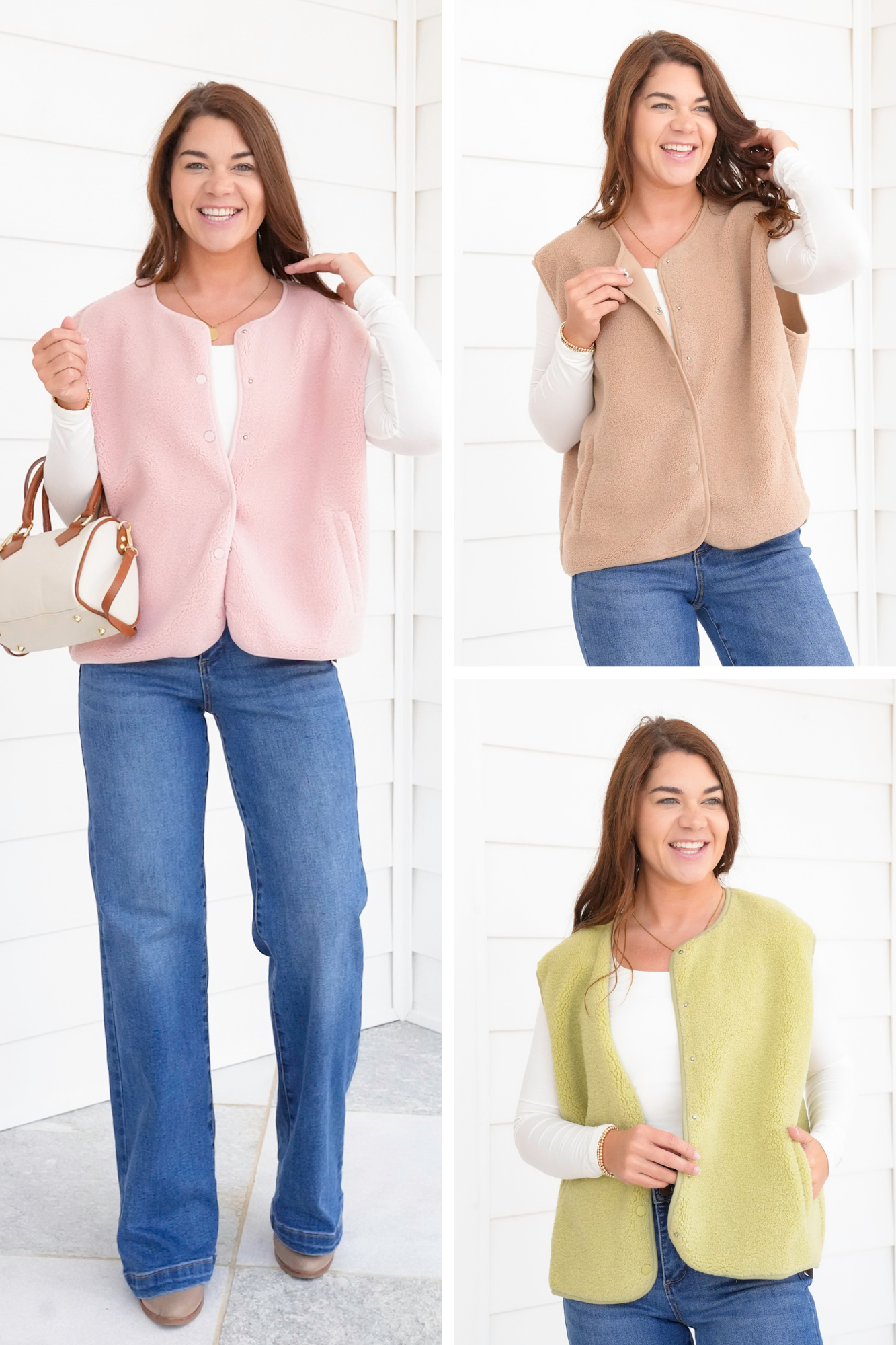 This sherpa vest is the perfect cozy layer for chilly days. With its boxy cut and soft texture, it adds warmth without feeling heavy, making it a great piece to throw over long sleeves or lightweight knits. The snap closure and side pockets give it both functionality and laid-back charm.