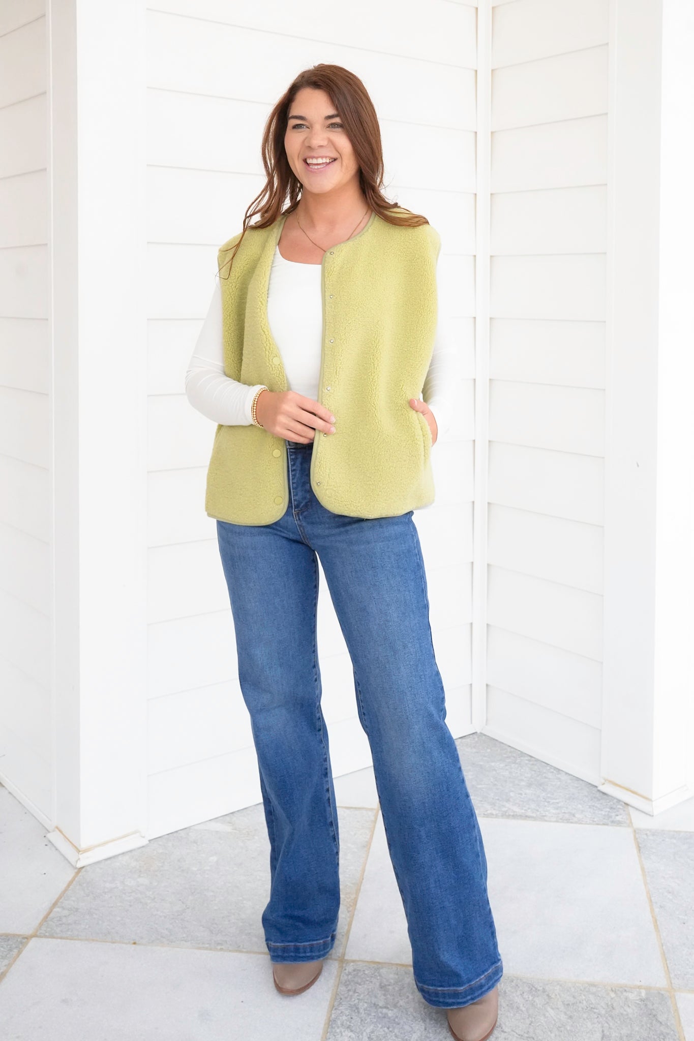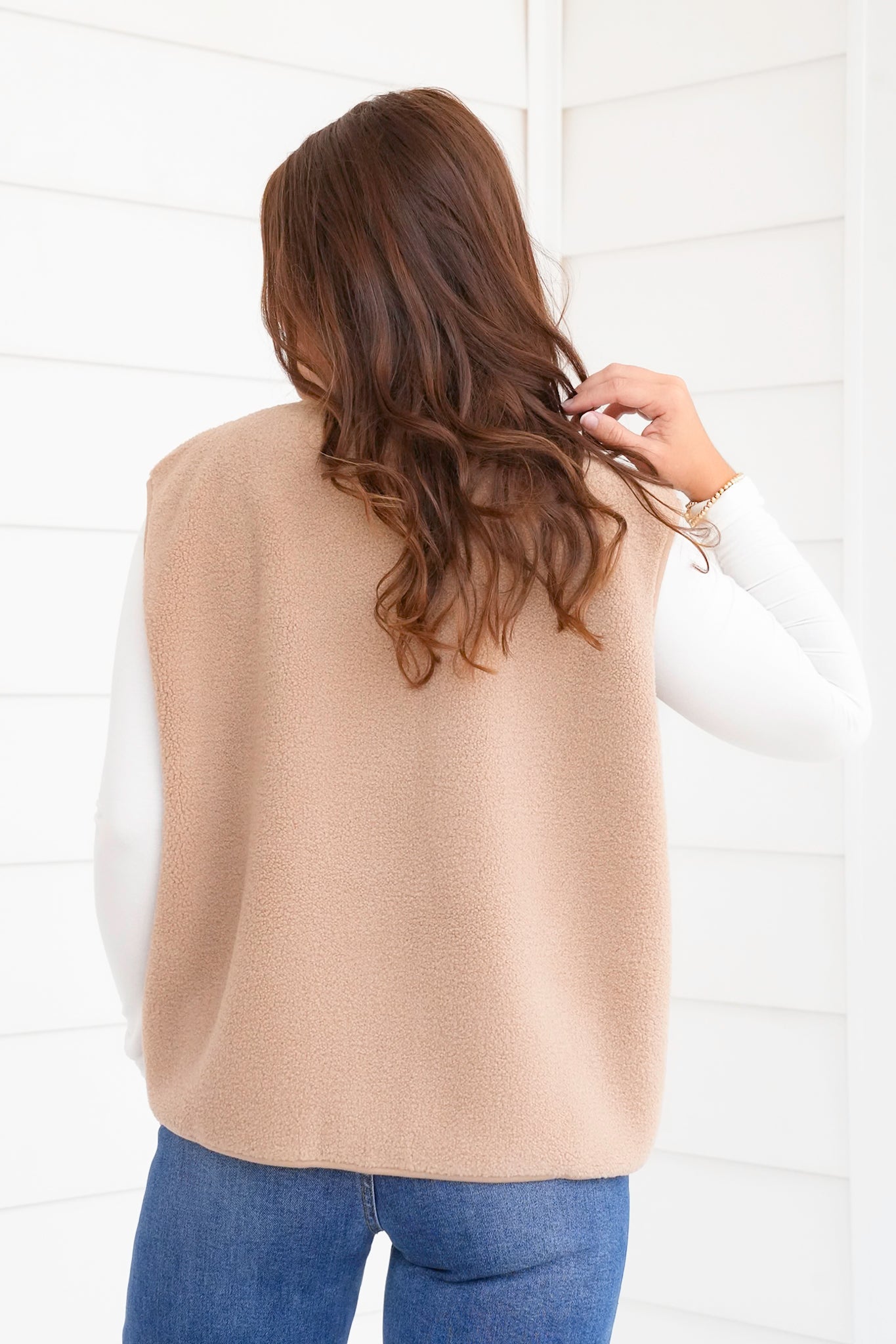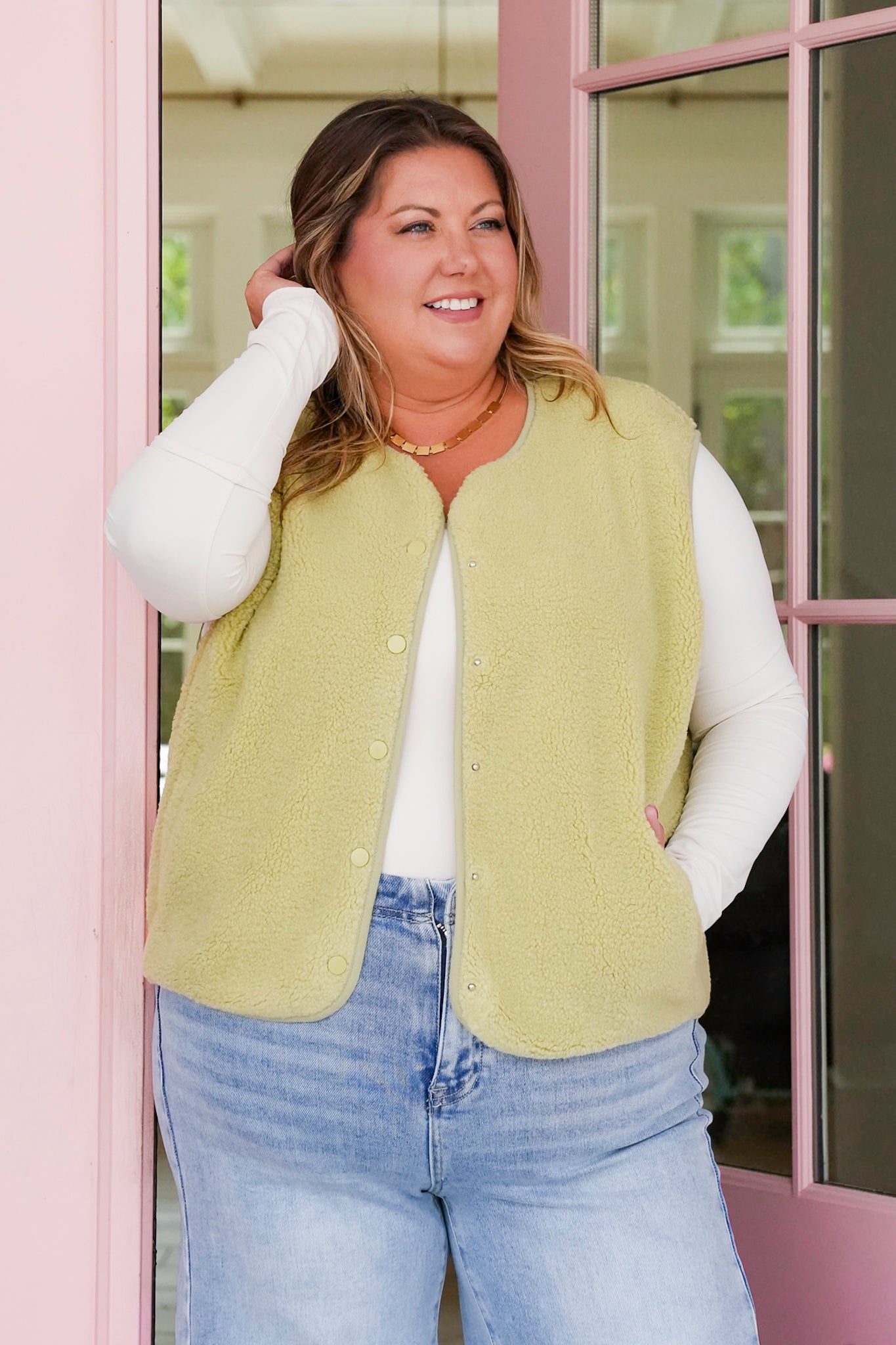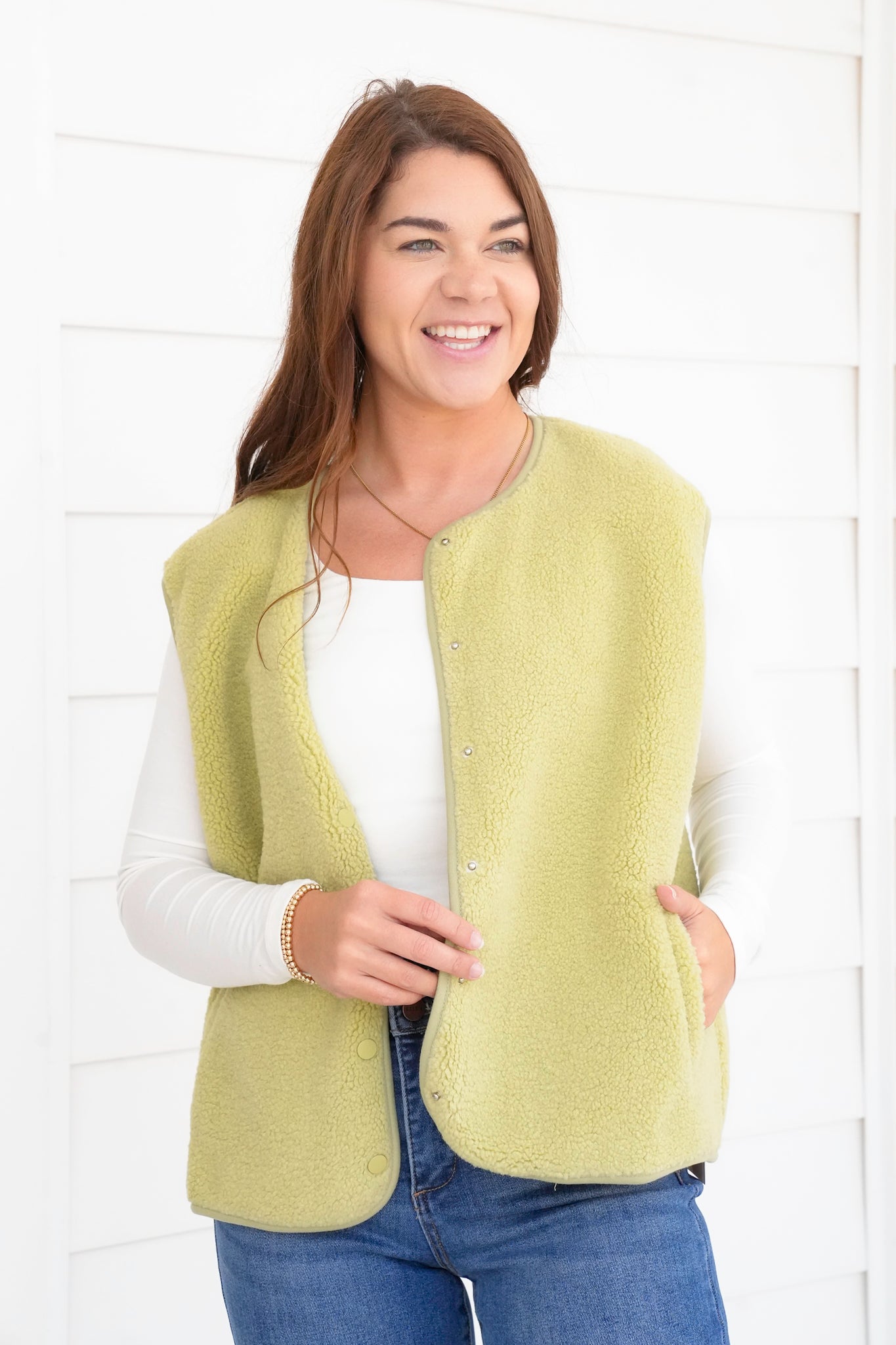 This sherpa vest is the perfect cozy layer for chilly days. With its boxy cut and soft texture, it adds warmth without feeling heavy, making it a great piece to throw over long sleeves or lightweight knits. The snap closure and side pockets give it both functionality and laid-back charm.