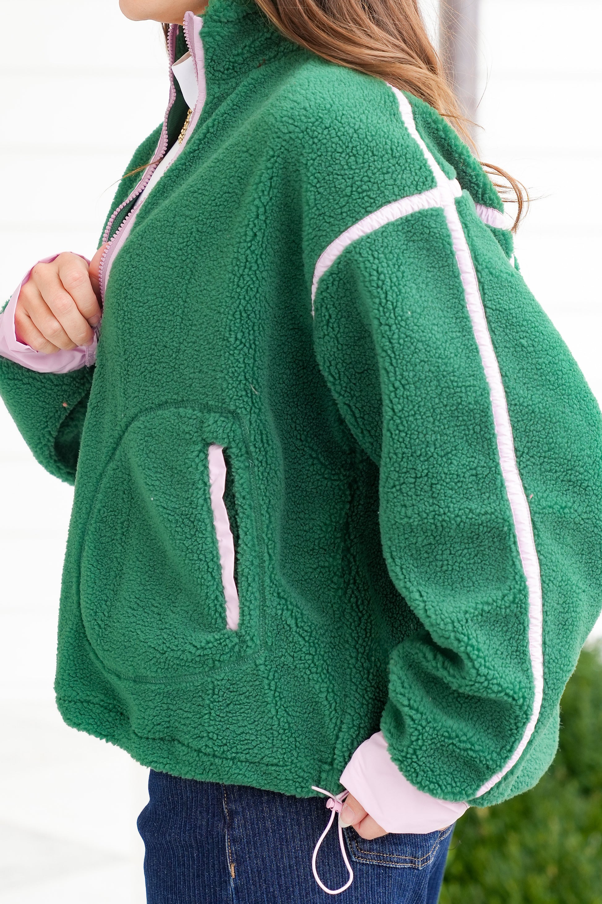 The green and pink combo gives this sherpa half zip a refreshing, modern twist! It’s the grab-and-go piece you’ll reach for on repeat — warm, plush, and ridiculously soft. Pair it with jeans or joggers and sneakers for an easy weekend look that still looks cute in photos.