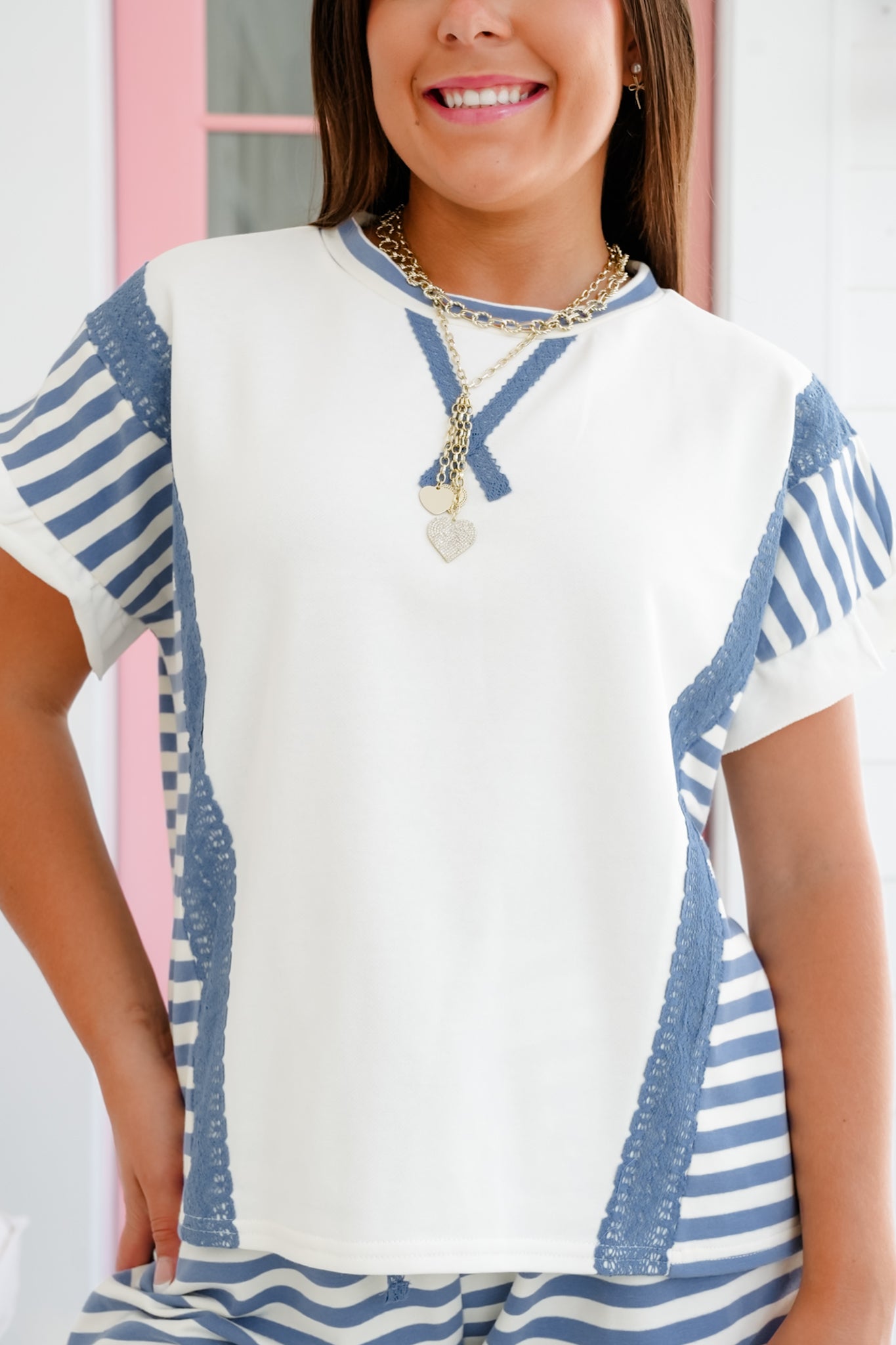 * Unique stripe panels and lace insets that give this top boutique-level detail
