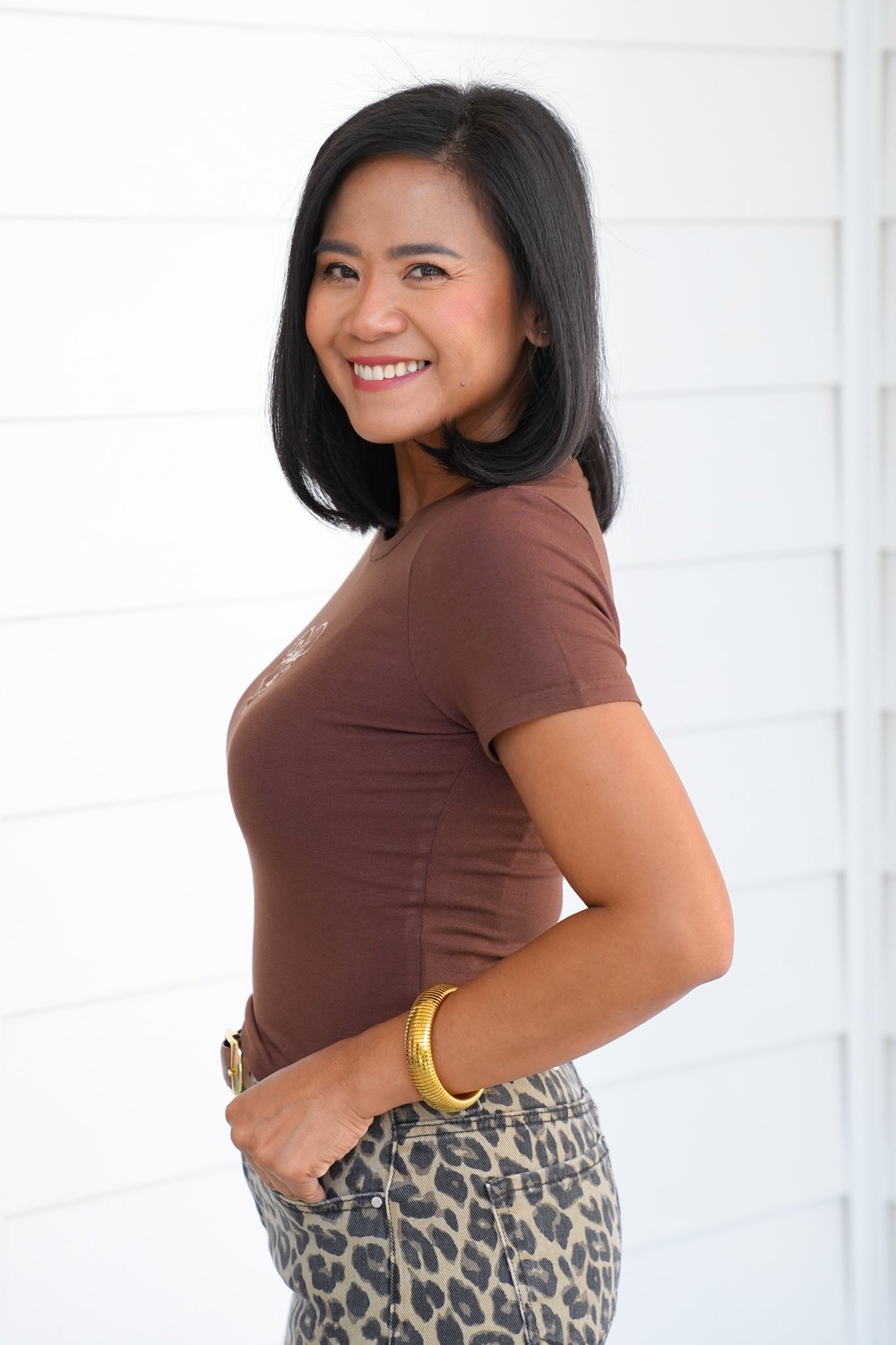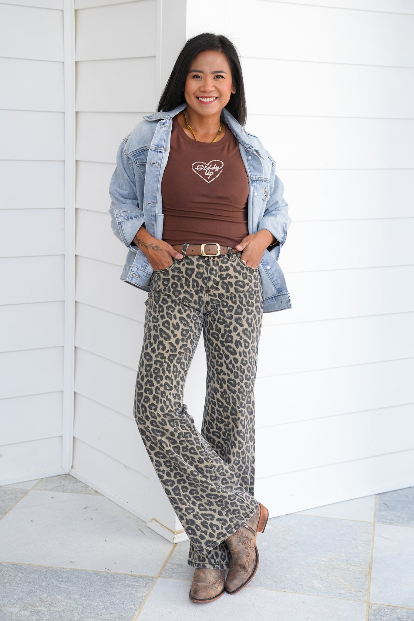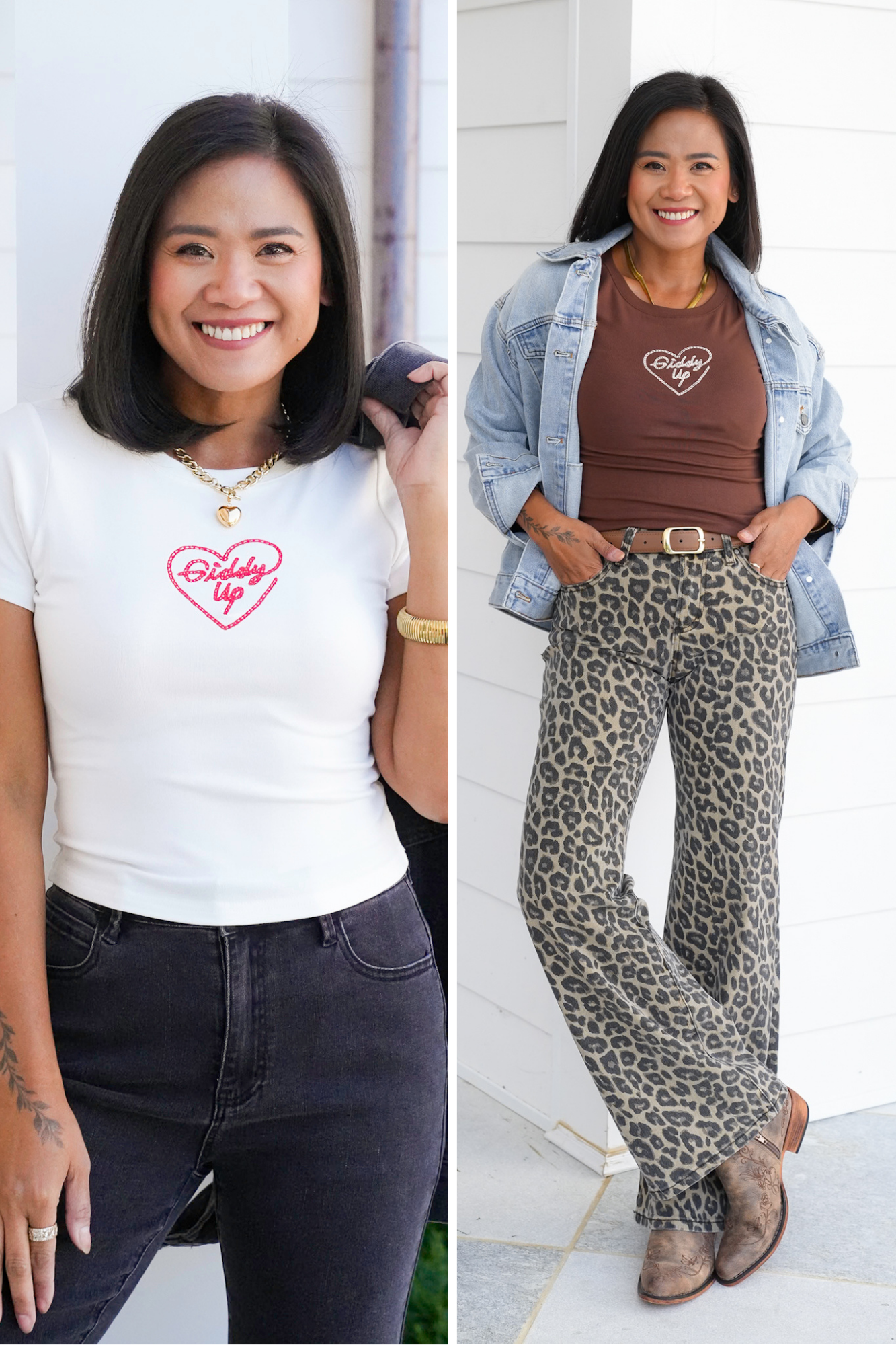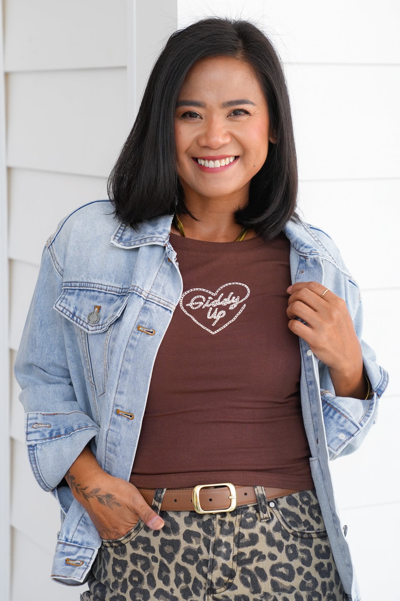 This embroidered tee adds a touch of western charm to your casual lineup. The “Giddy Up” detail makes it stand out without being over the top, giving you a go-to graphic that works with everything from denim shorts to layered shackets. Toss it on for errands, rodeo nights, or casual weekends.