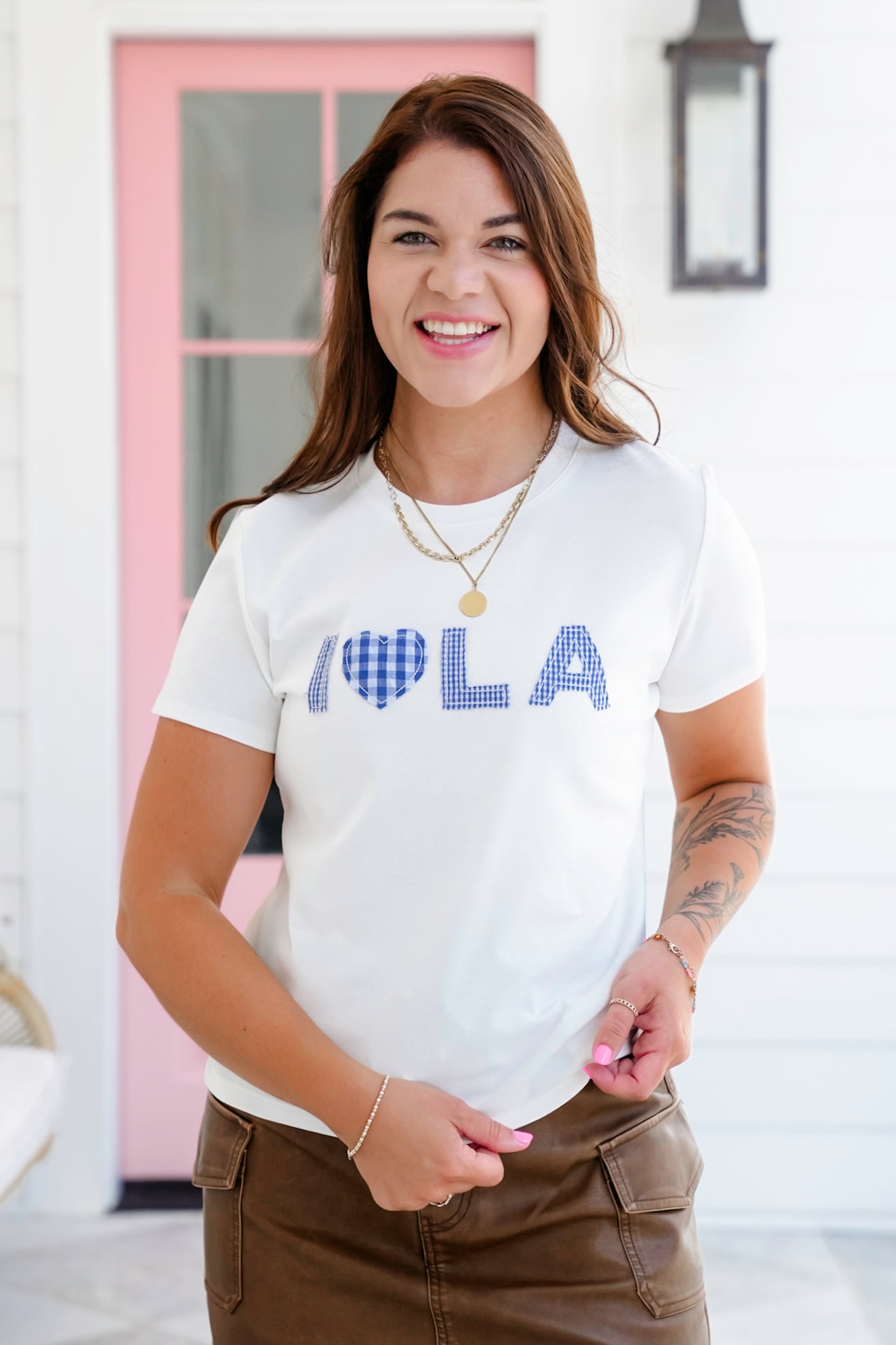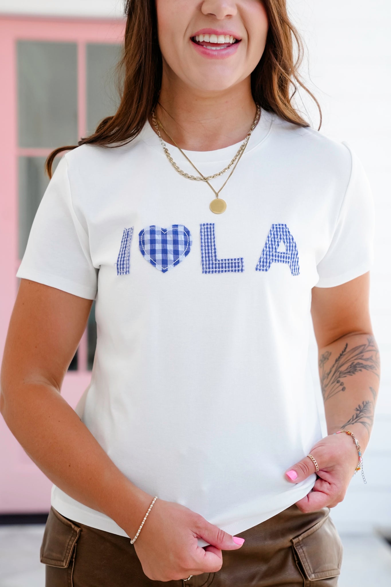 This top is made for casual-cool days with a touch of trendy charm. The blue gingham appliqué adds a fun and unique spin to your everyday tee collection. Wear it with denim shorts, a baseball cap, and sneakers for errands, or tuck it into a skirt with sandals for a polished casual look.