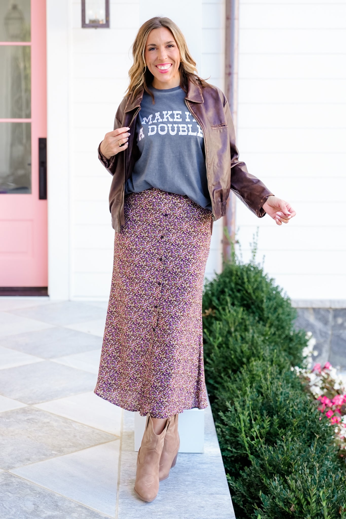 This playful tee brings that laid-back charm you love with its soft, lived-in feel and bold lettering that makes a fun statement. The washed finish gives it that relaxed, vintage-inspired vibe, and it styles so easily with jeans, skirts, or a cozy jacket. Pair it with denim and sneakers for a casual day or dress it up with a midi skirt and a leather jacket for an edgier take.