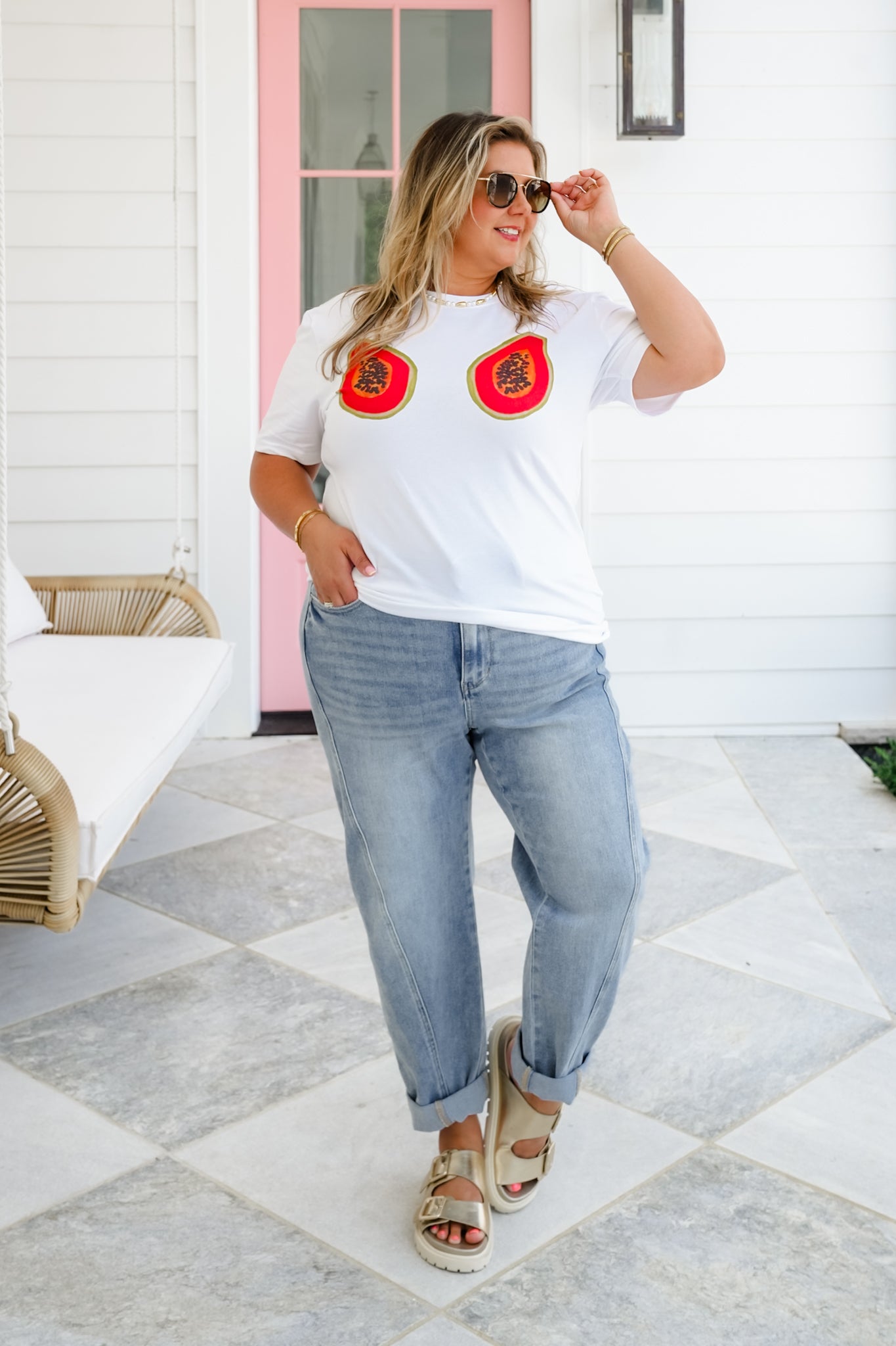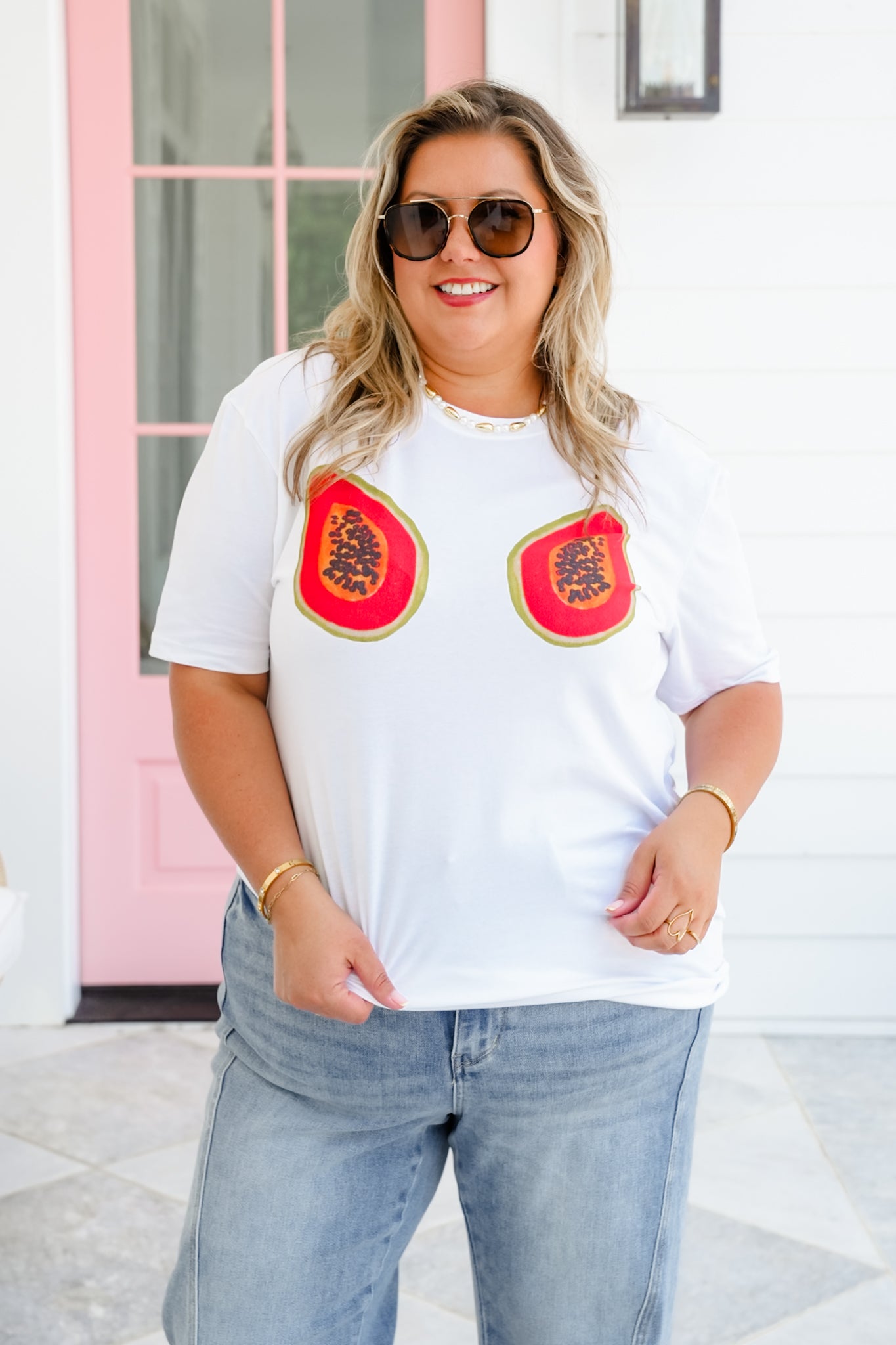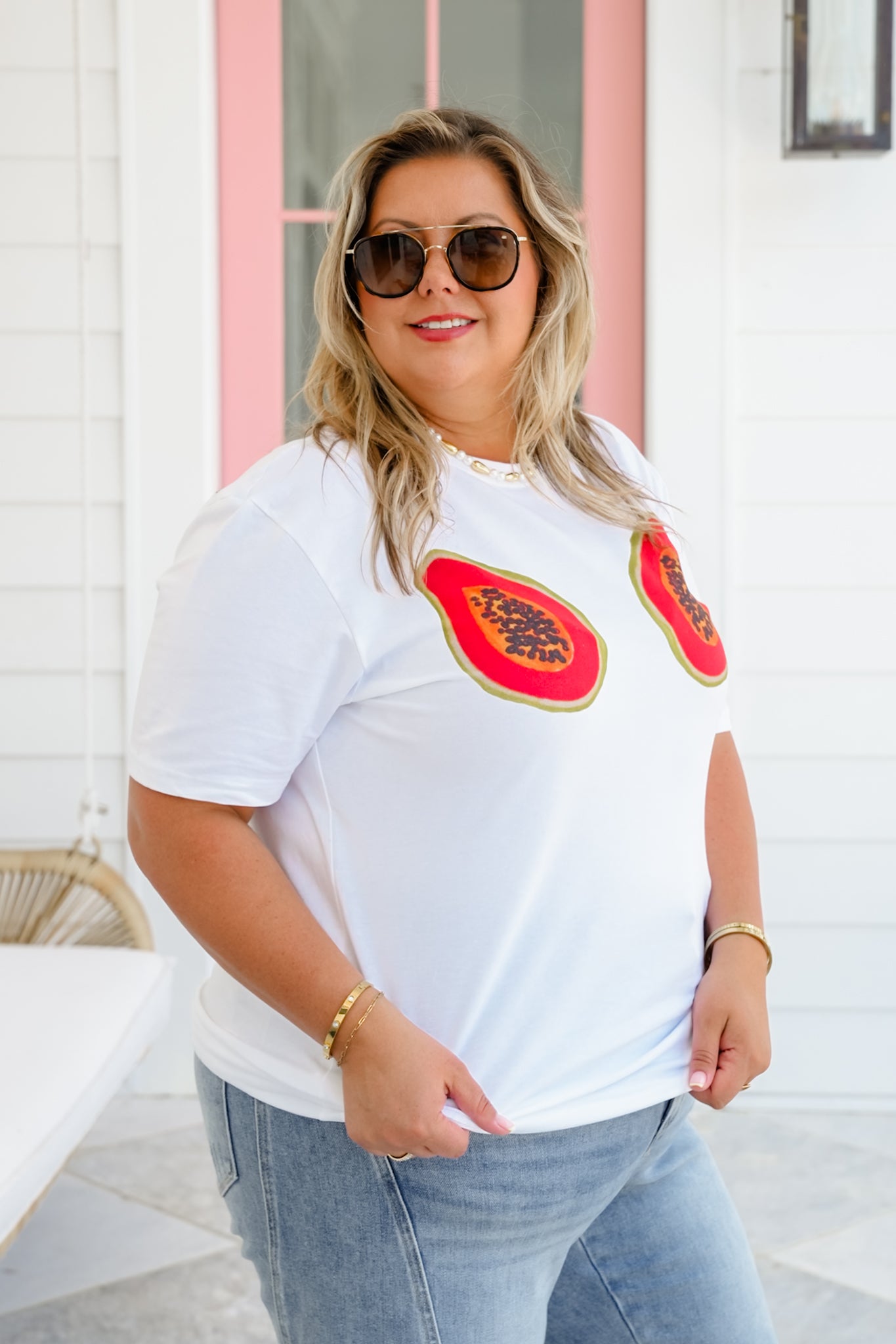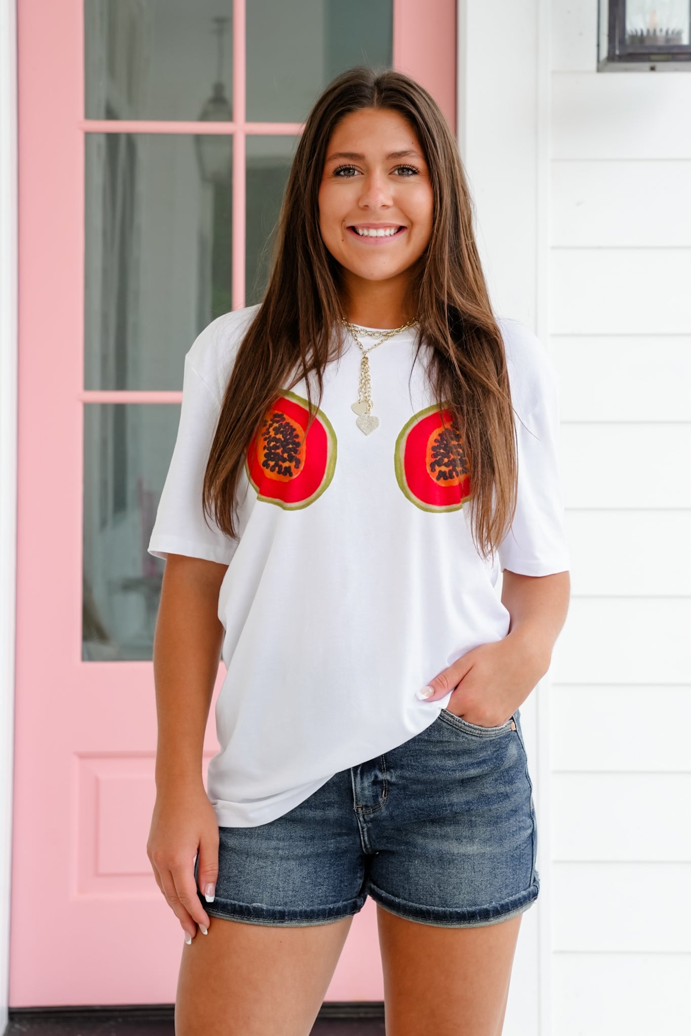 This tee is serving up juicy attitude with a playful twist! Featuring bold papaya graphics front and center, it’s cheeky, confident, and made to turn heads. The soft cotton blend and classic unisex fit make it the ideal grab-and-go piece for sunny days, weekend hangs, or whenever your outfit needs a little tropical flair. Pair it with a pleated mini, denim cutoffs, or wide-leg joggers for a laid-back look that brings all the fun.