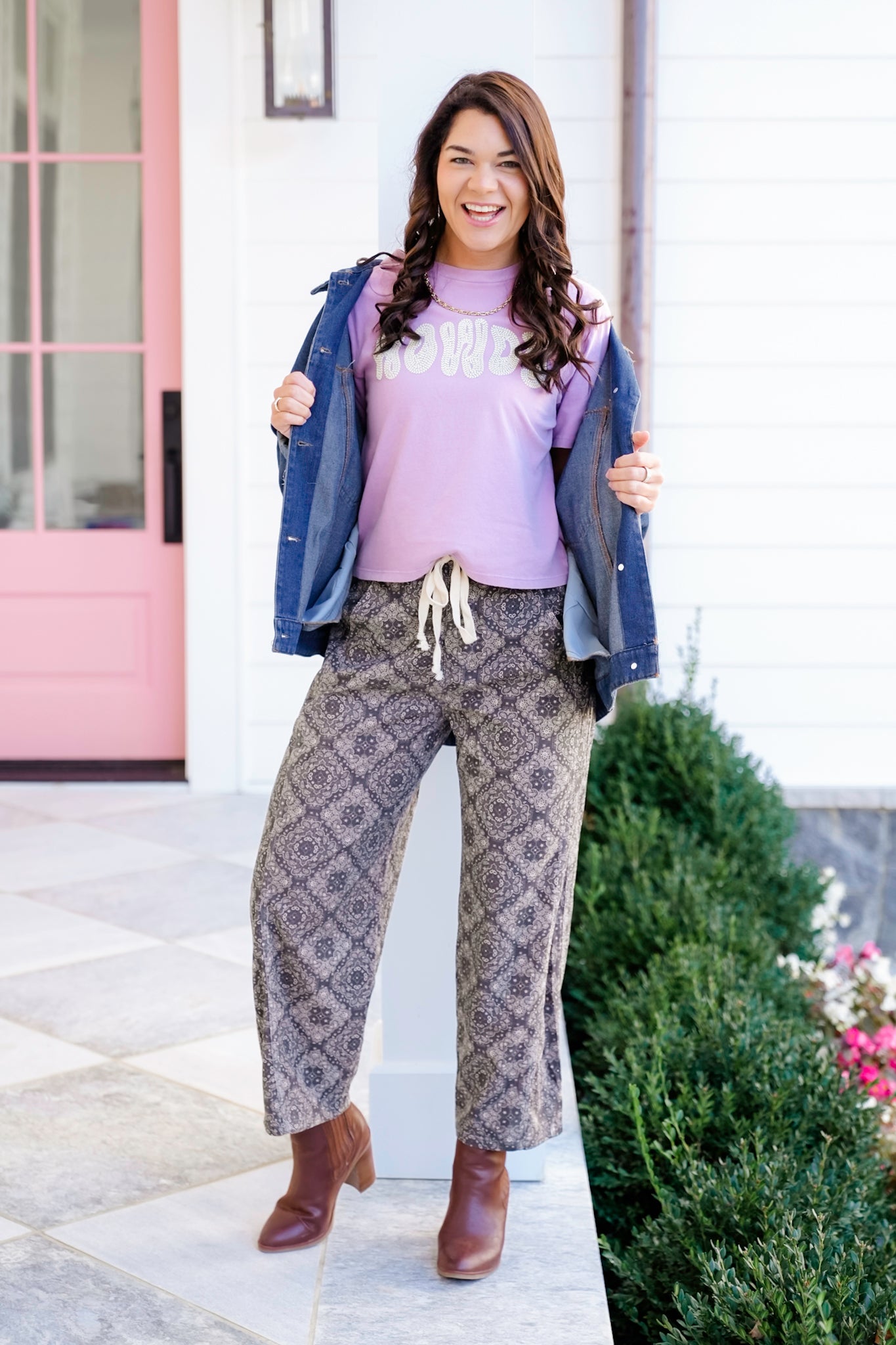 This mini tee adds a playful touch to everyday outfits with its raised puff print “Howdy” graphic that brings texture and personality front and center. It is an easy grab when you want something fun that still feels wearable, whether you’re styling it with high-rise denim, relaxed joggers, or layering it under a jacket for casual days.