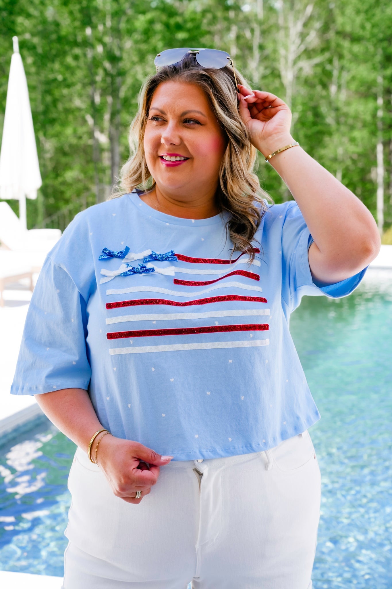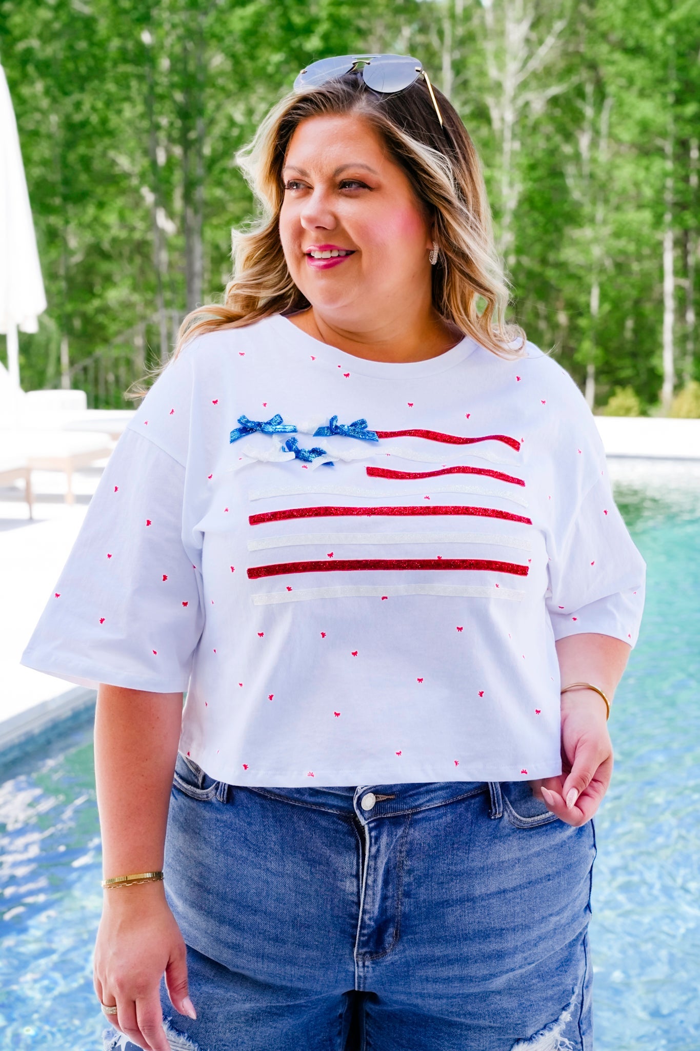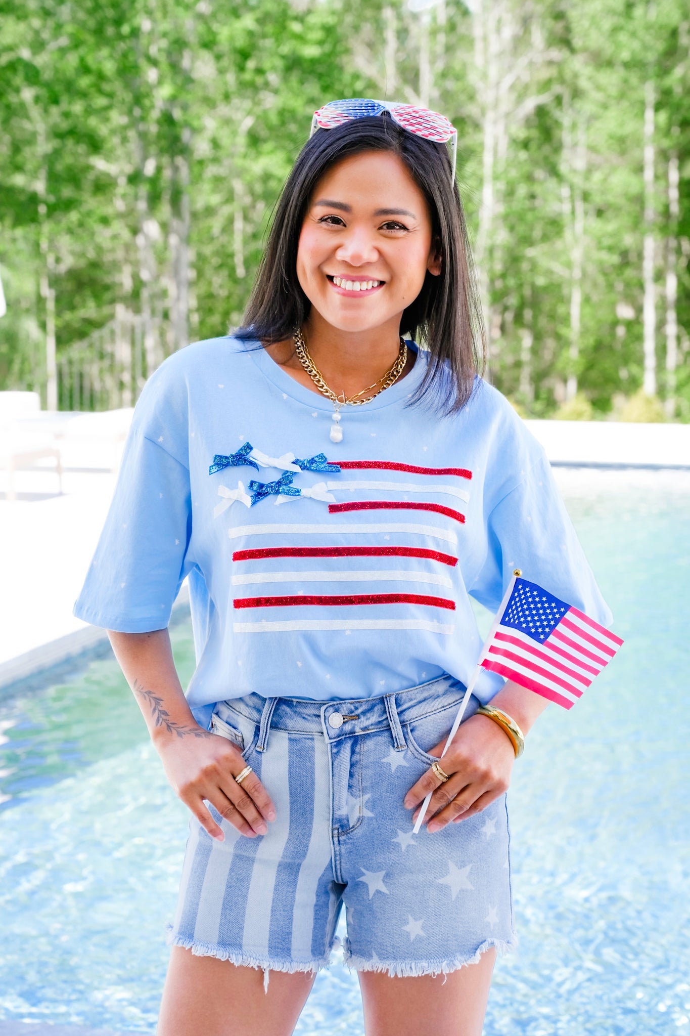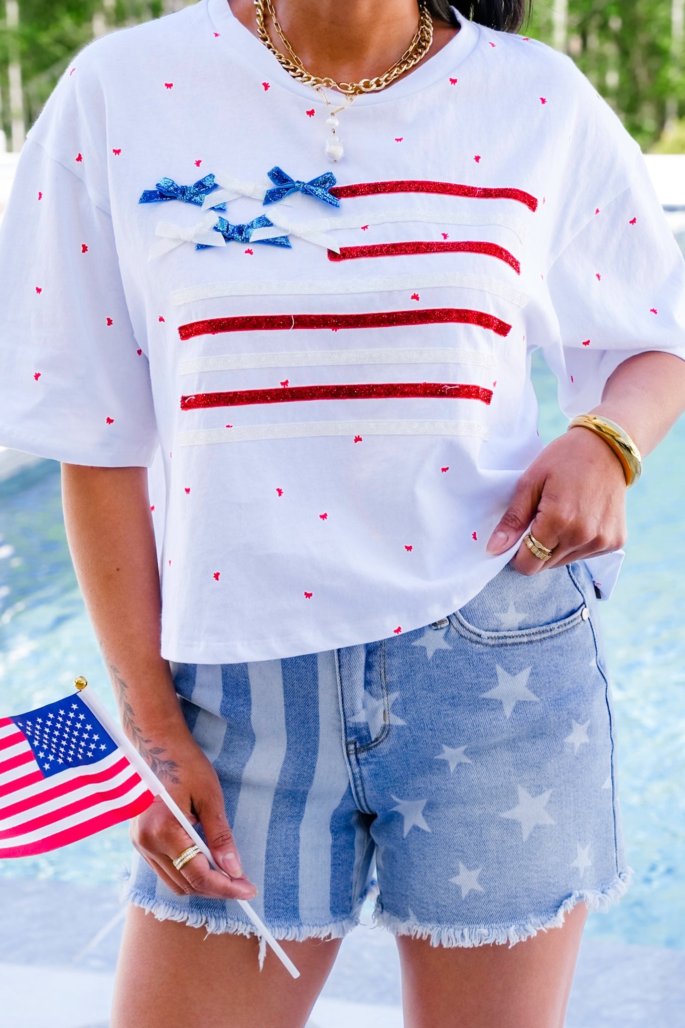 Short Sleeve Ribbon American Flag Top with Bow Detail