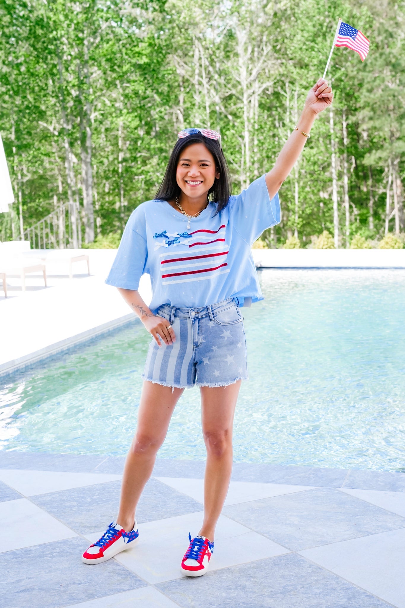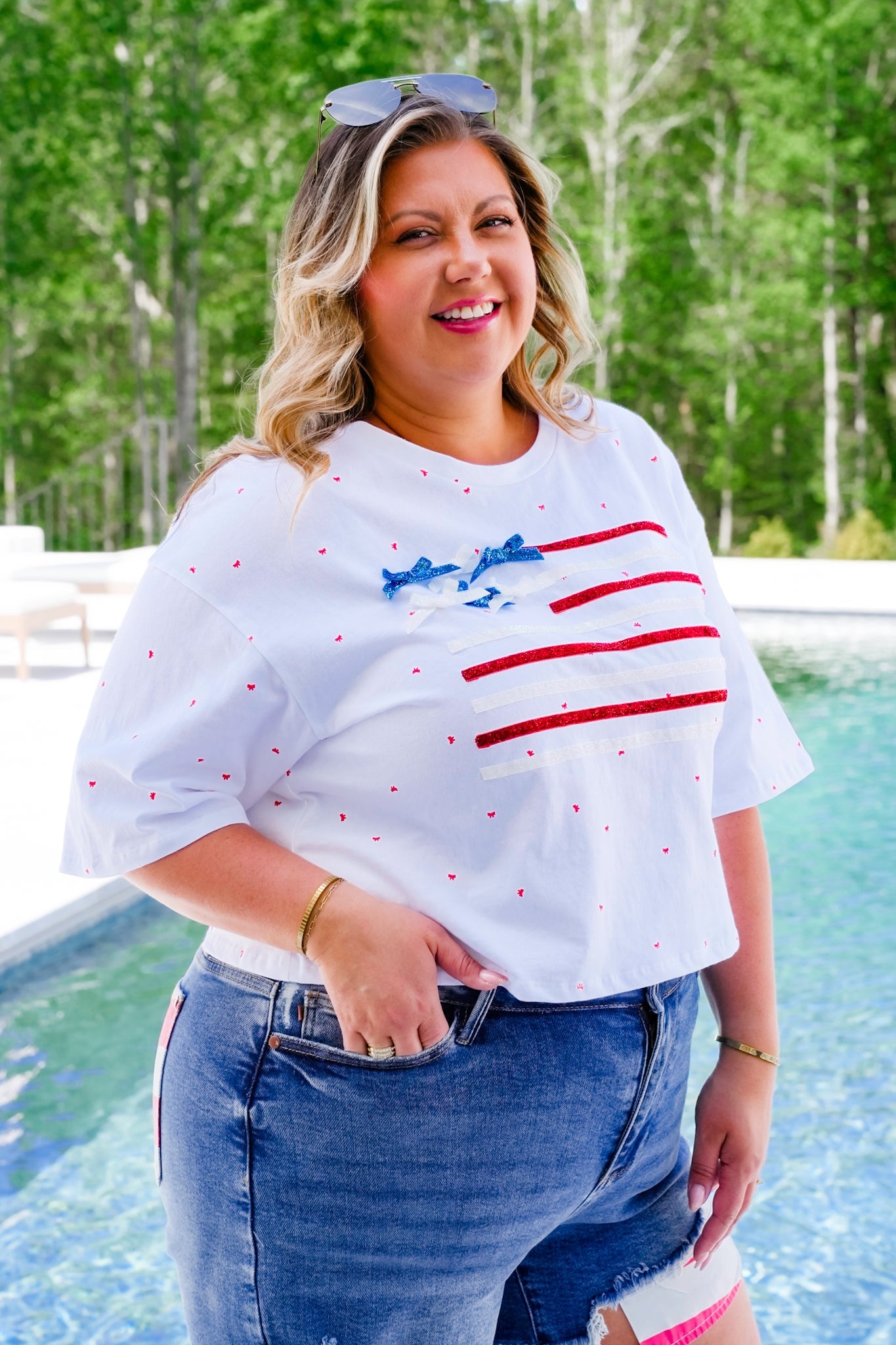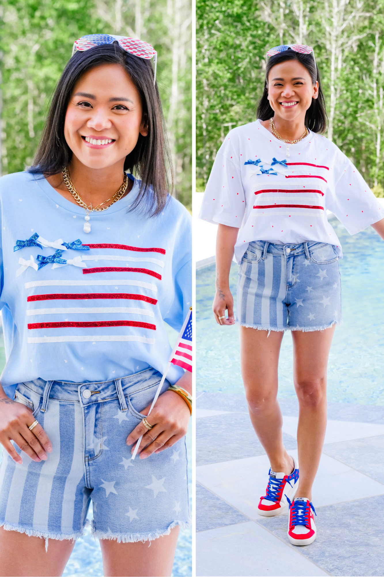Short Sleeve Ribbon American Flag Top with Bow Detail