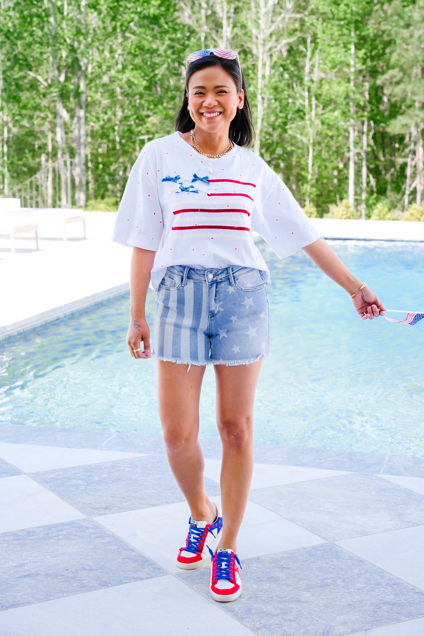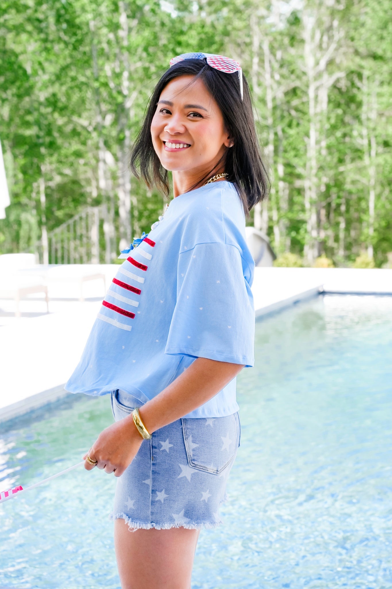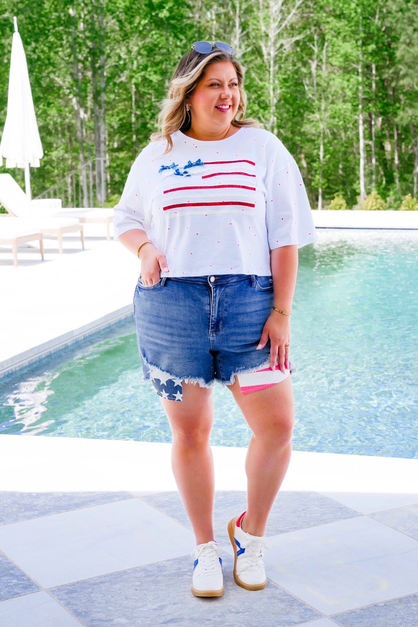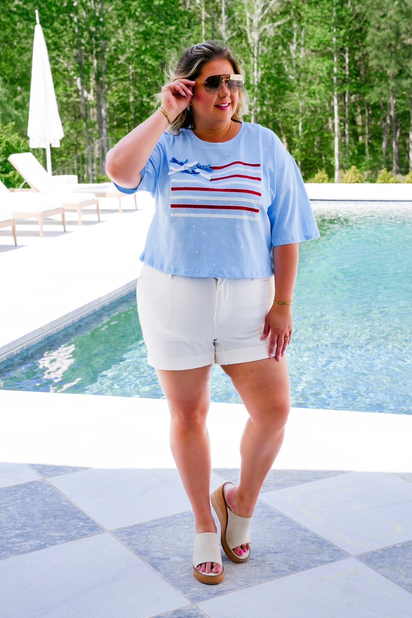 Short Sleeve Ribbon American Flag Top with Bow Detail
