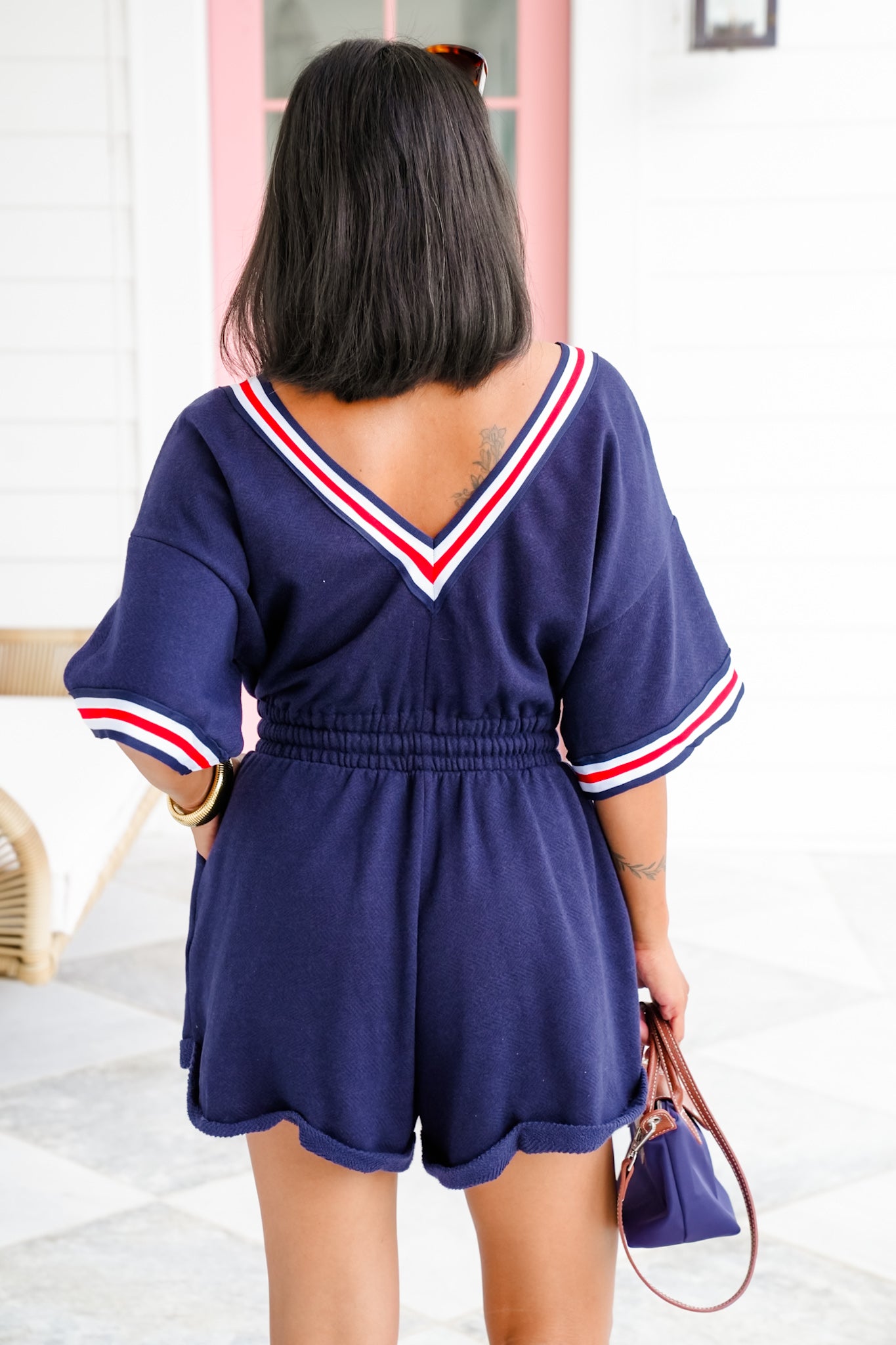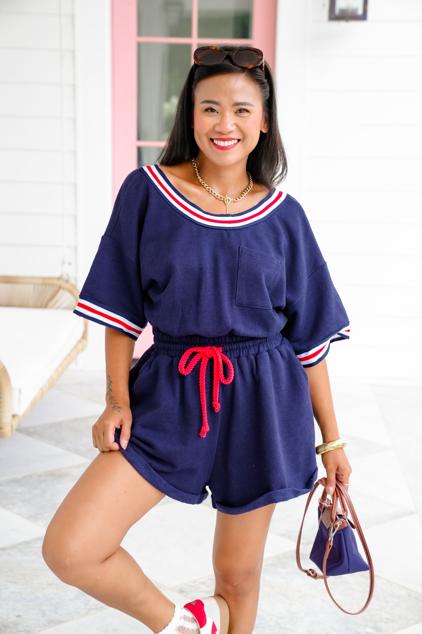 This romper has retro varsity energy in all the right ways! From the bold striped trim, wide short sleeves, functional drawstring waist, and surprise V back, it’s cute, comfortable, and ready for fun. Slide on your favorite sneakers and a denim jacket for an outfit that’s as easy as it is cute.