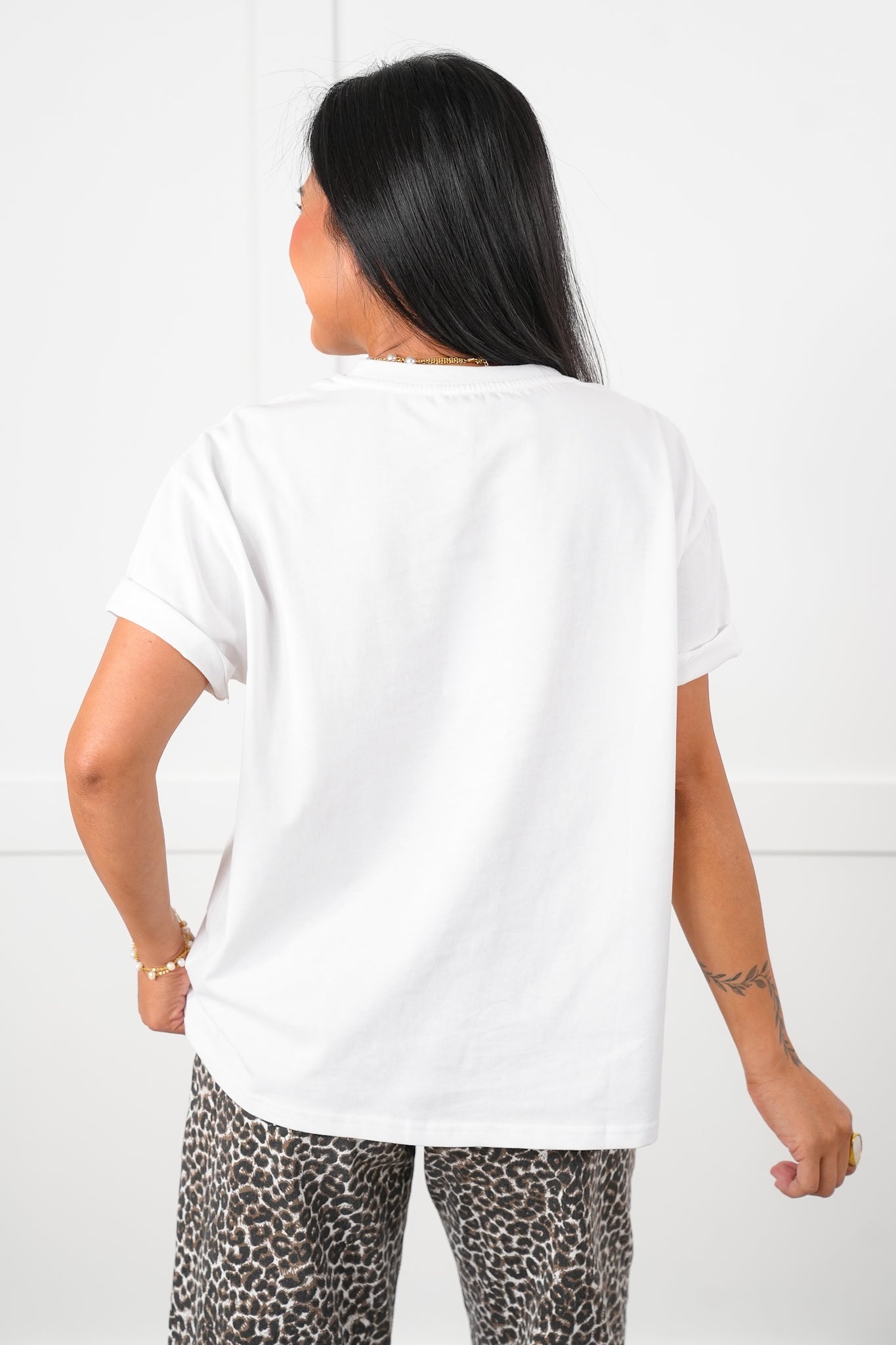 Time for a cocktail and some sunshine! This fun tee features an embroidered martini glass and a cactus – a nod to desert vibes with a dash of playfulness. Pair it with some denim or a cute skirt for a laid-back, vacation-ready look.
