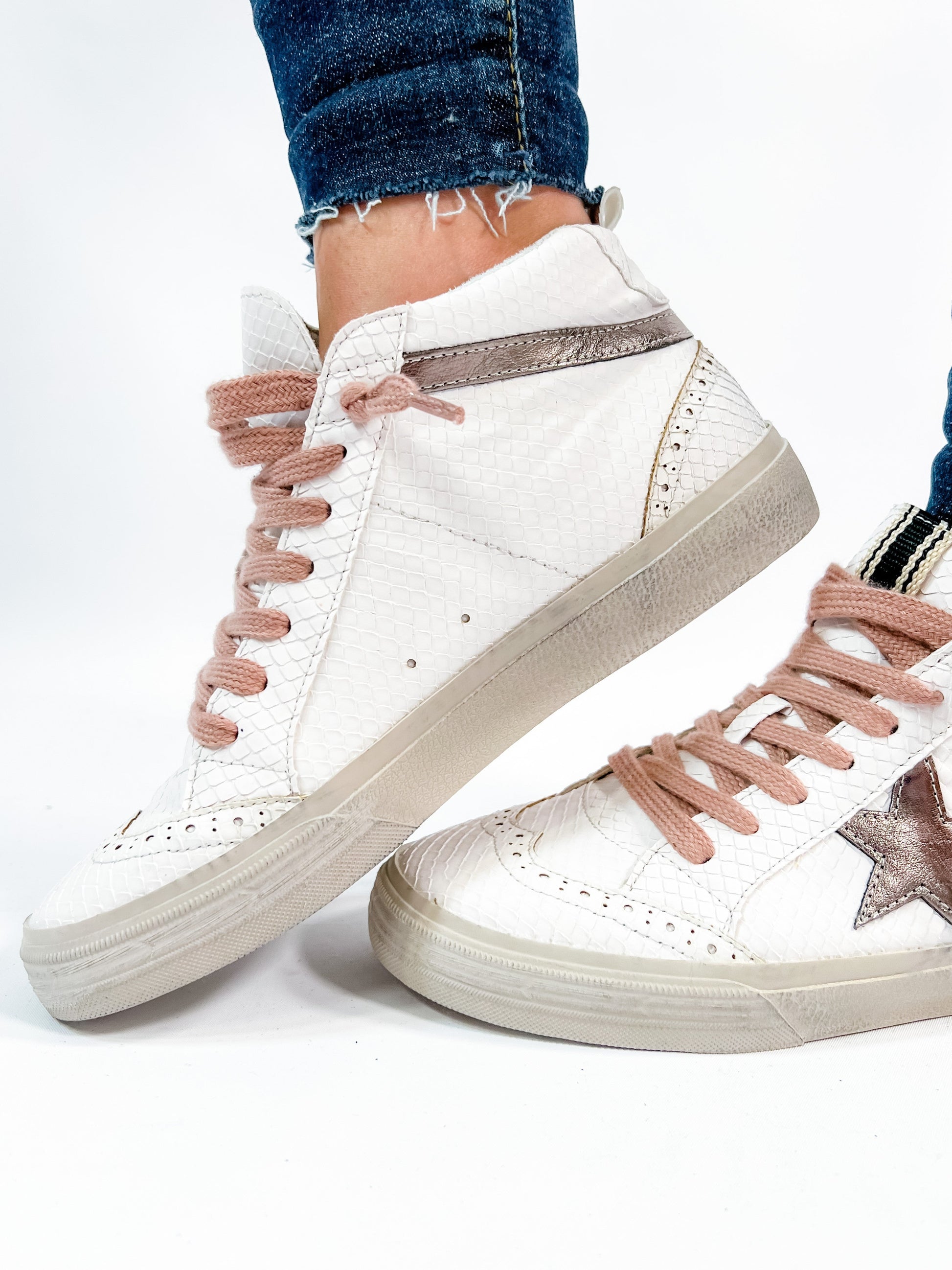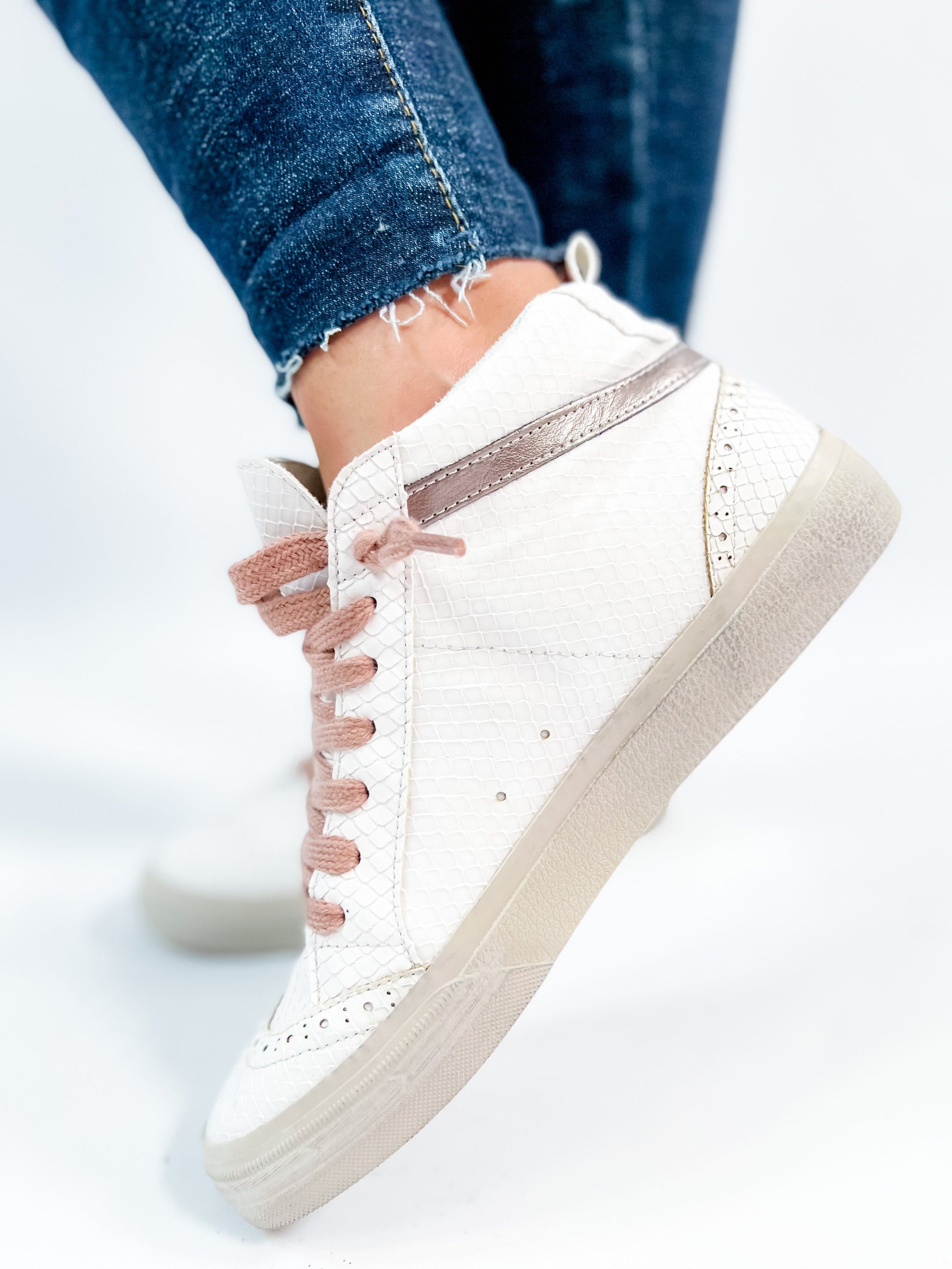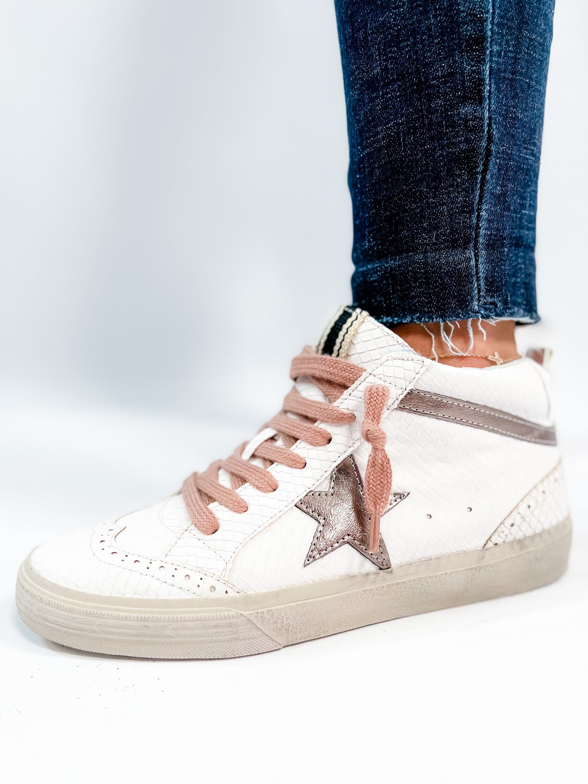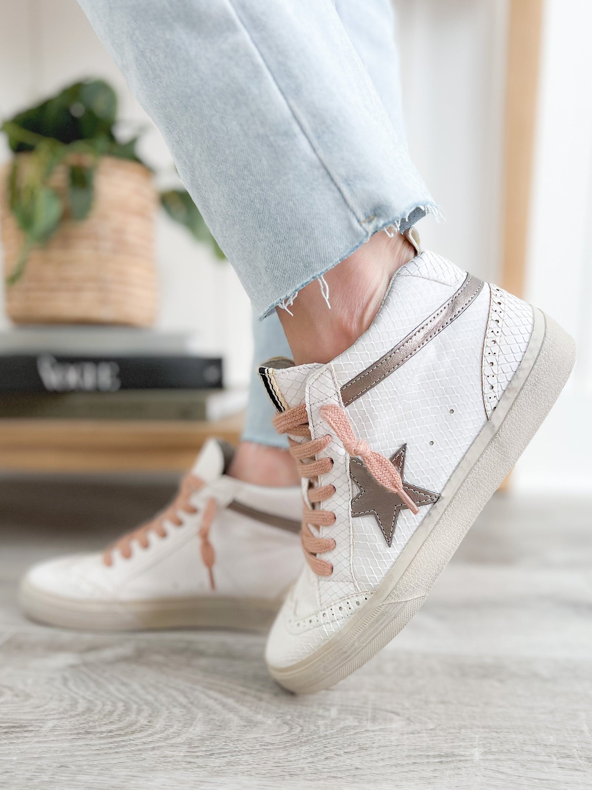 A sneaker that delivers on glam and game-day comfort? Yes, please! These Shu Shop hi-tops bring a fierce touch with snake texture and a metallic bronze star were inspired by vintage basketball kicks. The pink laces add a feminine punch without being over the top. Rock these with joggers, wide-leg jeans, or even a dress for that street-chic energy.