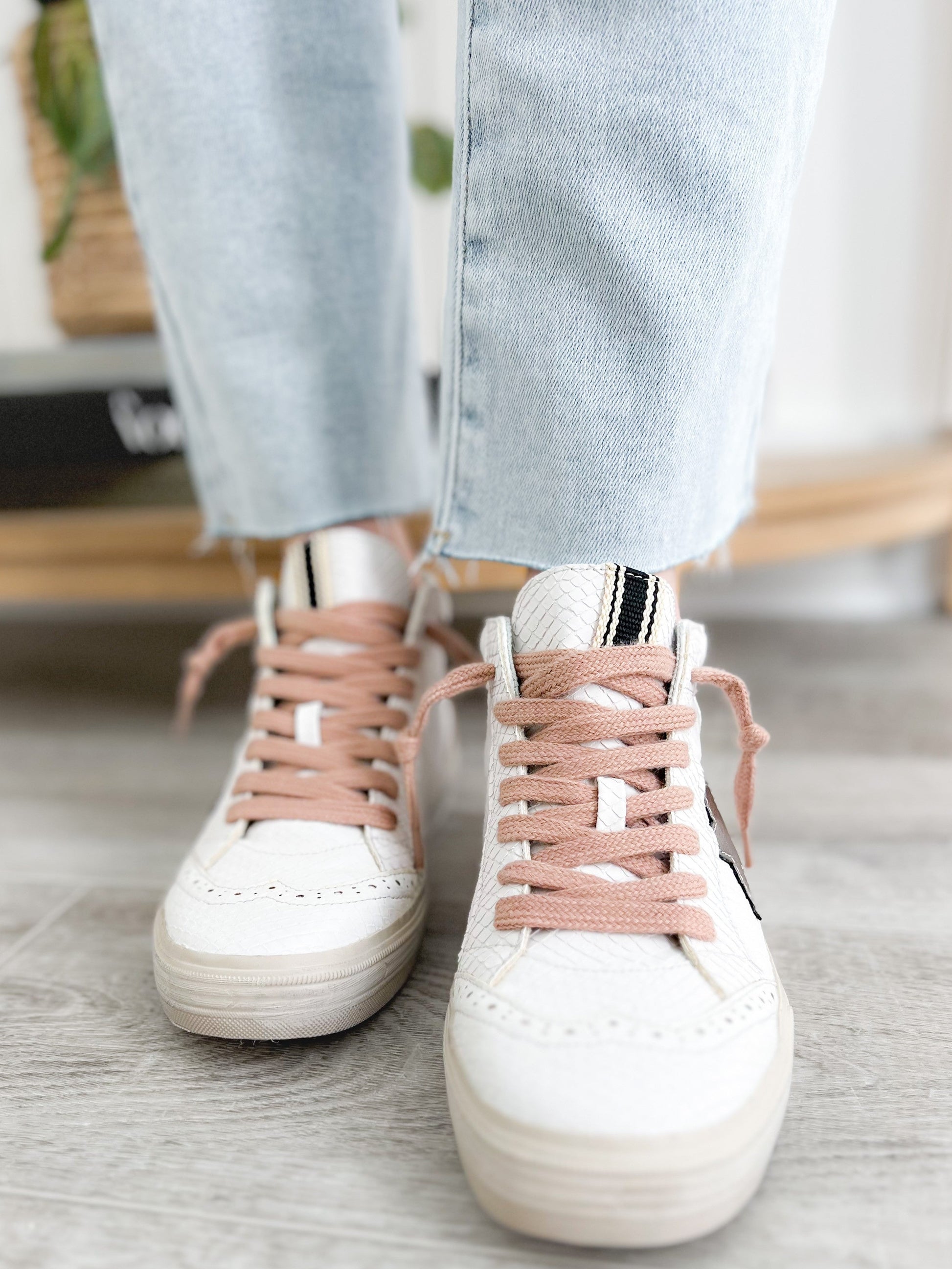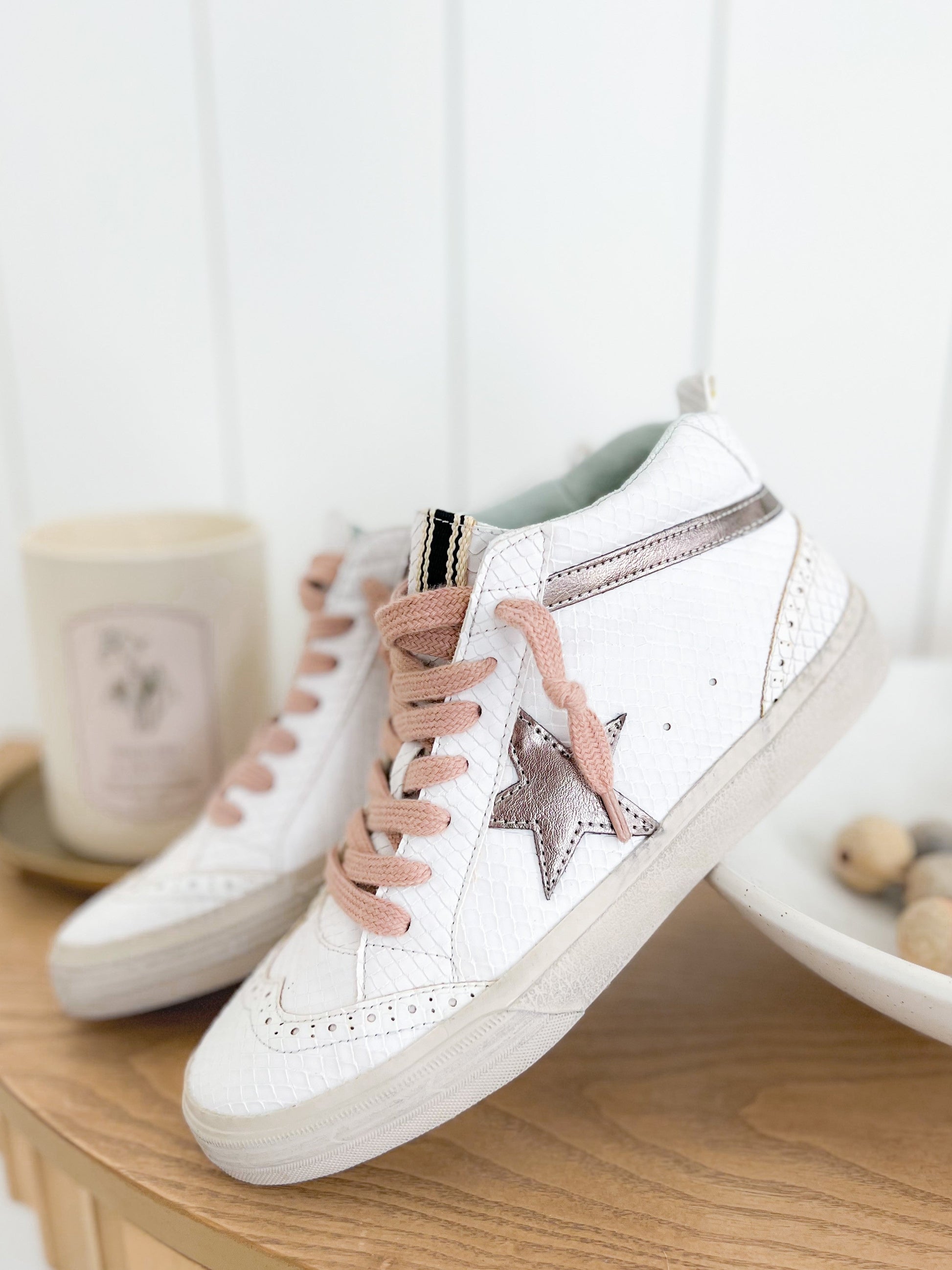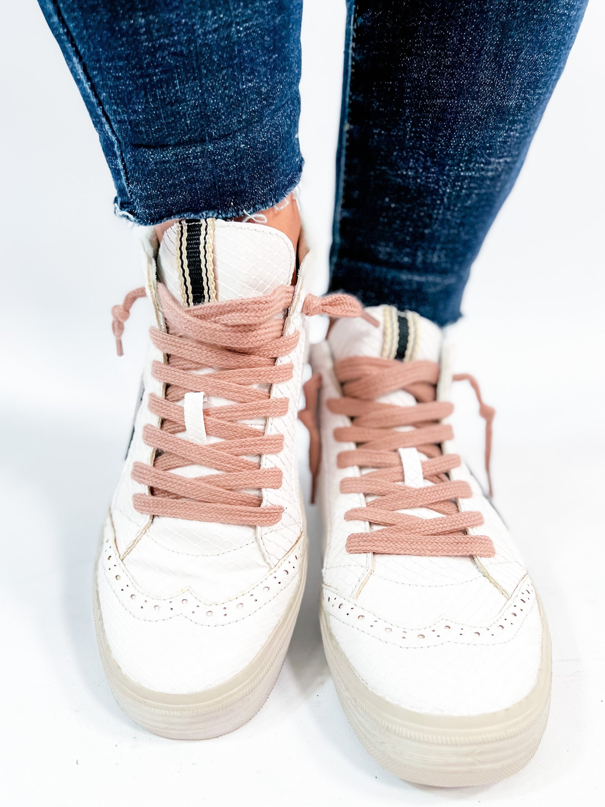 A sneaker that delivers on glam and game-day comfort? Yes, please! These Shu Shop hi-tops bring a fierce touch with snake texture and a metallic bronze star were inspired by vintage basketball kicks. The pink laces add a feminine punch without being over the top. Rock these with joggers, wide-leg jeans, or even a dress for that street-chic energy.