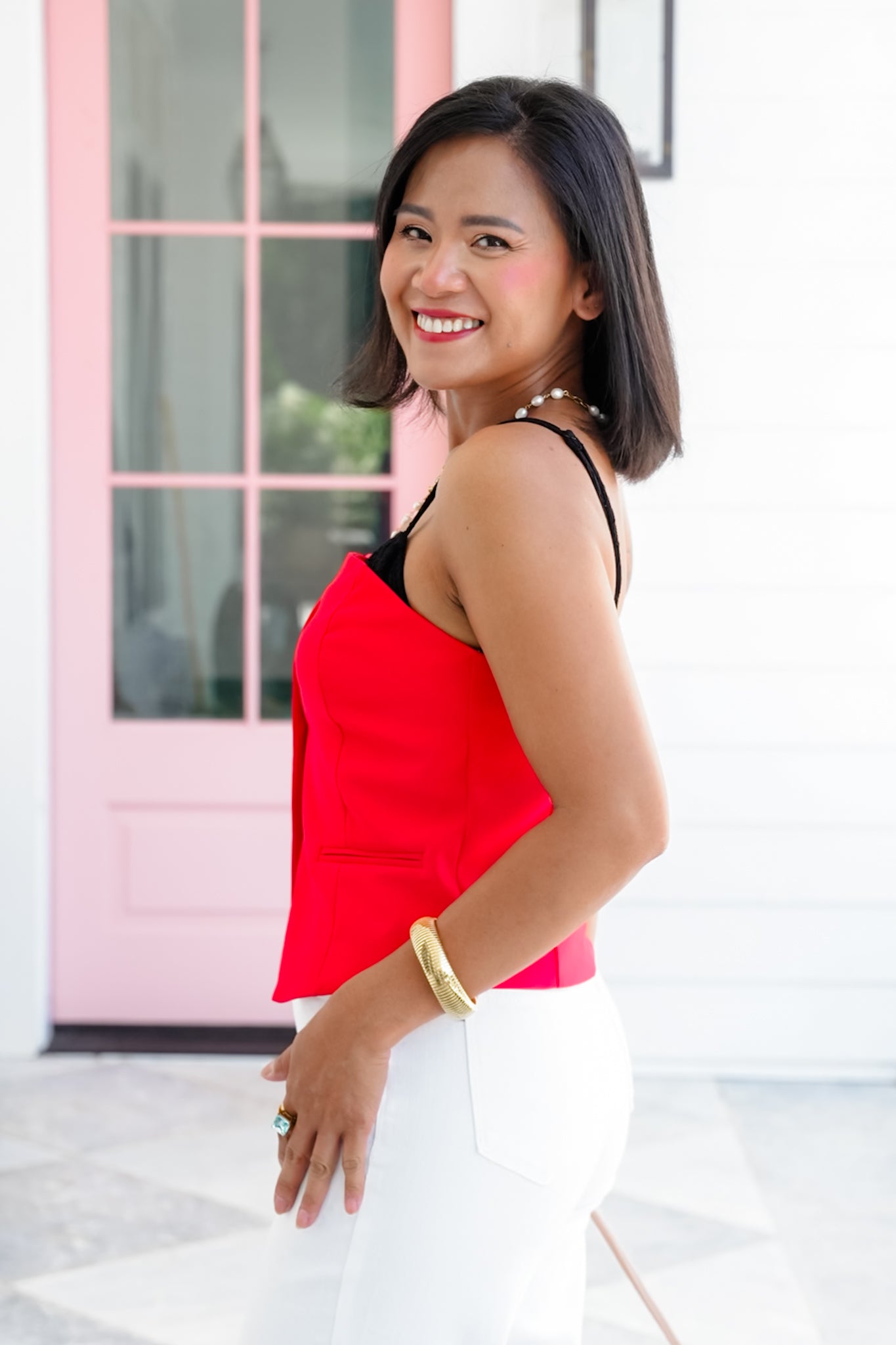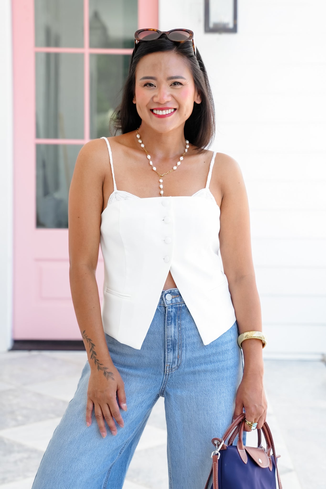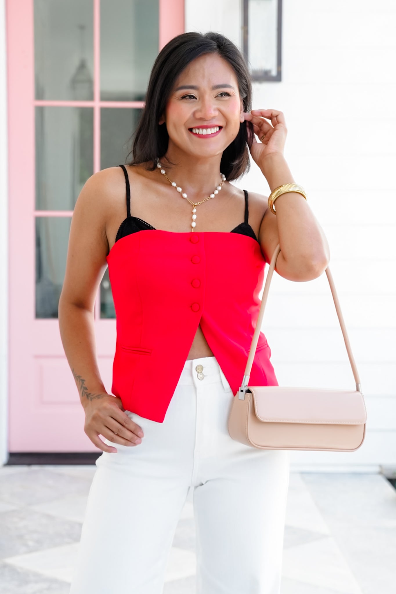 This top is modern elegance with a touch of sass. The layered silhouette and button front detail make it feel polished, while the adjustable straps let you fine-tune the fit. It’s structured through the body with a flared hem that flatters your waistline giving the illusion of an hourglass! Style it with trousers for work or denim and heels for a girls’ night out. This one turns heads every time.