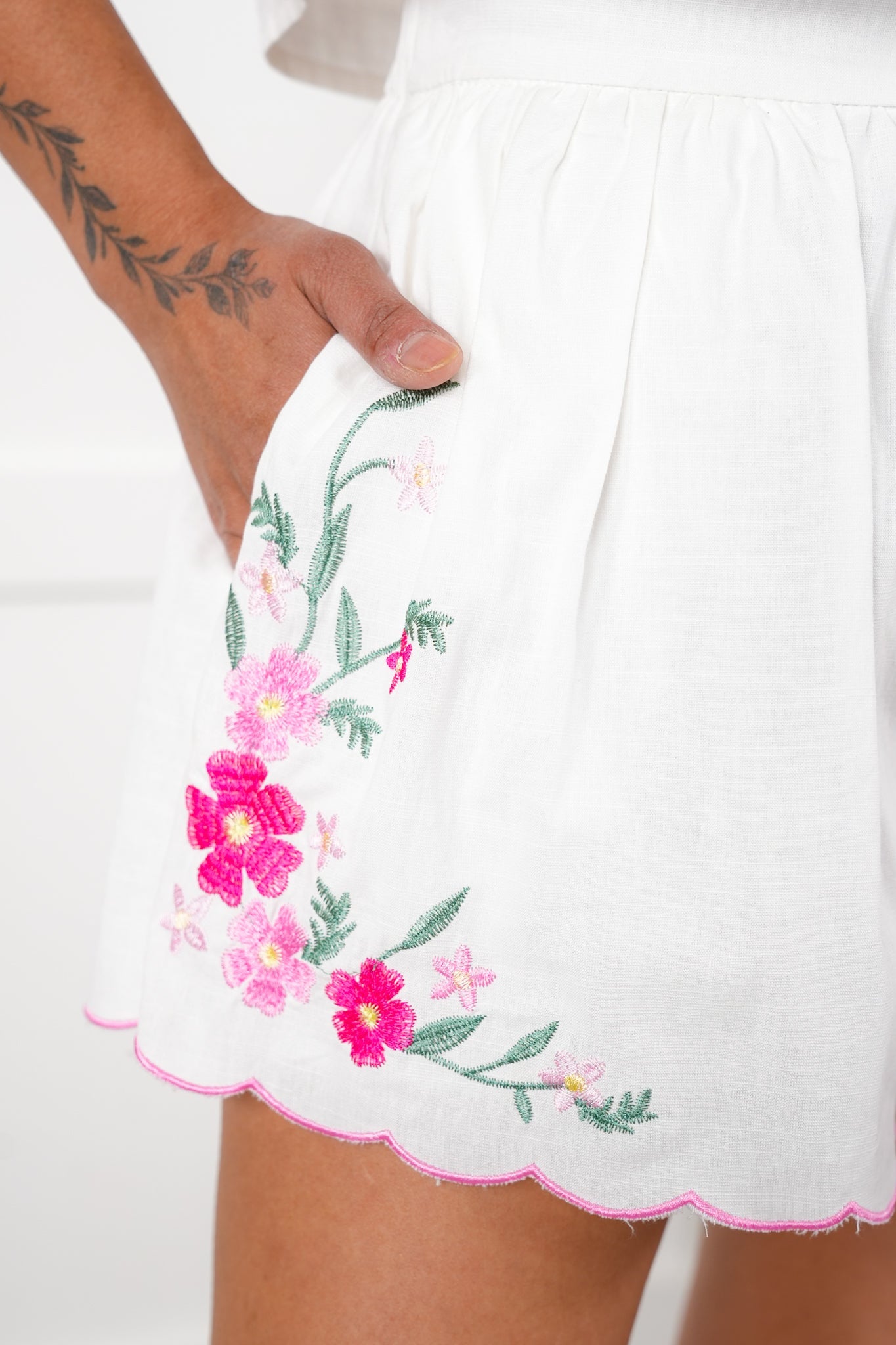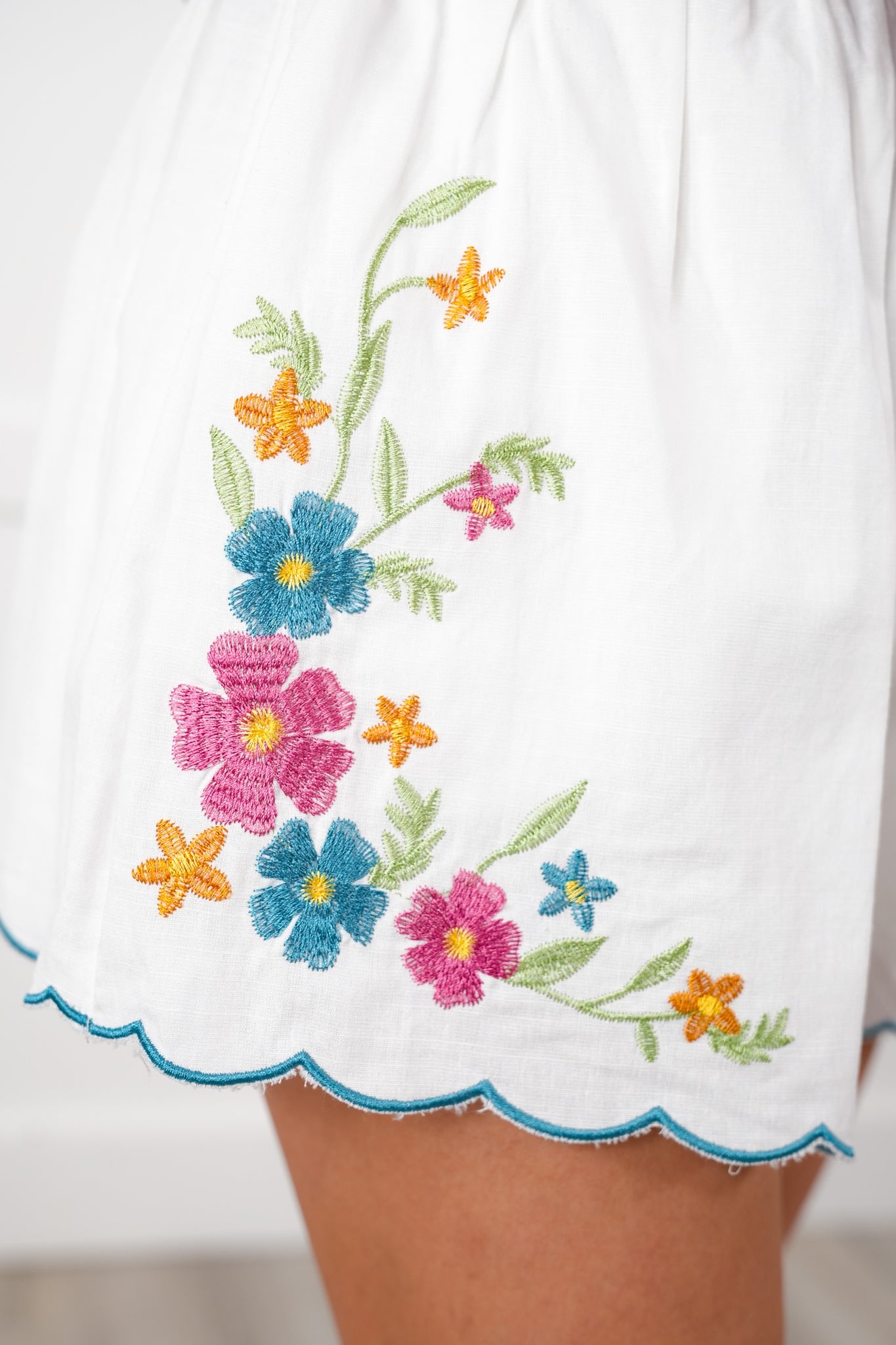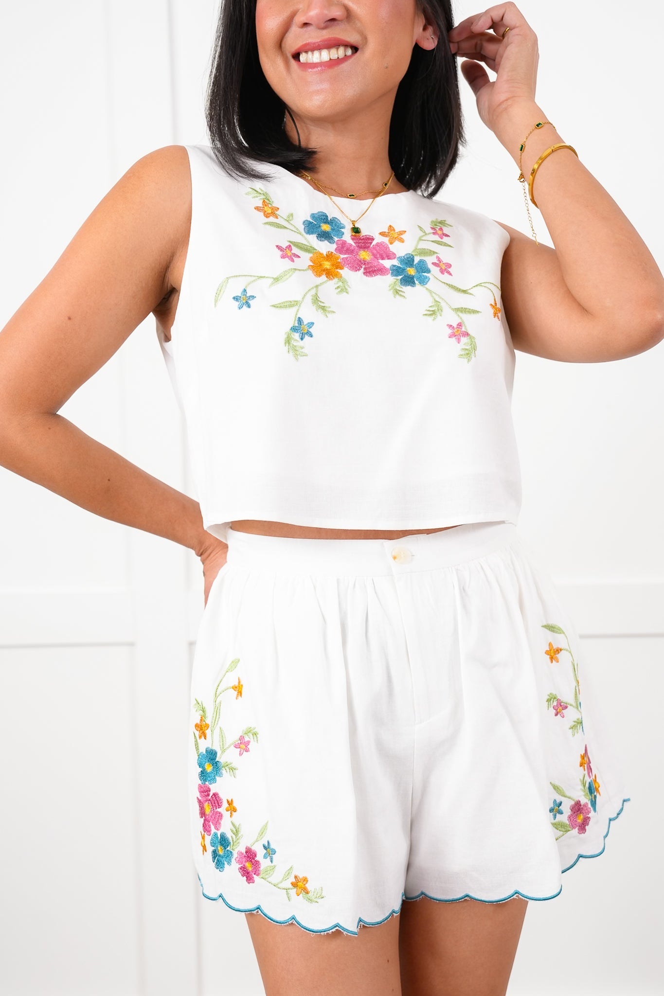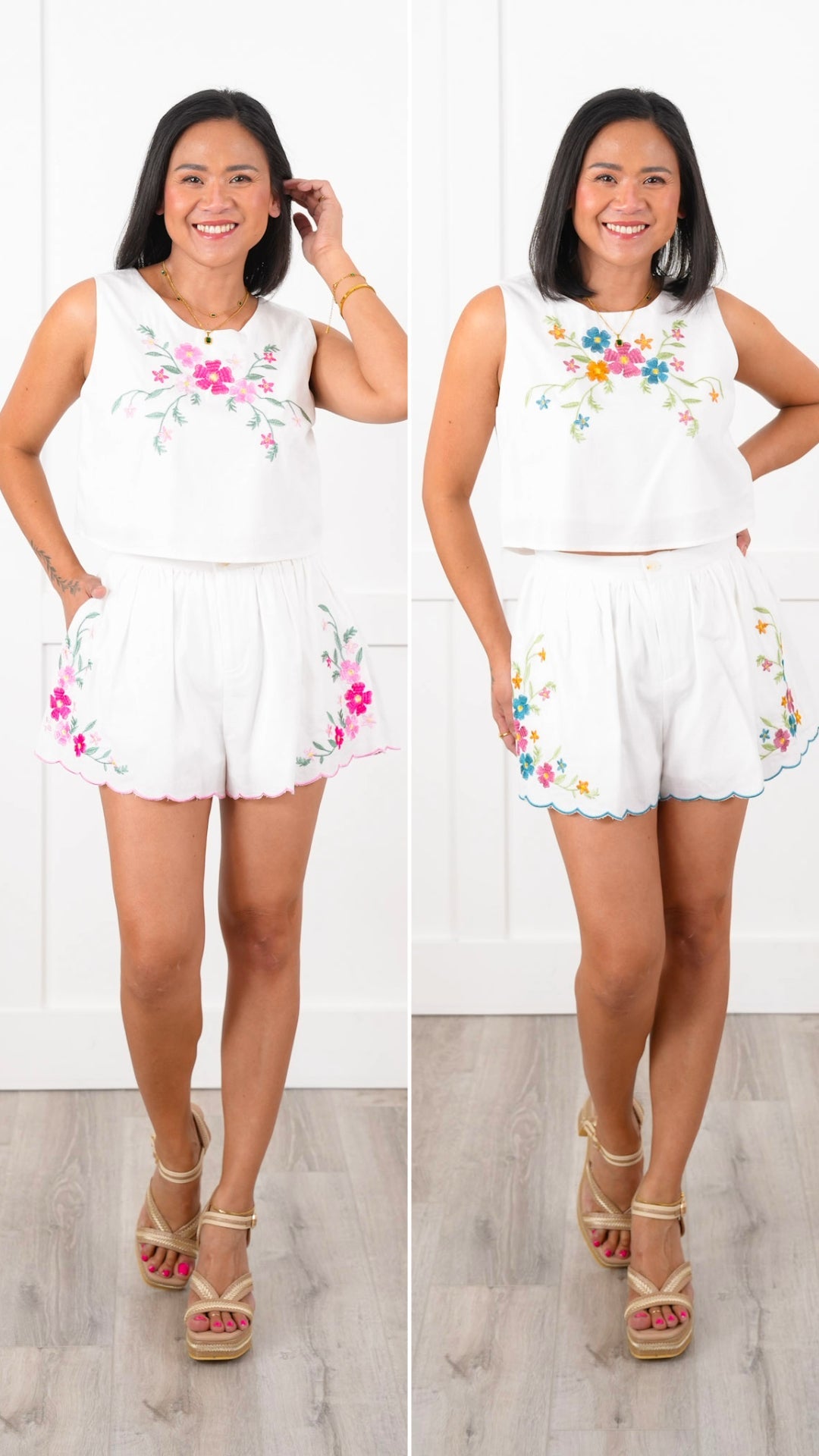 This charming floral set is perfect for a day out in the sun or a casual afternoon gathering. The bright floral embroidery adds a cheerful pop, while the airy shorts keep things breezy. Style this set with a cute pair of wedges or sandals for a fun, flirty look.