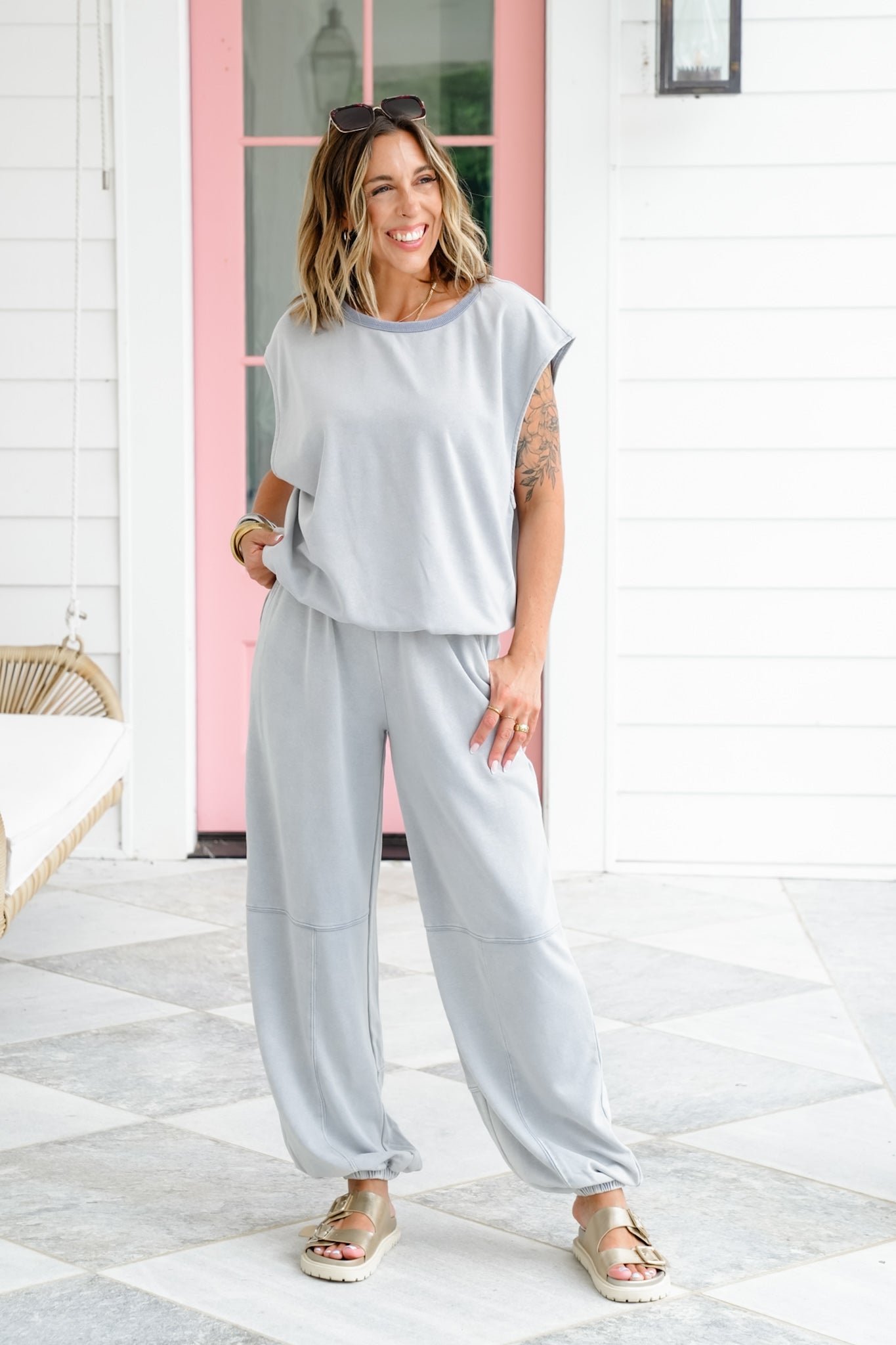 This laid-back matching set is the ultimate mix of chic and casual, featuring a sleeveless top with an airy open back and coordinating jogger-style pants. The soft drape of the fabric creates a flattering silhouette, while the functional drawstring and roomy pockets add everyday practicality. Style it with slides for a coffee run, or add sneakers for an on-the-go vibe.
