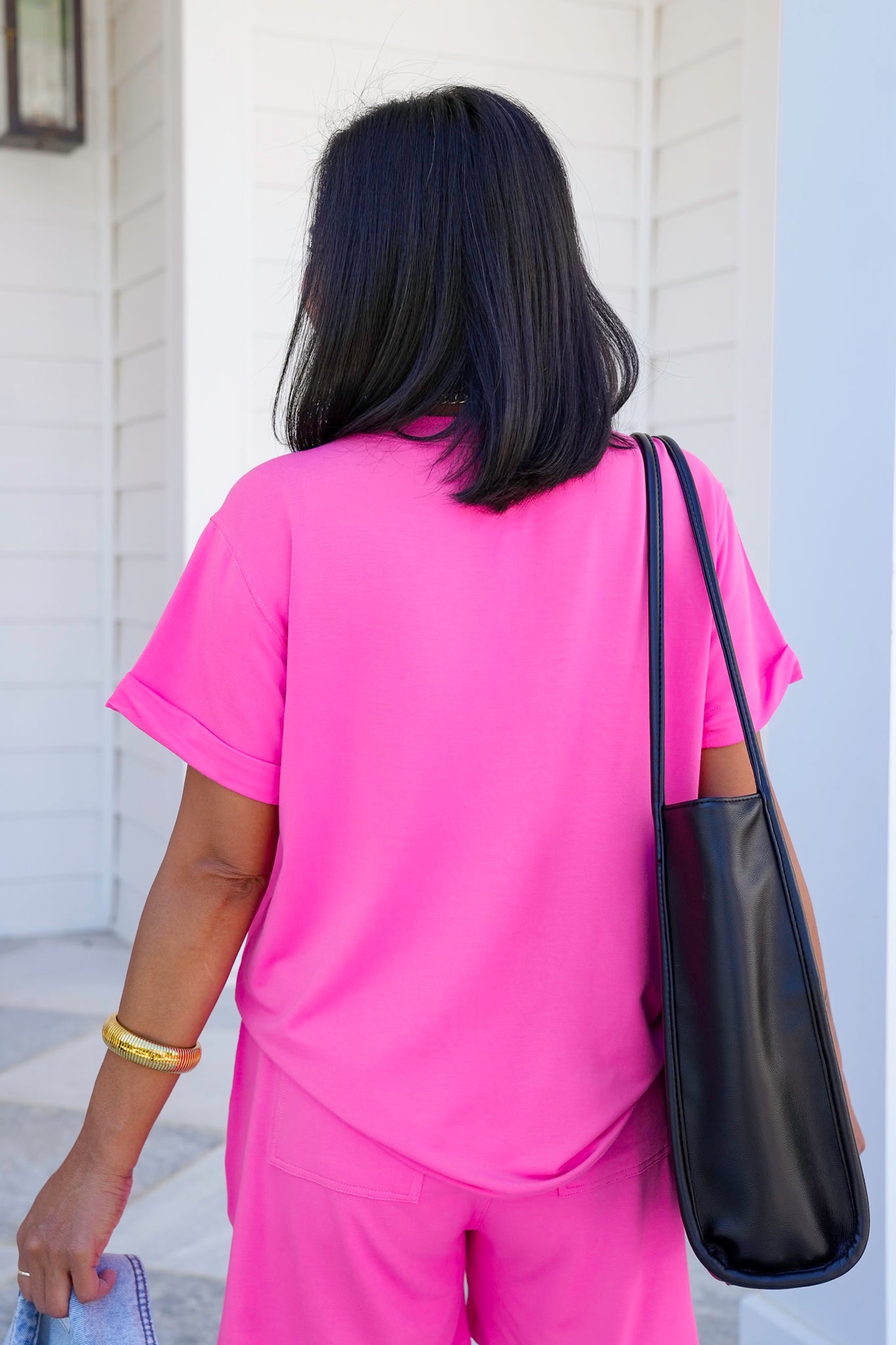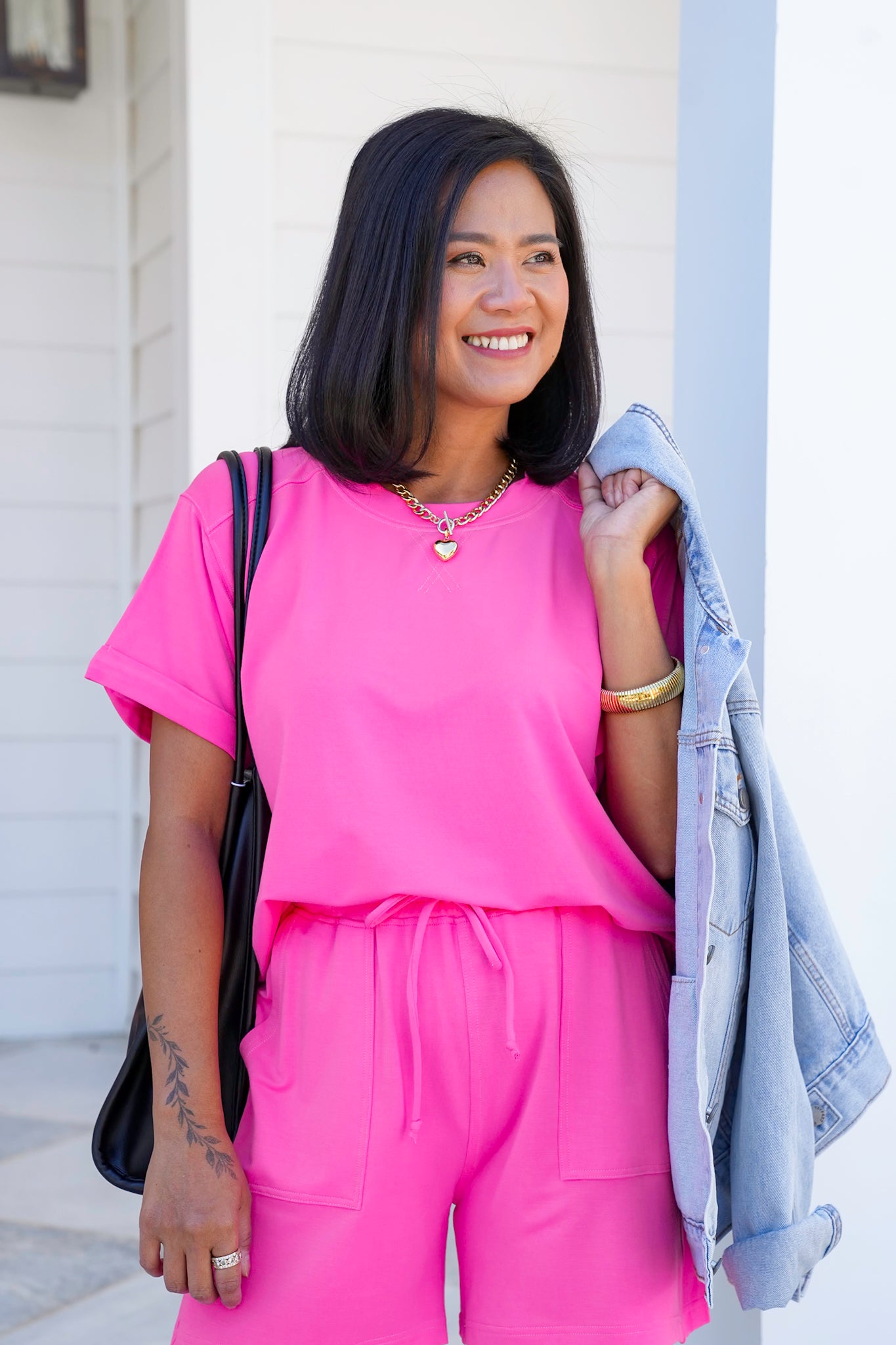 This short-sleeve top takes everyday basics to the next level. The silky French terry feels cool and luxe, draping in a way that makes it look instantly polished while still being as comfy as your favorite tee. It’s the kind of piece you’ll reach for when you want casual style that still looks pulled together. Perfect with denim shorts and sandals, tucked into trousers with a blazer, or paired with joggers for chic lounge vibes.