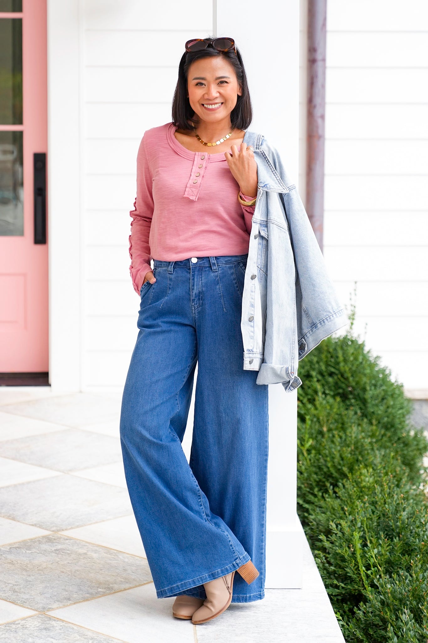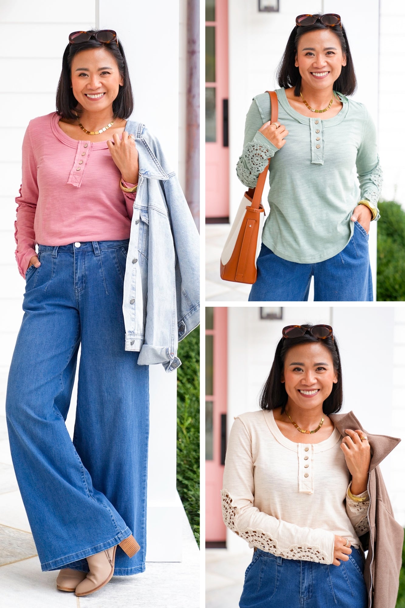 This lace-trim henley top blends everyday comfort with a hint of romance. The soft knit drapes beautifully, while the crochet detail on the sleeves adds a sweet, elevated finish. Dress it up with trousers and boots or keep it casual with denim and a cozy shacket for an effortlessly pretty fall look.
