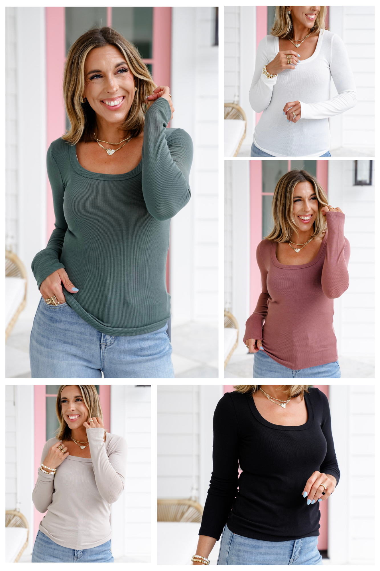 Solid Ribbed Long Sleeve Scoop Neck Top