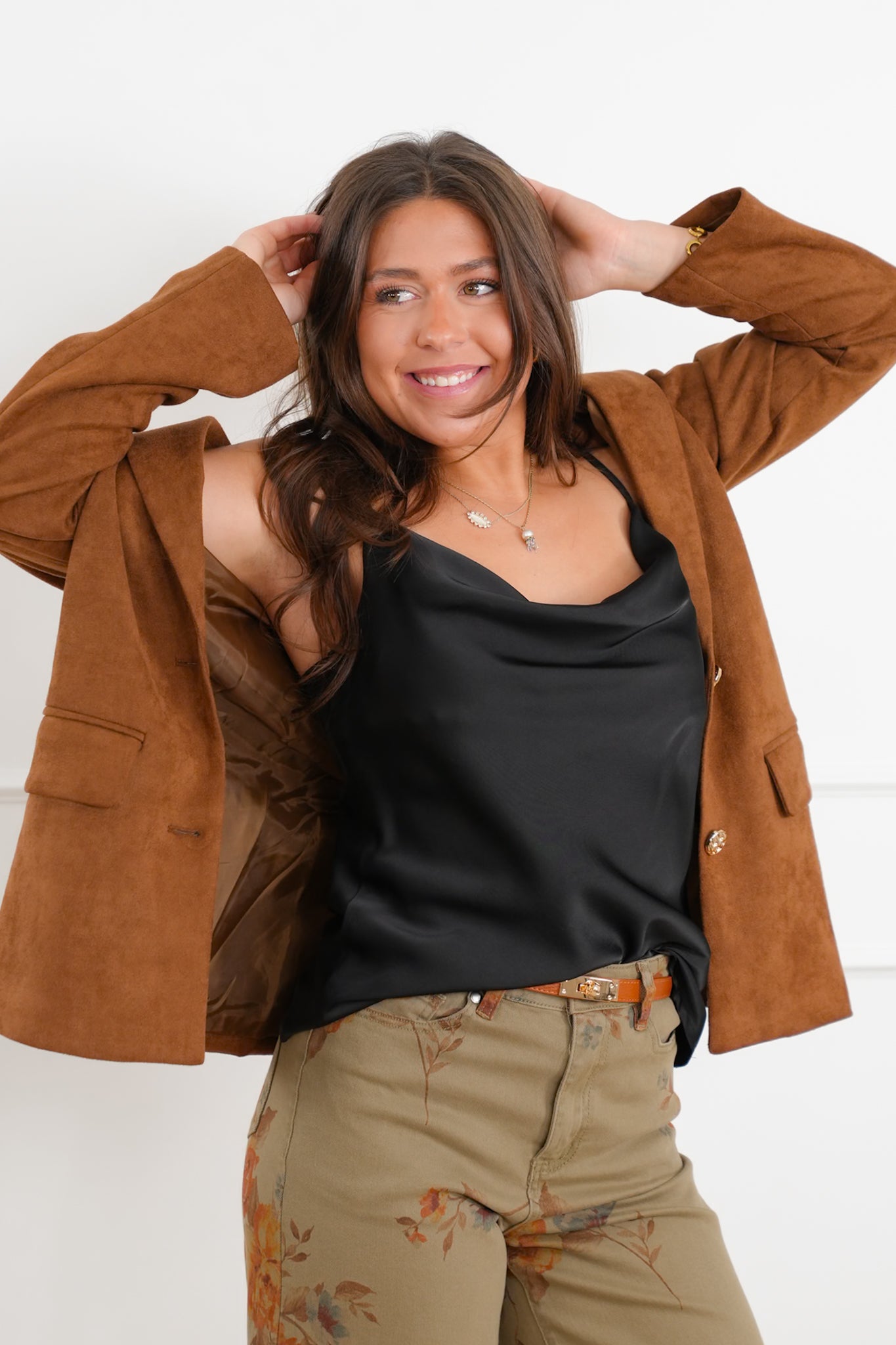 Smooth, luxe, and instantly elevating, this satin cami is the kind of piece that makes everything look better! The draped neckline gives it a soft, flattering shape while the satin finish adds just the right amount of shine. Adjustable straps let you customize the fit, and multiple color options mean you can build a collection. Layer it under a jacket for a polished moment or let it stand on its own with denim or dress pants for an easy dressed-up look!