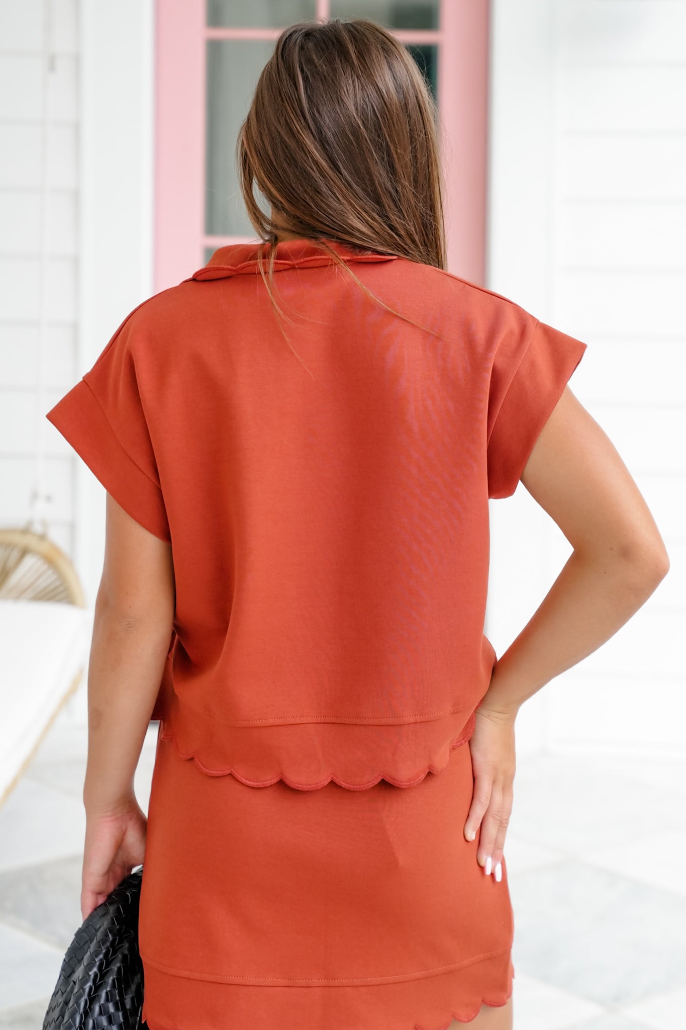 This top is all about elevated casual style. The scallop hem makes it stand out, while the snap button neckline lets you customize your look—wear it snapped for polish or undone for a more casual vibe. The relaxed silhouette makes it easy to front tuck into jeans, style with shorts, or wear with the coordinating skirt for that matching set look.
