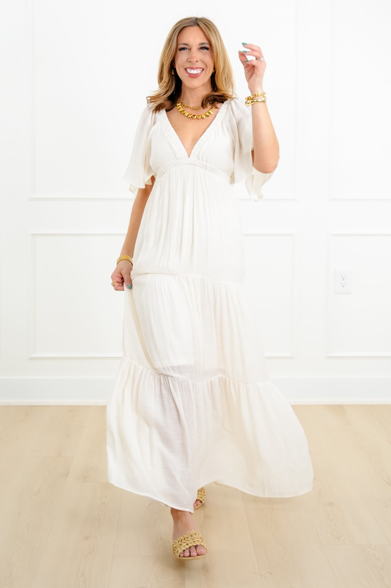 This maxi is the kind of dress you’ll reach for when you want something easy but still fun. The lightweight fabric flows into soft tiers that move beautifully as you walk, while the V-neckline keeps the look flattering. Flutter sleeves add a little extra movement, and the longer length gives it that breezy feel that pairs perfectly with sandals, wedges, or sneakers.