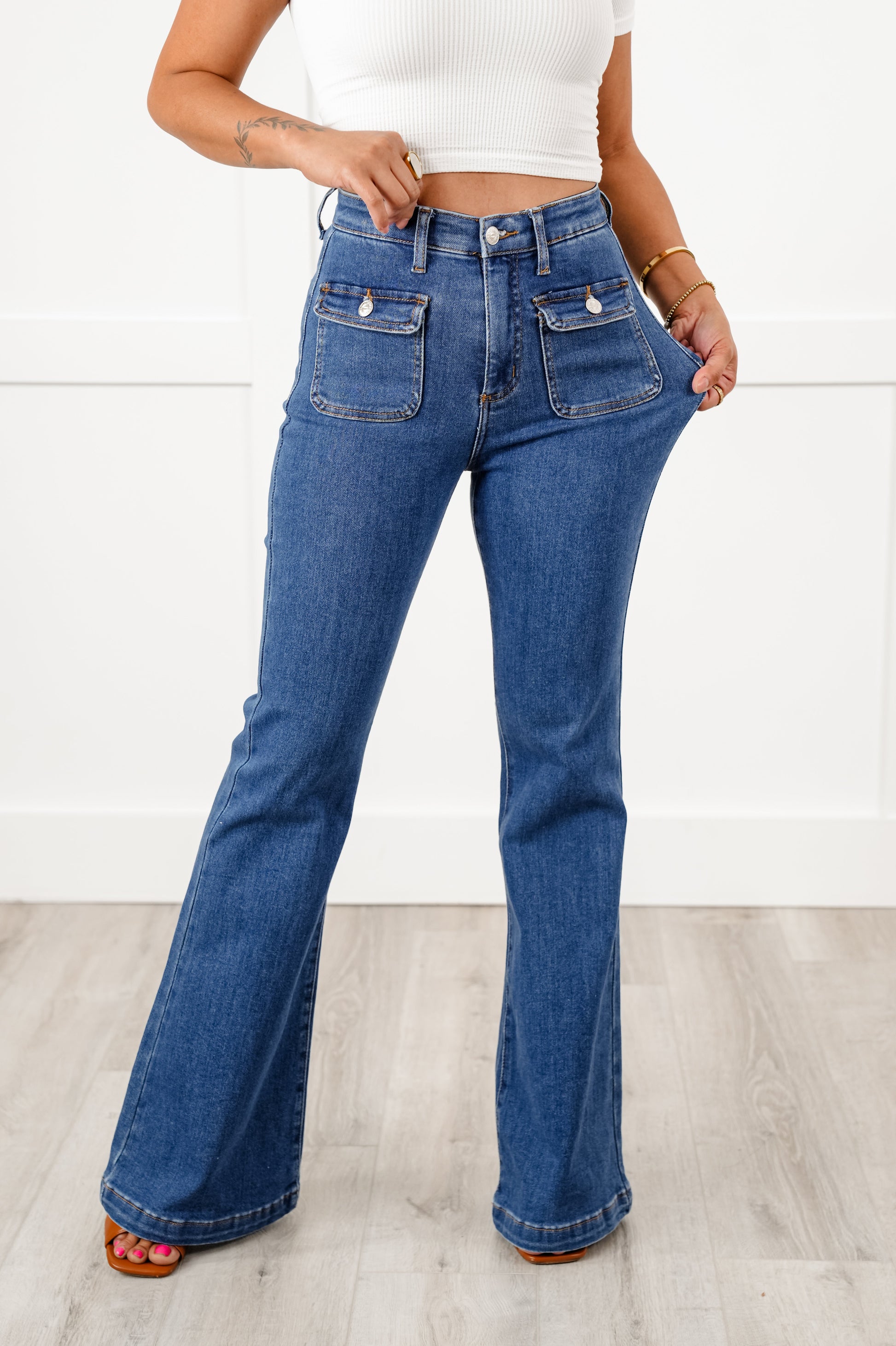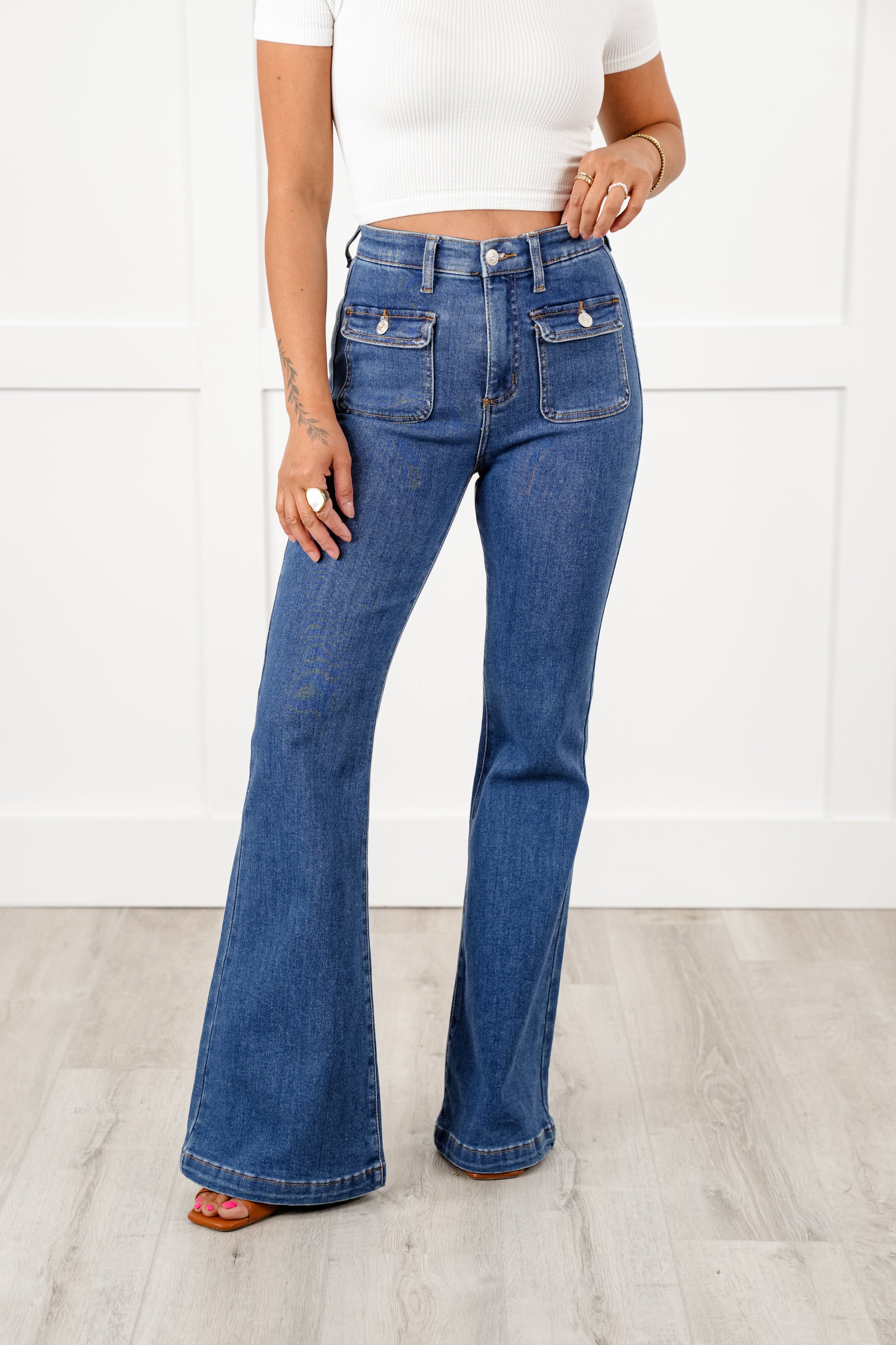 Special A High Rise Medium Wash Tummy Control Flare Jeans with Patch Pockets