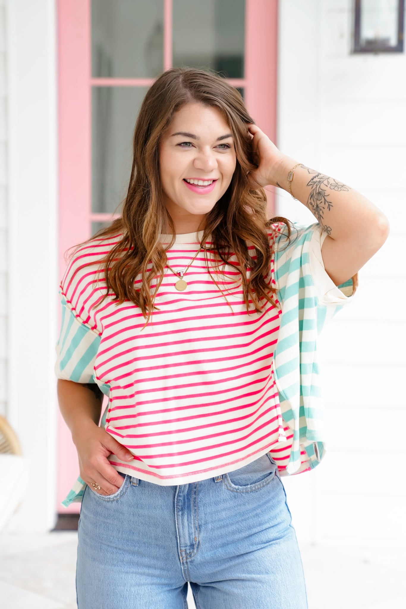This top brings a fun pop with its stripe color block design and laid-back shape. The pattern draws the eye while the fit stays comfortable and flattering. Style it with denim and sneakers for everyday wear or add shorts and slides for an easy weekend look.