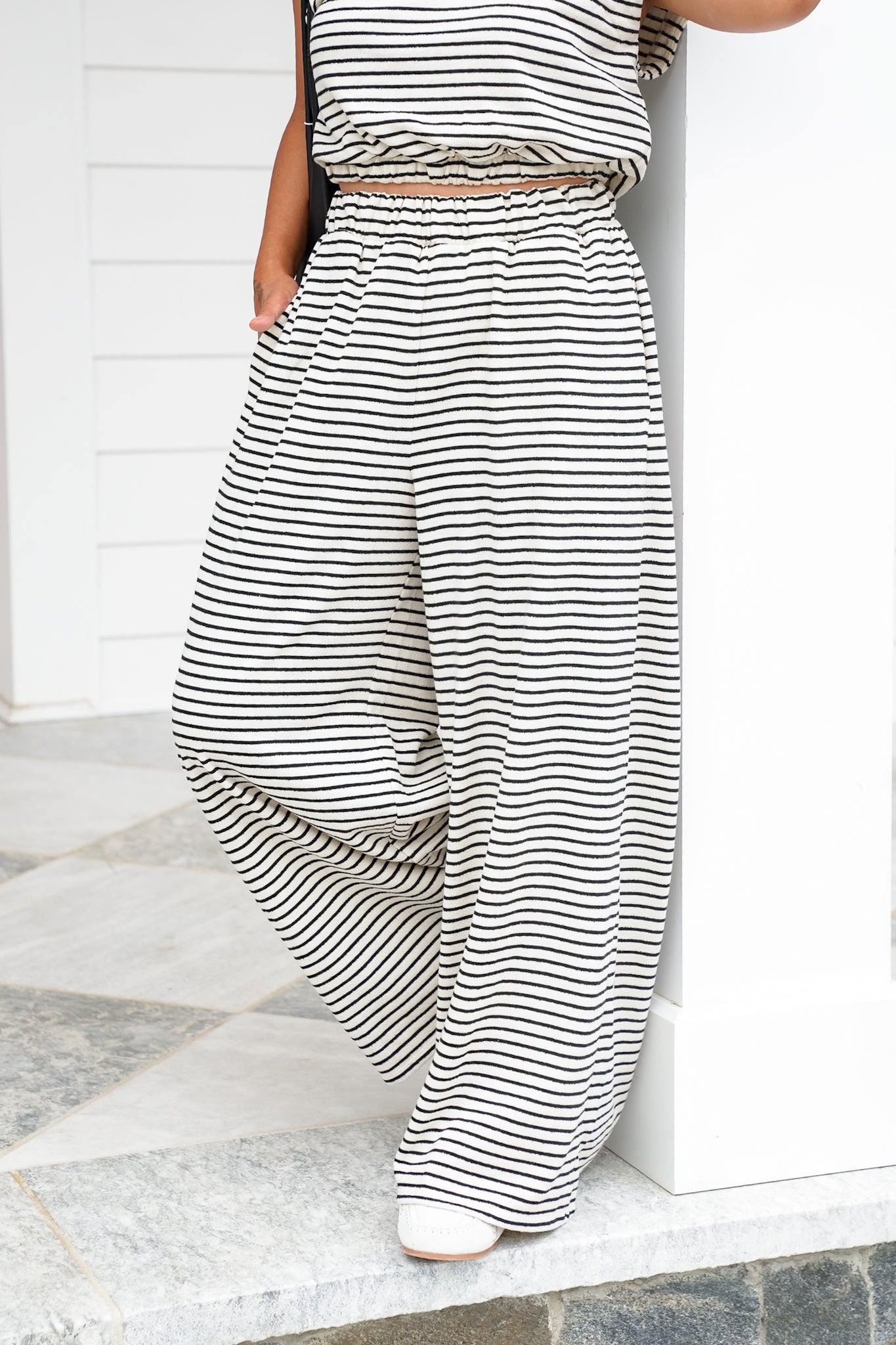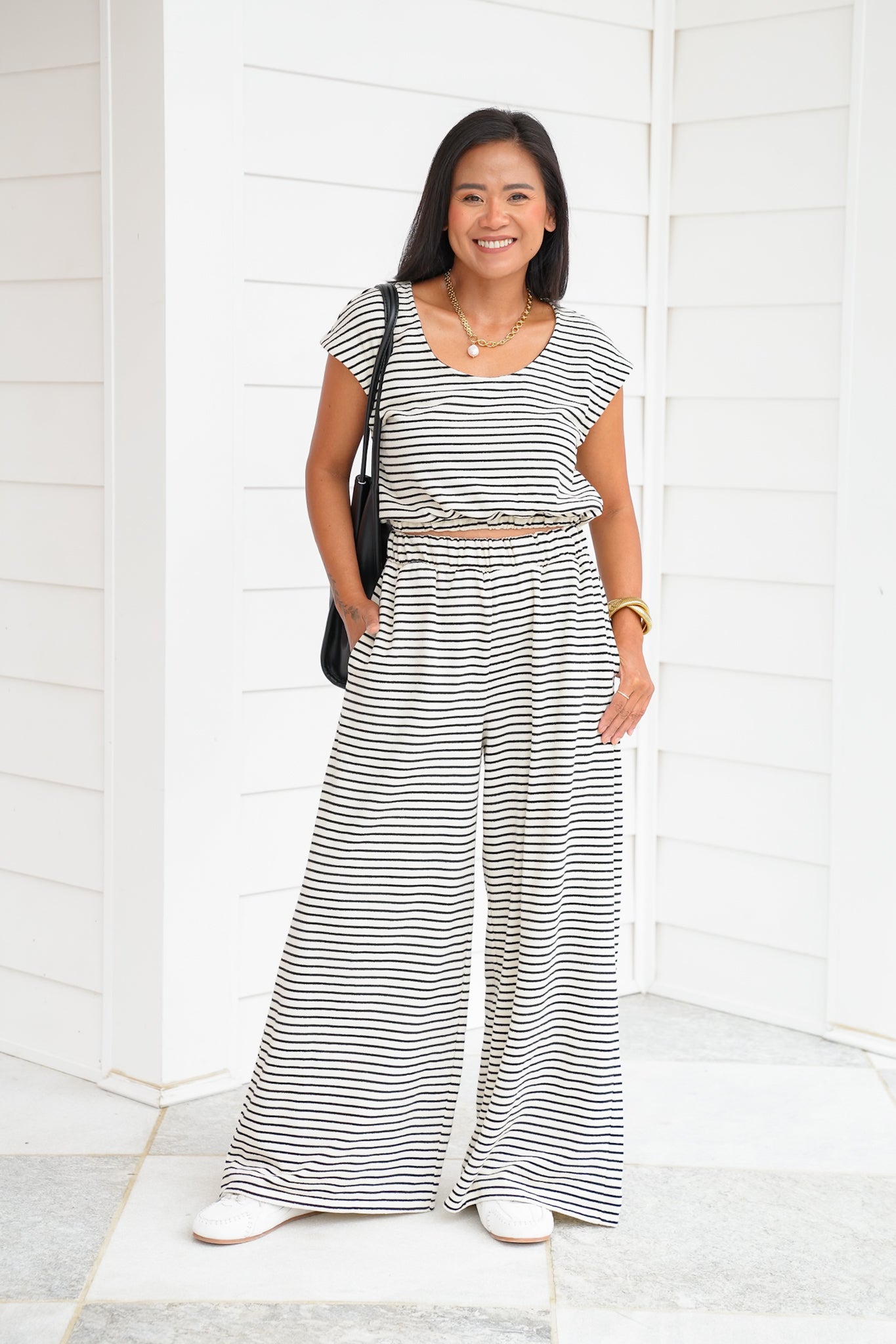 These striped wide leg pants are chic, comfy, and versatile all at once. They move beautifully and feel light as air, so you can wear them for lounging, errands, or dinner out. Pair them with the matching top for a polished set or toss on a simple tank and slides for an easy everyday outfit.