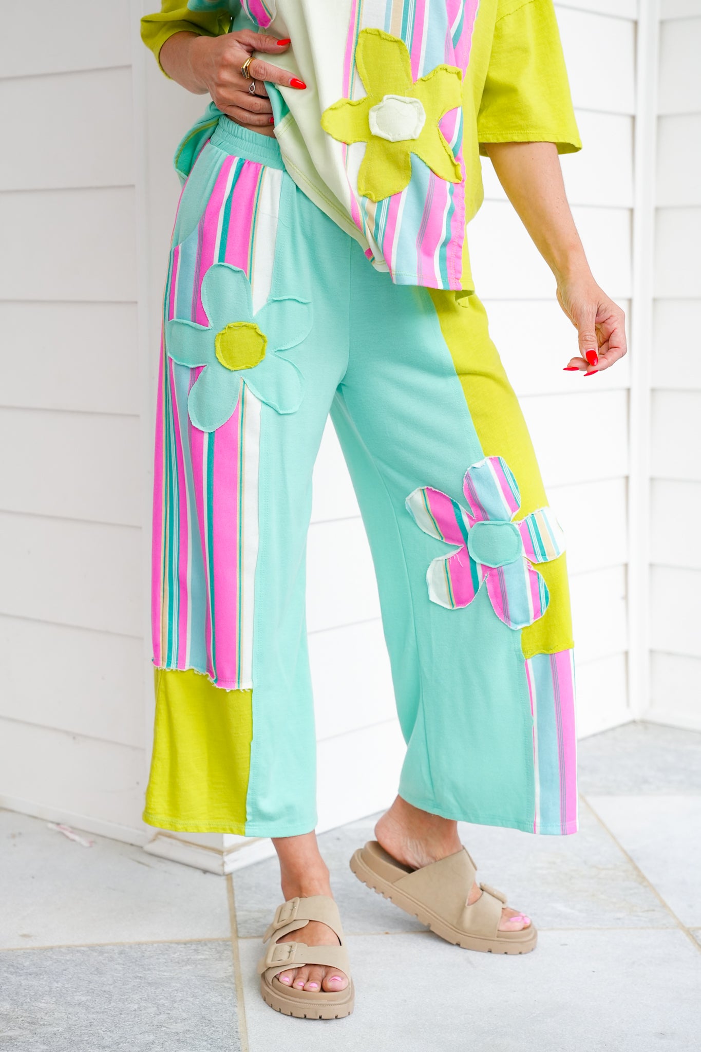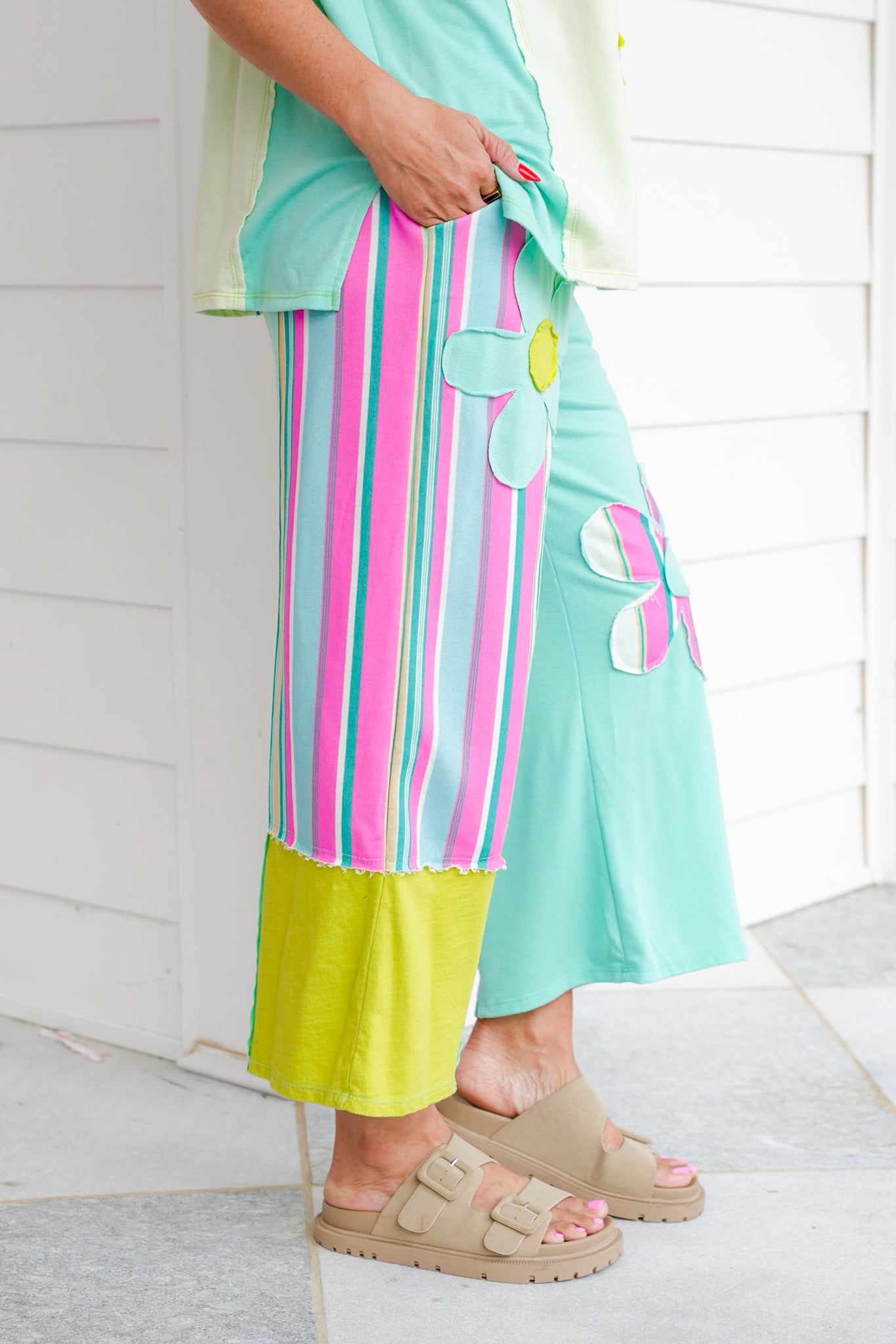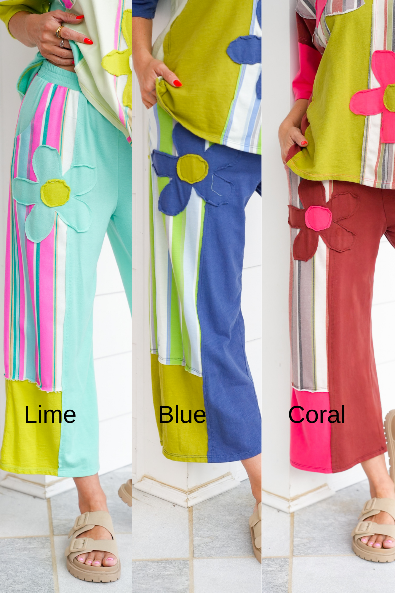 These pants are all about fun, comfort, and personality. The colorful flower patches bring a retro, artsy vibe while the striped panels add a boutique flair. Pair them with the matching top for a head-turning set, or keep it casual with a solid tee and slides for everyday wear.