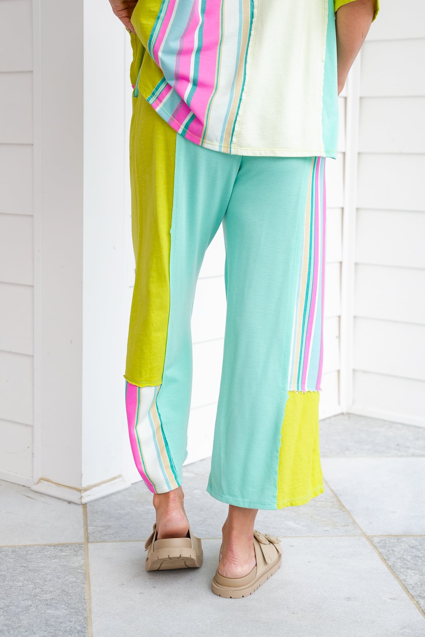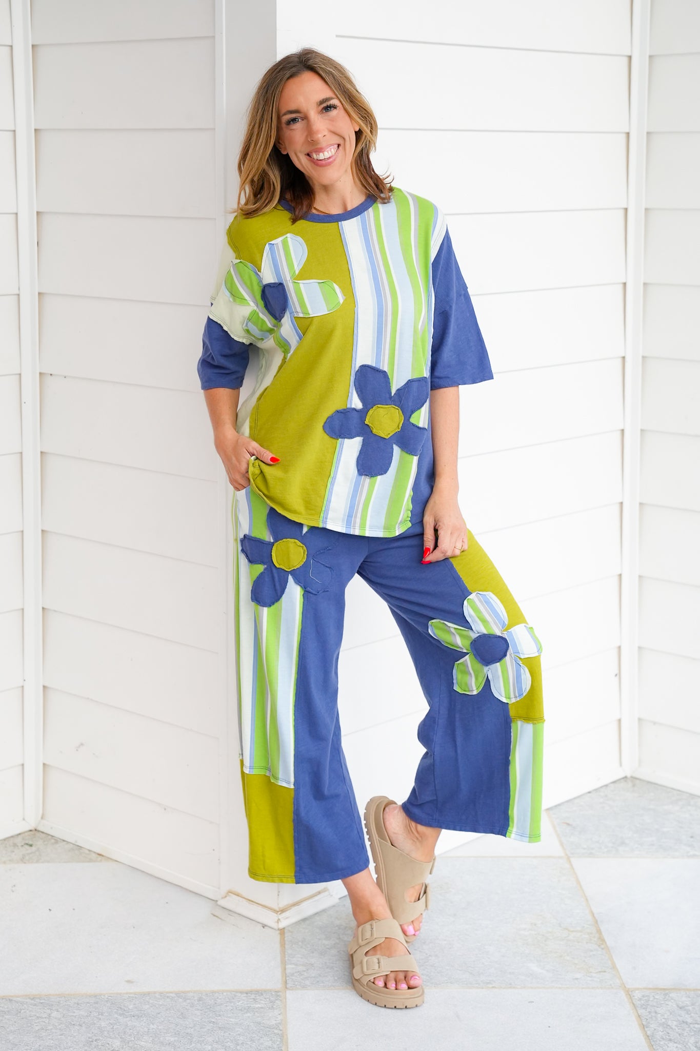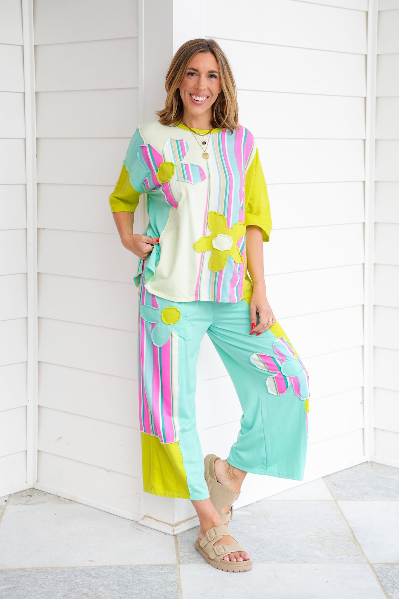 These pants are all about fun, comfort, and personality. The colorful flower patches bring a retro, artsy vibe while the striped panels add a boutique flair. Pair them with the matching top for a head-turning set, or keep it casual with a solid tee and slides for everyday wear.
