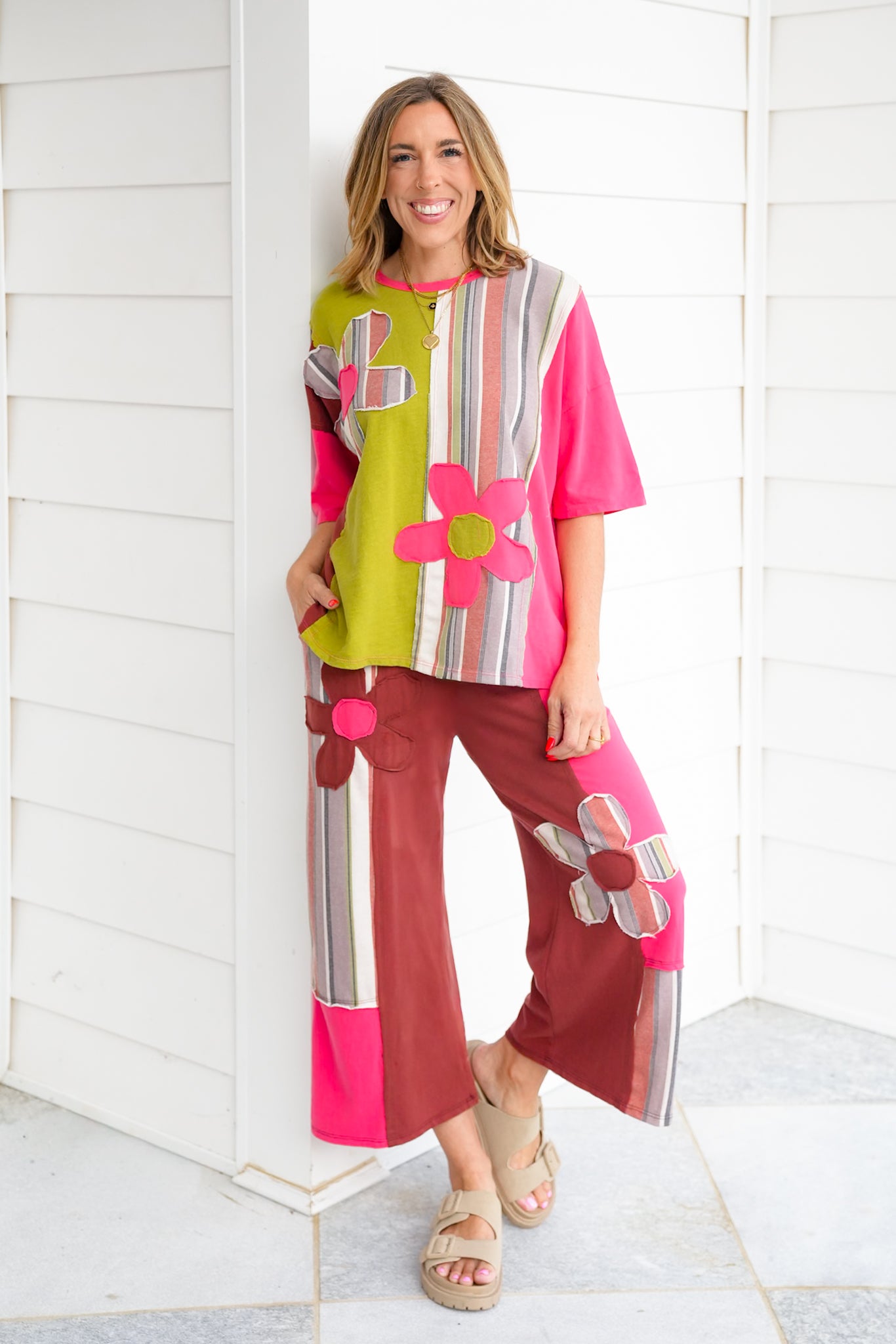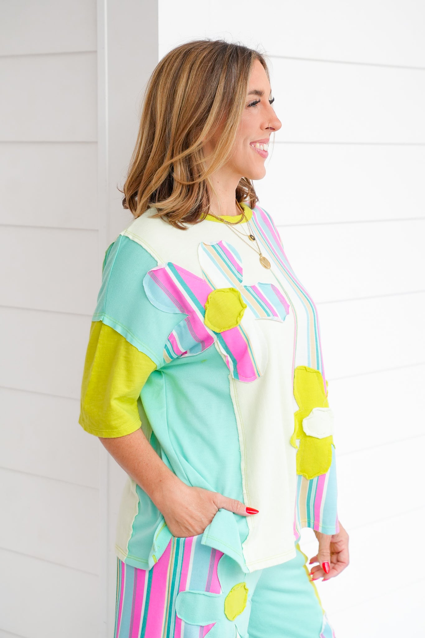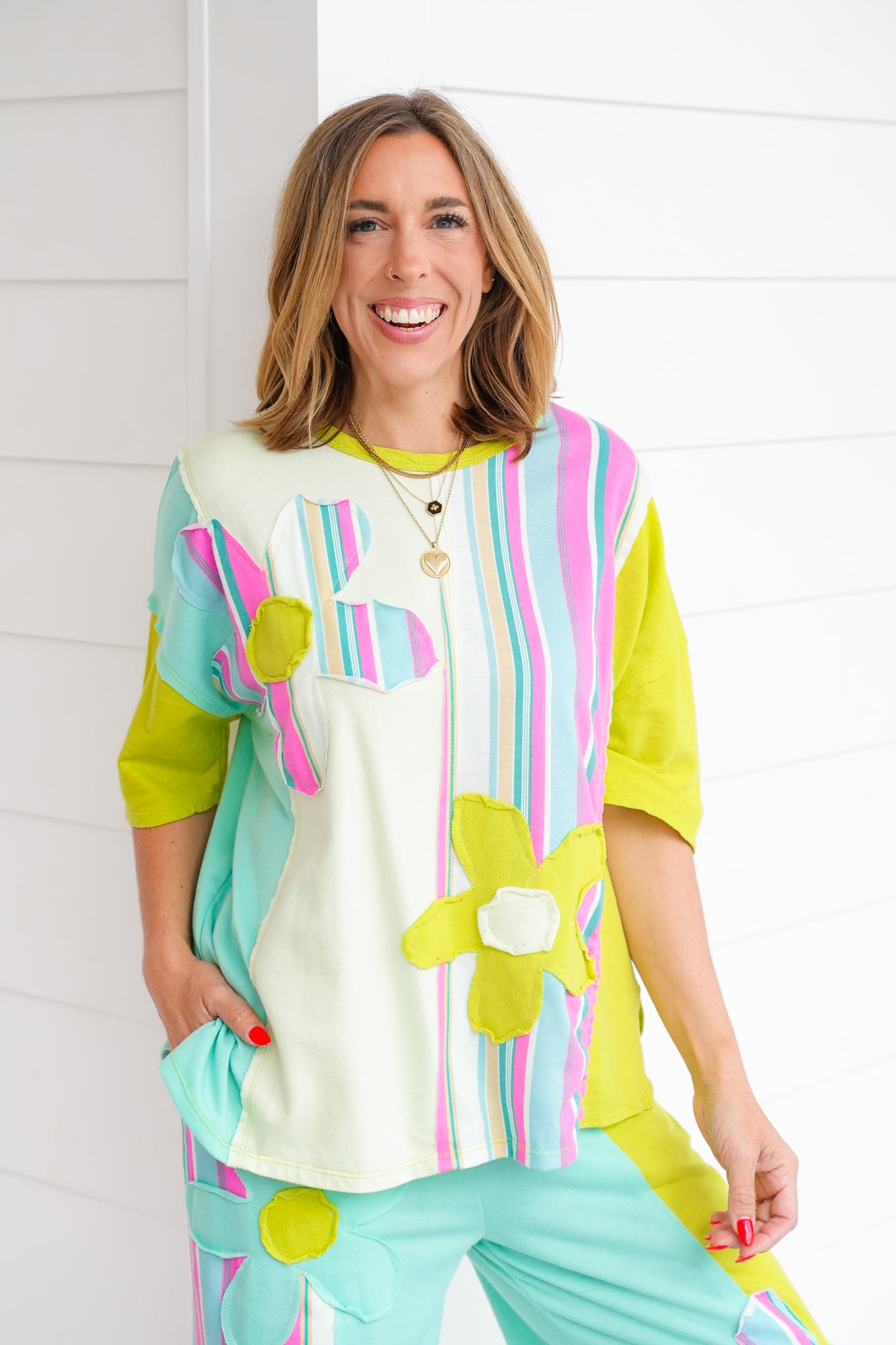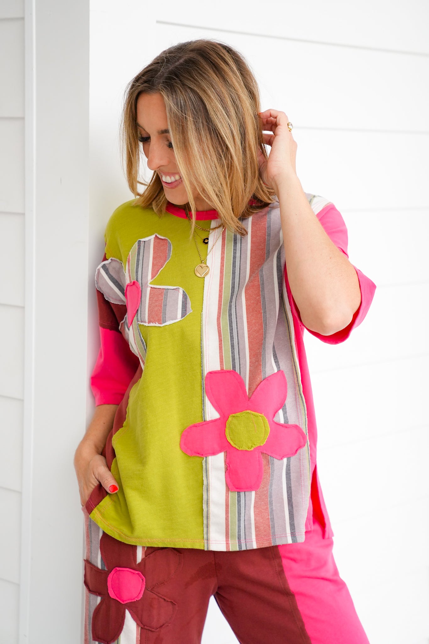 This top is all about carefree fun with a boutique twist. The oversized fit drapes casually, while the colorful flower patches bring a retro-inspired charm that makes every outfit feel unique. Pair with the matching striped pants for a bold head-to-toe set, or wear with cutoffs and sandals for an easy summer look.