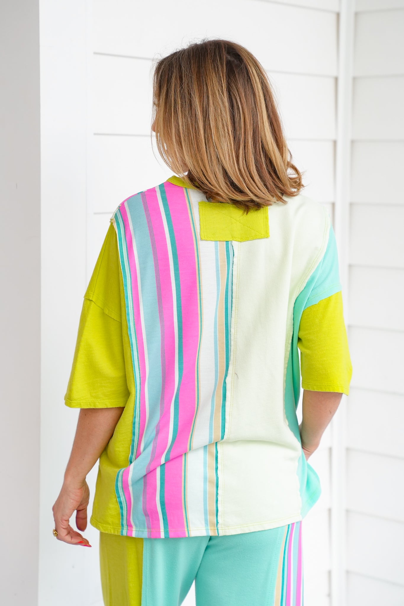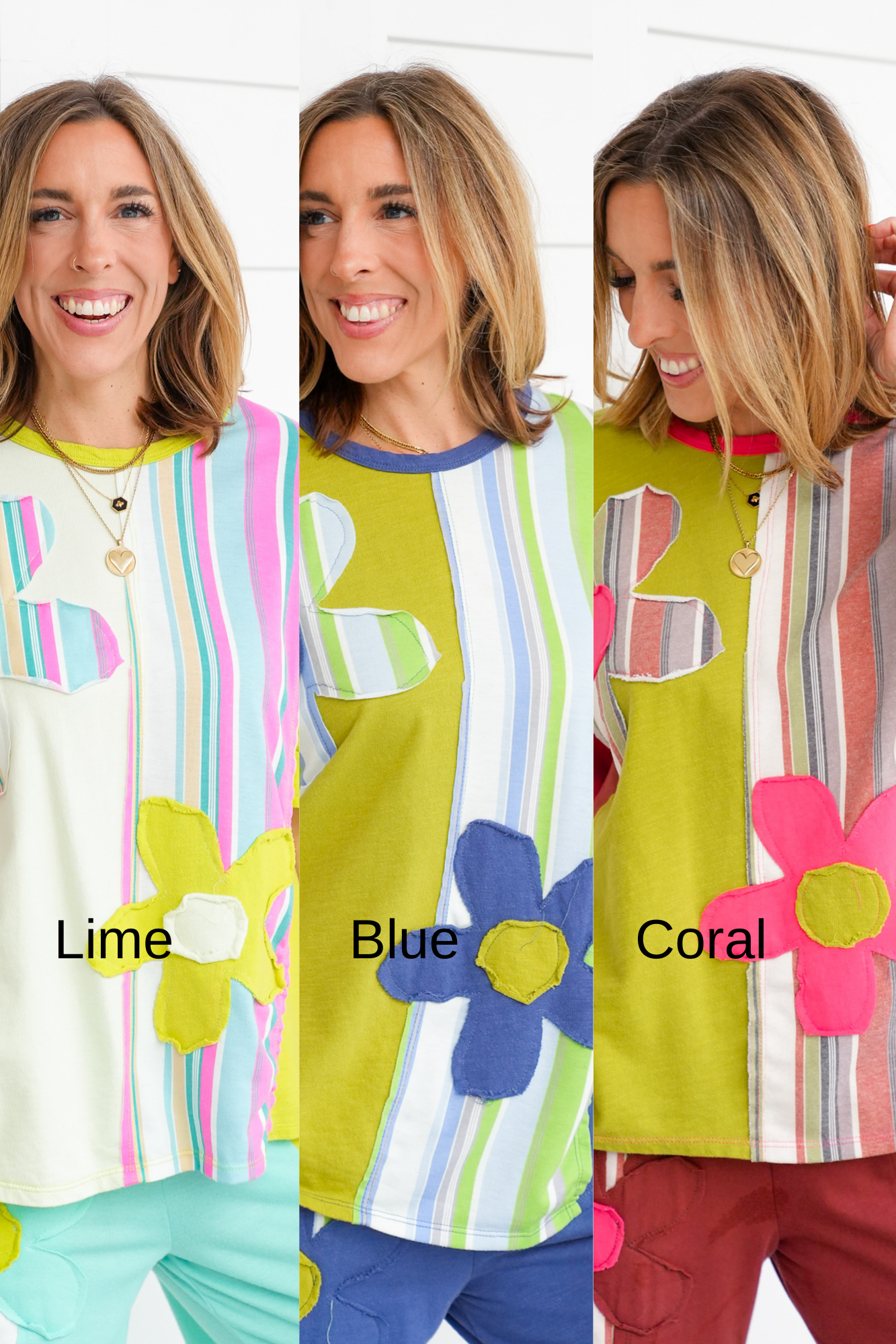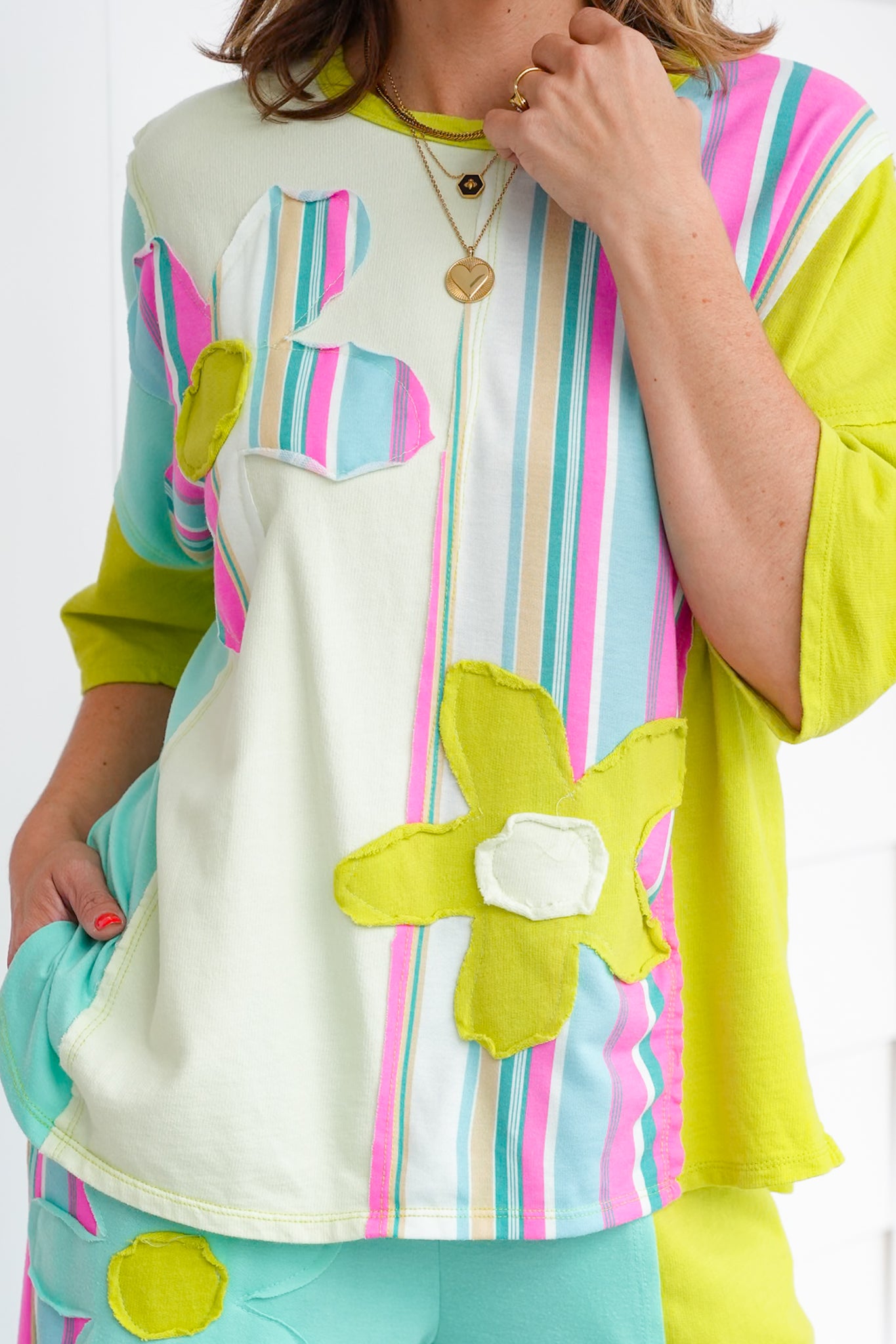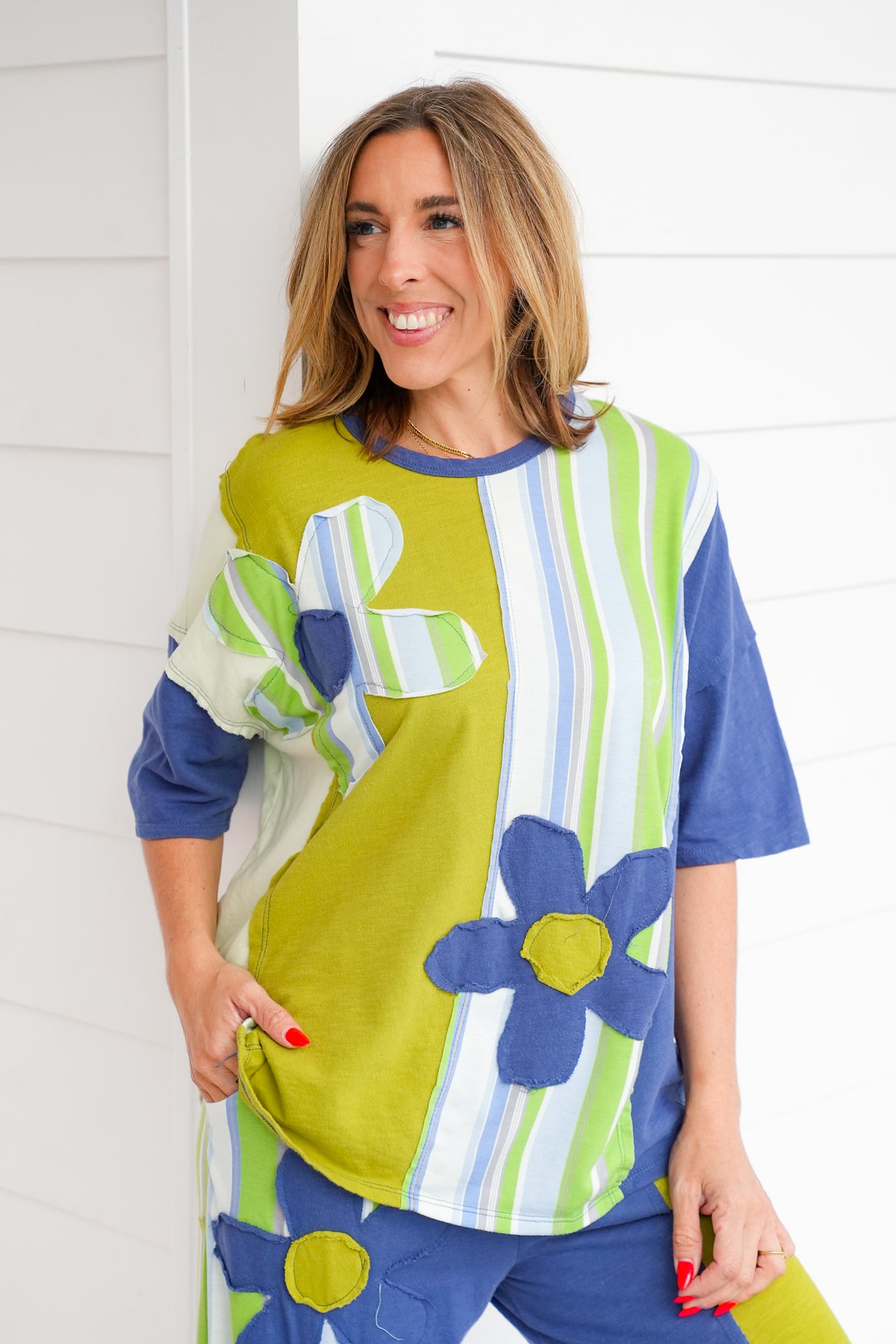 This top is all about carefree fun with a boutique twist. The oversized fit drapes casually, while the colorful flower patches bring a retro-inspired charm that makes every outfit feel unique. Pair with the matching striped pants for a bold head-to-toe set, or wear with cutoffs and sandals for an easy summer look.