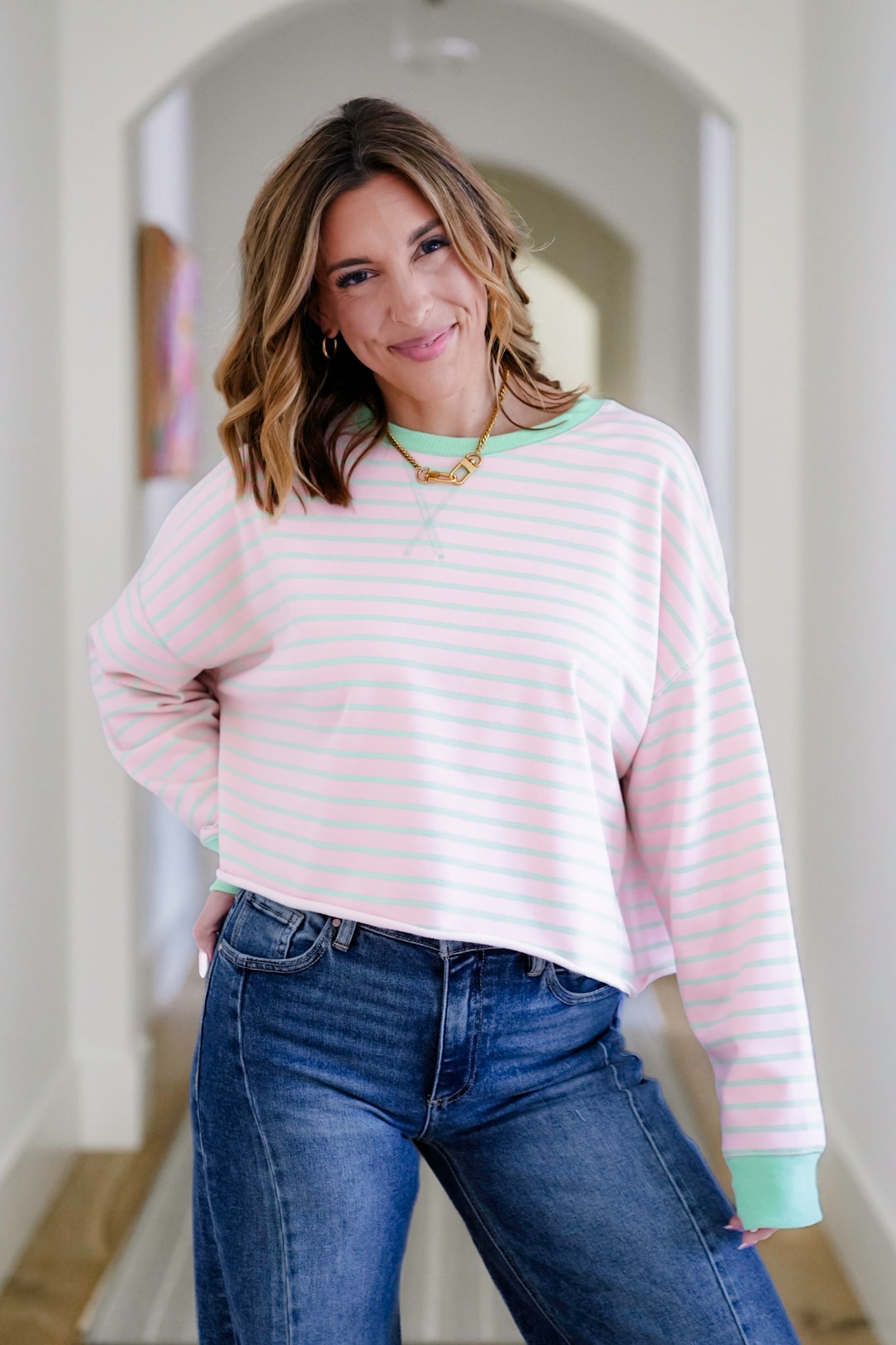 This pullover is all about effortless style with a little personality. The striped French terry fabric feels soft and relaxed, while the cropped, boxy silhouette keeps things fresh and on-trend. Finished with rolled hems and contrast accents, it’s the kind of top that adds instant charm to denim, joggers, or layered looks without trying too hard.